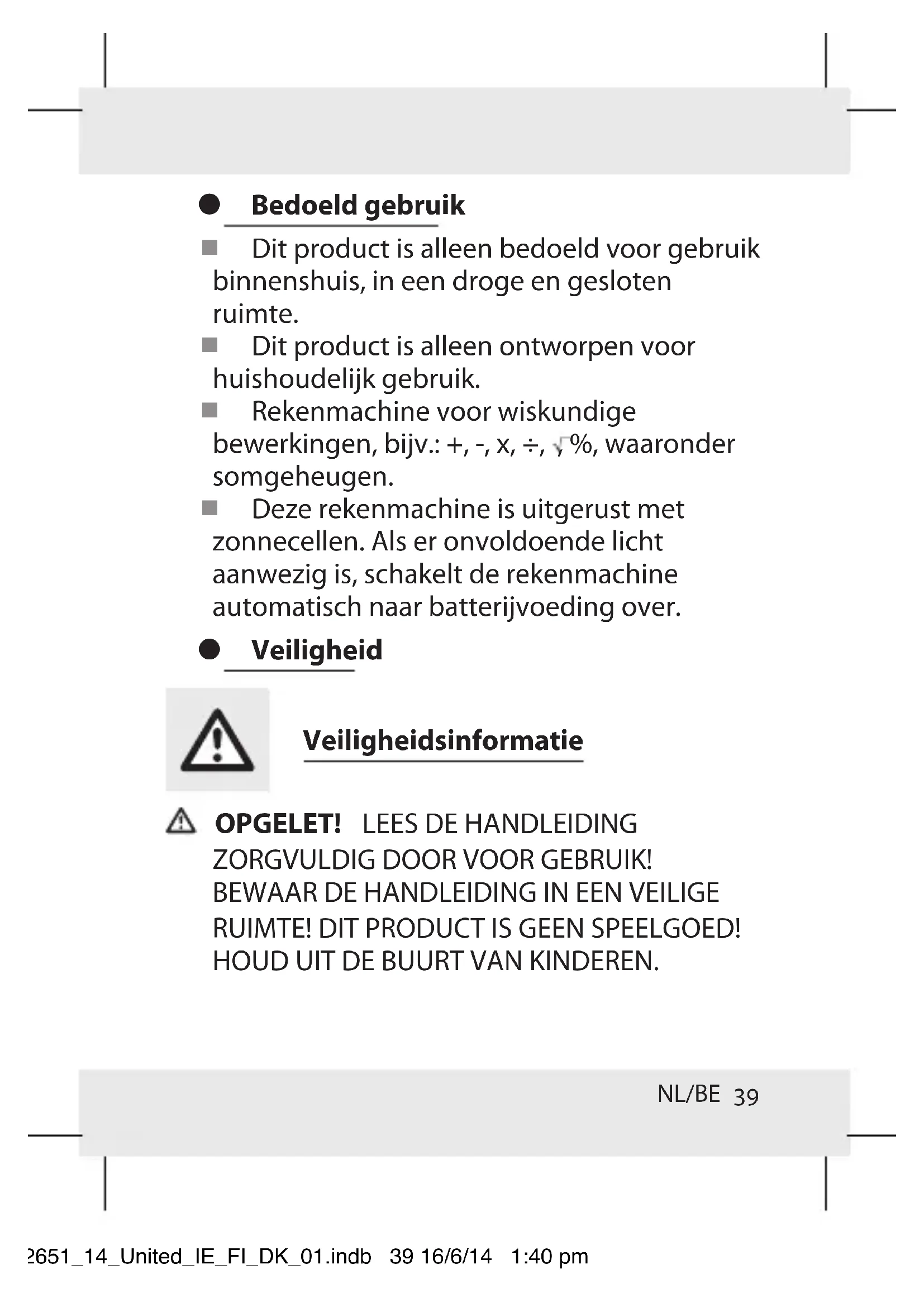 Cijfertoetsen Functiet oets Geheugen plus (telt de weergegeven waarde aan het onafhankelijk geheugen op) Geheugen min (trekt de weergegeven waarde van het onafhankelijk geheugen af) Geheugen oproepen Geheugen wissen Vierkantswortel toets Percentage toets Verhogen 102651_14_United_IE_FI_DK_01.indb 42 16/6/14 1:40 pm43 NL/BE Snelle “0” invoer (druk eenmaal om twee nullen in te voeren) Naar rechts toets (verschuift de weergegeven waarde naar rechts waardoor het laatste cijfer aan de rechterzijde wordt verwijderd) Schakelfuncties TAB-A Decimale modus selecteren F: Drijvende komma 5/4: Afronding (CUT): Naar beneden afronden LC-display M: Geheugen - (min): Negatieve waarde “ERROR”: Het woord “E” verschijnt in het display wanneer het resultaat meer cijfers bevat dan dat het display kan tonen. 102651_14_United_IE_FI_DK_01.indb 43 16/6/14 1:40 pm44 NL/BE Druk op om het “E” bericht te wissen. De waarde wordt in het geheugen (M) bewaard. Probleemoplossing Dit apparaat is uitgerust met delicate elektronische componenten. Dit betekent dat storing zich kan voordoen als het apparaat in de buurt van een voorwerp wordt geplaatst dat radiosignalen uitzendt. Als storing zich voordoet, plaats dergelijke voorwerpen op een grotere afstand. Elektrostatische ontlading kan tot functionele fouten leiden. Als een functionele fout zich voordoet, haal de batterij gedurende een korte periode uit en installeer vervolgens opnieuw (zie g. A). Reiniging en onderhoud Maak het artikel alleen schoon met een droge, pluisvrije doek. 102651_14_United_IE_FI_DK_01.indb 44 16/6/14 1:40 pm45 NL/BE Verwijdering De verpakking bestaat uit milieuvriendelijke grondstoen die U via de plaatselijke recyclecontainers kunt afvoeren. Informatie over de mogelijkheden om het uitgediende artikel na gebruik af te voeren, verstrekt uw gemeentelijke overheid. Gooi het produkt als U het niet meer gebruikt met het oog op milieu- bescherming niet bij het huisvuil, maar verwijder het deskundig. Over afgifteplaatsen en hun openingstijden kunt U zich bij uw aangewezen instantie informeren. Defecte of verbruikte batterijen moeten volgens de richtlijn 2006 / 66 / EC worden gerecycled. Geef batterijen en / of het apparaat af bij de daarvoor bestemde verzamelstations. (zie g. A). 102651_14_United_IE_FI_DK_01.indb 45 16/6/14 1:40 pm46 NL/BE Milieuschade door verkeerde afvoer van batterijen! Batterijen mogen niet via het huisafval worden afgevoerd. Ze kunnen giftig zwaar metaal bevatten en moeten worden behandeld als gevaarlijk afval. De chemische symbolen van de zware metalen zijn als volgt: Cd = cadmium, Hg = kwikzilver, Pb = lood. Geef verbruikte batterijen daarom af bij een gemeentelijk inzamelpunt. 102651_14_United_IE_FI_DK_01.indb 46 16/6/14 1:40 pm47 DE/AT/CH Bestimmungsgemäße Verwendung ¾ Dieses Produkt ist ausschließlich für die Nutzung im Haus, bei trockenen Umgebungsbedingungen, geeignet. ¾ Dieses Produkt wurde für die ausschließliche Nutzung in privaten Haushalten entworfen. ¾ Rechner für mathematische Funktionen z.B.: +, -, x, ÷, , %, inklusive Summenspeicher. ¾ Dieser Rechner verfügt über Solarzellen. Bei unzureichendem Lichteinfall schaltet er automatisch auf Batteriebetrieb um. Sicherheit Sicherheitshinweise