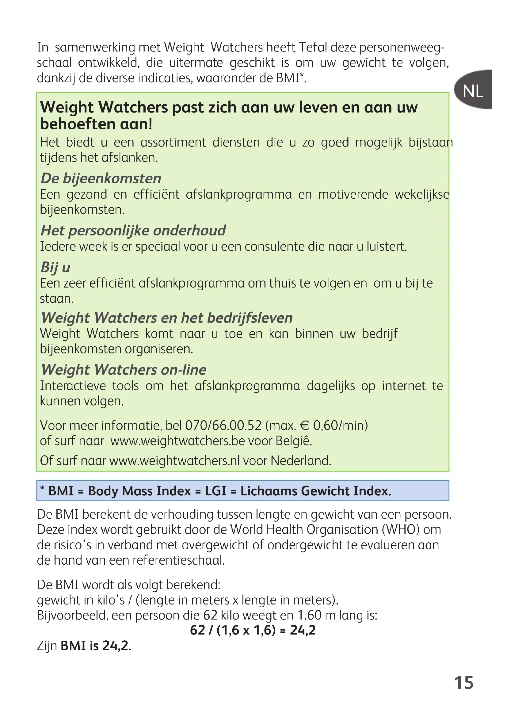 In samenwerking met Weight Watchers heeft Tefal deze personenweeg- schaal ontwikkeld, die uitermate geschikt is om uw gewicht te volgen, dankzij de diverse indicaties, waaronder de BMI*. Weight Watchers past zich aan uw leven en aan uw behoeften aan! Het biedt u een assortiment diensten die u zo goed mogelijk bijstaan tijdens het afslanken. De bijeenkomsten Een gezond en efficiënt afslankprogramma en motiverende wekelijkse bijeenkomsten. Het persoonlijke onderhoud Iedere week is er speciaal voor u een consulente die naar u luistert. Bij u Een zeer efficiënt afslankprogramma om thuis te volgen en om u bij te staan. Weight Watchers en het bedrijfsleven Weight Watchers komt naar u toe en kan binnen uw bedrijf bijeenkomsten organiseren. Weight Watchers on-line Interactieve tools om het afslankprogramma dagelijks op internet te kunnen volgen. Voor meer informatie, bel 070/66.00.52 (max. € 0,60/min) of surf naar www.weightwatchers.be voor Belgiê. Of surf naar www.weightwatchers.nl voor Nederland.