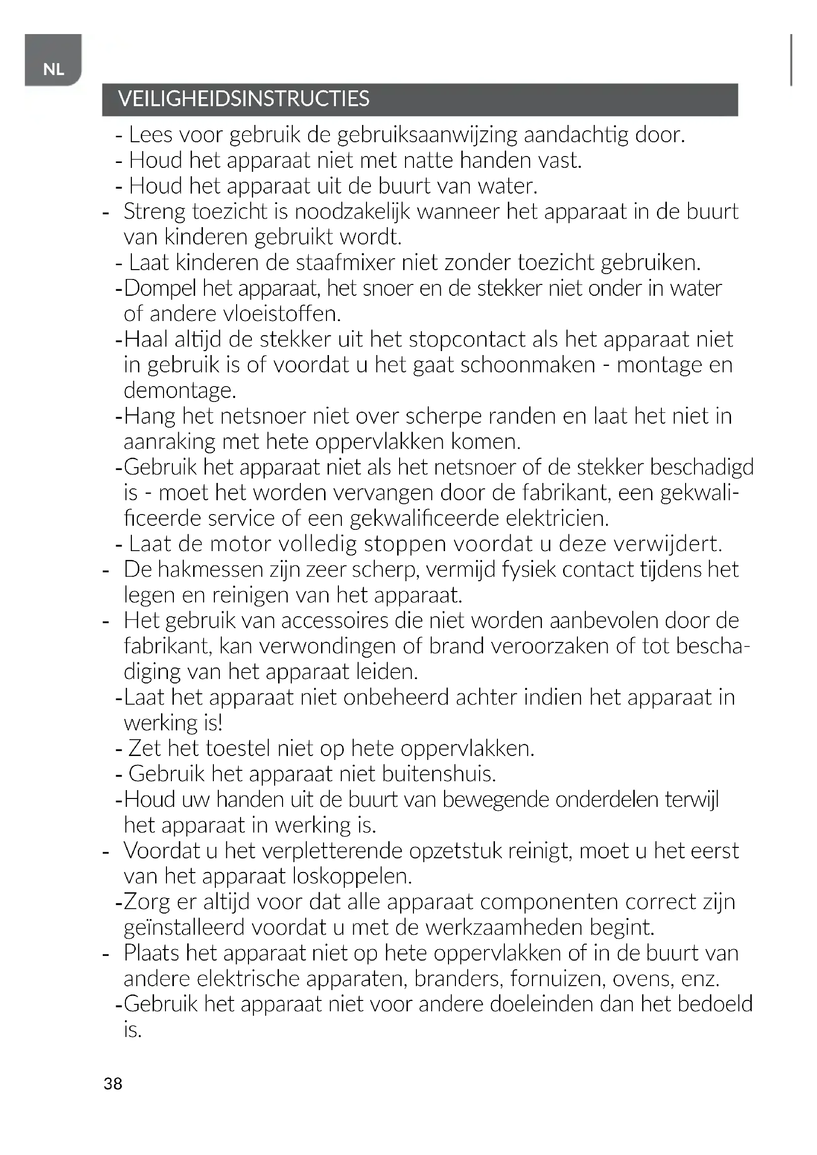 VEILIGHEIDSINSTRUCTIES - Lees voor gebruik de gebruiksaanwijzing aandachg door. - Houd het apparaat niet met natte handen vast. - Houd het apparaat uit de buurt van water. - Streng toezicht is noodzakelijk wanneer het apparaat in de buurt van kinderen gebruikt wordt. - Laat kinderen de staafmixer niet zonder toezicht gebruiken.