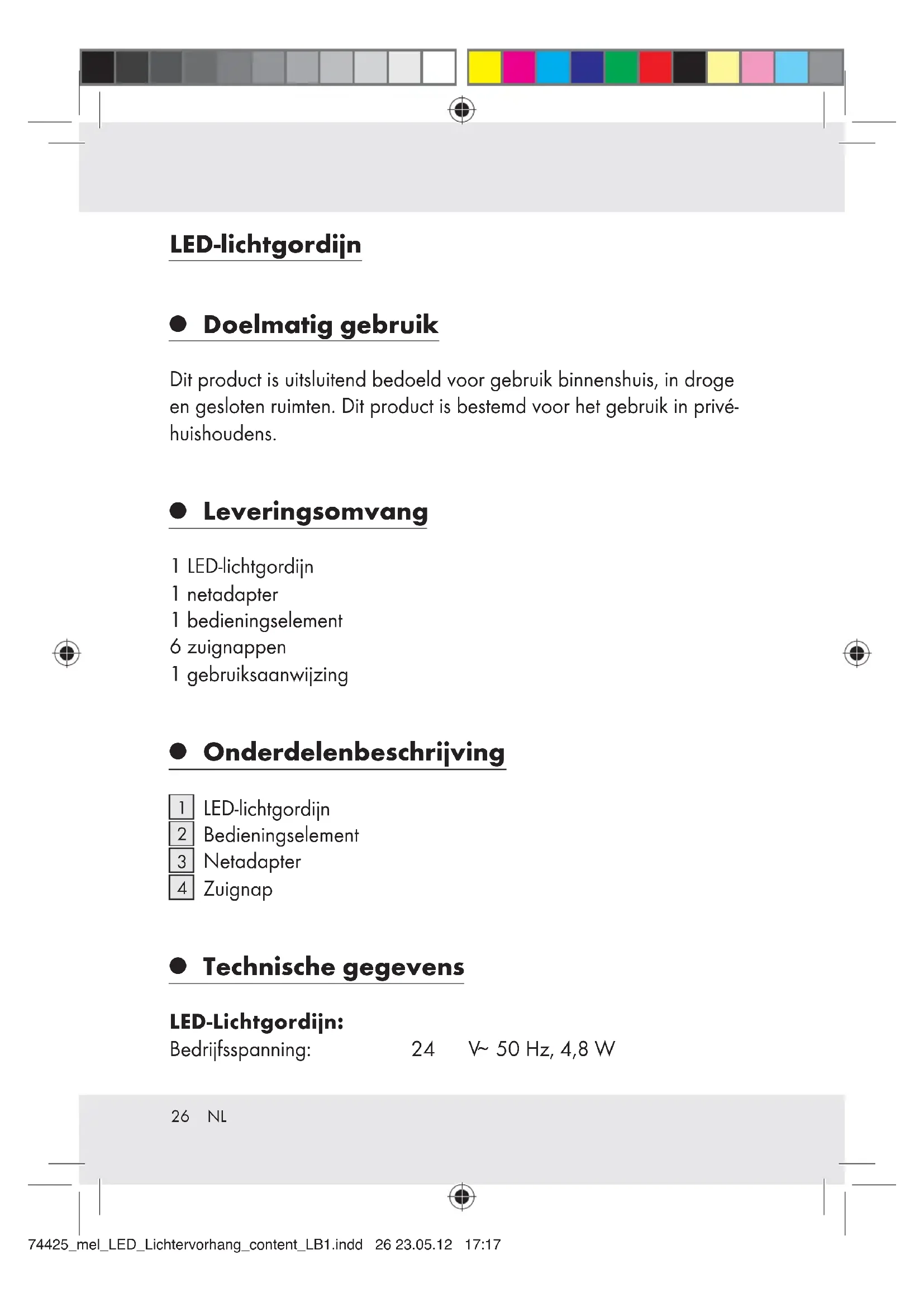 Doelmatig gebruik Dit product is uitsluitend bedoeld voor gebruik binnenshuis, in droge en gesloten ruimten. Dit product is bestemd voor het gebruik in privé- huishoudens.