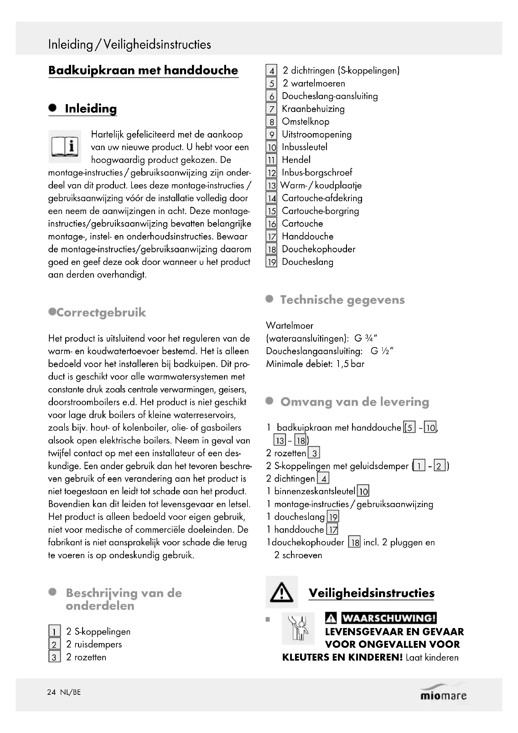 SCHOKKEN! Ondichtheden of waterlekkages kunnen tot levensge- vaar door elektrische schokken leiden. Contro- leer alle verbindingen zorgvuldig op dichtheid. Waarborg bovendien dat alle leidingen van elektrische apparaten correct en veilig geïnstal- leerd zijn. VOORZICHTIG! GEVAAR VOOR LETSEL! Waarborg dat alle onderdelen intact en des- kundig gemonteerd zijn. Bij ondeskundige montage bestaat gevaar voor letsel. Houd er rekening mee dat de onderlegschijven en de afdichtingen aan slijtage onderhevig zijn en regelmatig moeten worden vervangen. Bescha- digde onderdelen kunnen de veiligheid en de werking beïnvloeden. VOORZICHTIG! MATERIËLE SCHADE! Laat de montage alléén door een vakkundige persoon uitvoeren. Let op dat alle afdichtingen correct gemonteerd zijn. GEVAAR VOOR BRANDWONDEN! Let er bij de warmwaterinstelling op dat u de watertemperatuur niet te heet instelt. VOORZICHTIG! Zorg ervoor, dat het warm- / koudwaterplaatje