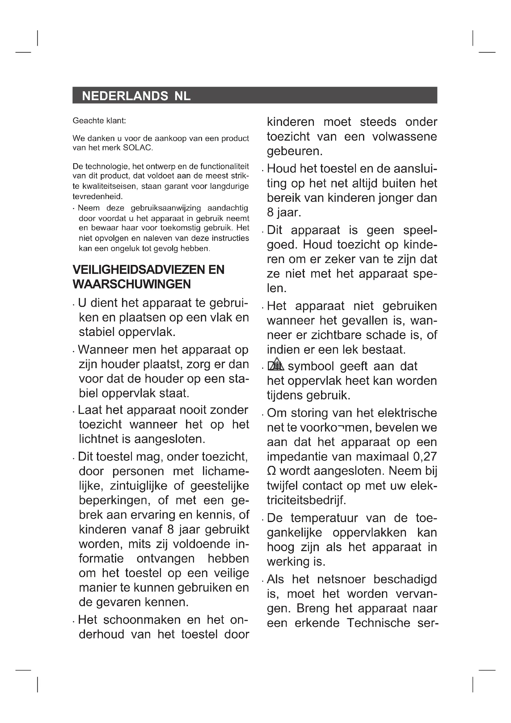 ONDERSTEUNING Dit product valt onder de legale garantie- voorwaarden zoals bepaald in de actuele wetge- ving. Om een beroep te doen op uw rechten of aanspraken kunt u contact opnemen met onze ofciële technische service. U kunt de dichtstbijzijnde technische service vin- den op de website: http://solac.com Voor verdere informatie kunt u ook contact met ons opnemen. U kunt deze gebruiksaanwijzing en eventuele actualiseringen ervan downloaden via http://so- lac.com