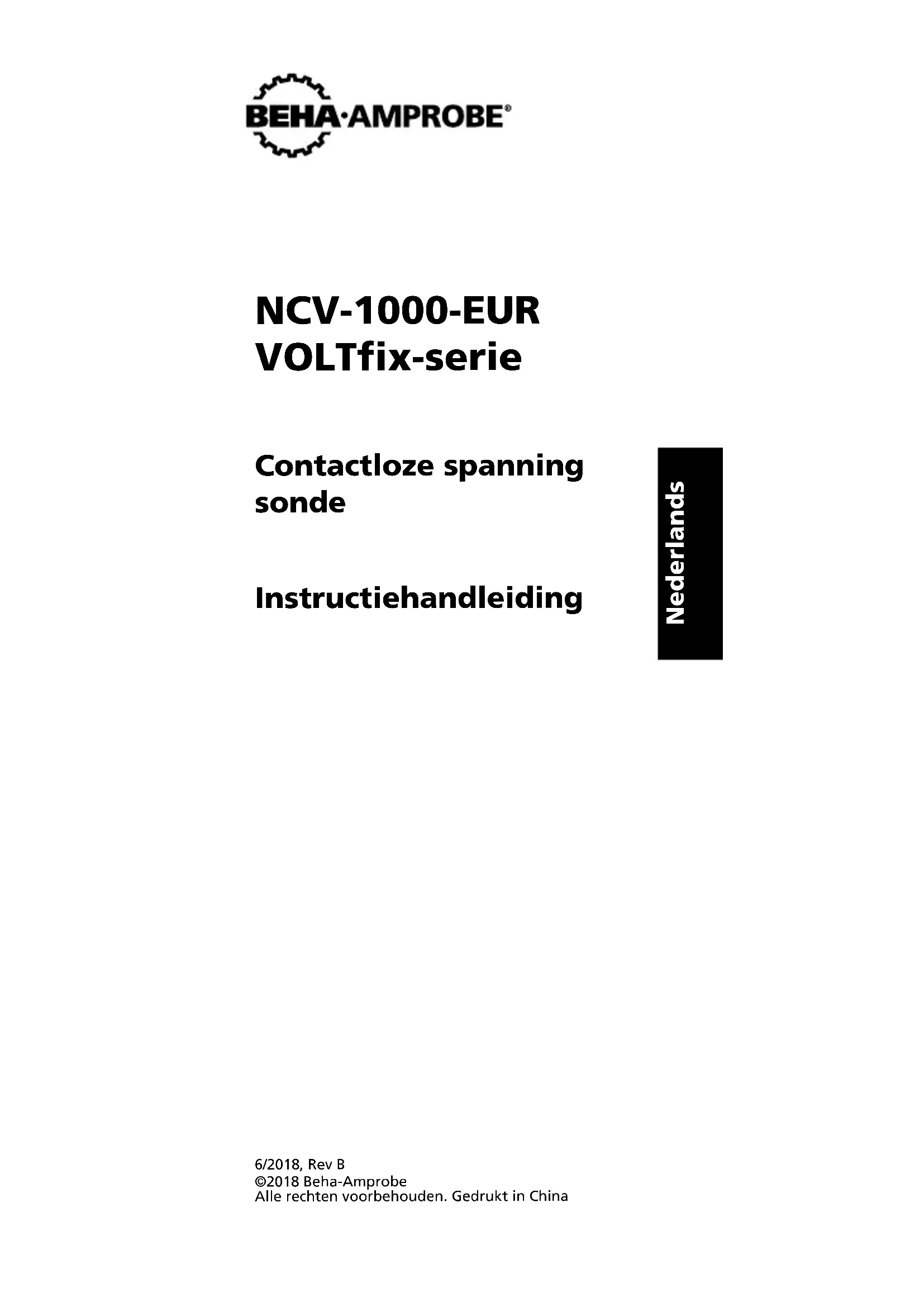Czyszczenie Sondę napięcia można czyścić łagodnym roztworem namydlonej wody. Należy lekko wytrzeć miękką szmatką i przed użyciem zaczekać na całkowite wyschnięcie. Do czyszczenia nie należy używać węglowodorów aromatycznych, benzyny lub rozpuszczalników zawierających chlor.NCV-1000-EUR VOLTfix-serie Contactloze spanning sonde Instructiehandleiding 6/2018, Rev B ©2018 Beha-Amprobe Alle rechten voorbehouden. Gedrukt in China NederlandsBeperkte garantie en beperking van aansprakelijkheid Uw Beha-Amprobe-product is vrij van defecten in materiaal en fabricage gedurende één jaar vanaf de aankoopdatum behalve wanneer de plaatselijke wetgeving anders vereist. Deze garantie dekt geen zekeringen, wegwerpbatterijen of schade door ongelukken, verwaarlozing, misbruik, verandering, vervuiling, of abnormale gebruiksomstandigheden. Wederverkopers zijn niet geautoriseerd tot het verlengen van andere garanties namens Beha-Amprobe. Om tijdens de garantieperiode service te verkrijgen, moet u het product met aankoopbewijs terugsturen naar een geautoriseerd Beha-Amprobe Service Center of naar een dealer of distributeur van Beha-Amprobe. Zie de reparatiesectie voor details. DEZE GARANTIE IS UW ENIGE REMEDIE. ALLE ANDERE GARANTIES - ZIJ HET UITDRUKKELIJK, IMPLICIET OF WETTELIJK - INCLUSIEF IMPLICIETE GARANTIE VOOR GESCHIKTHEID VOOR EEN BEPAALD DOEL OF