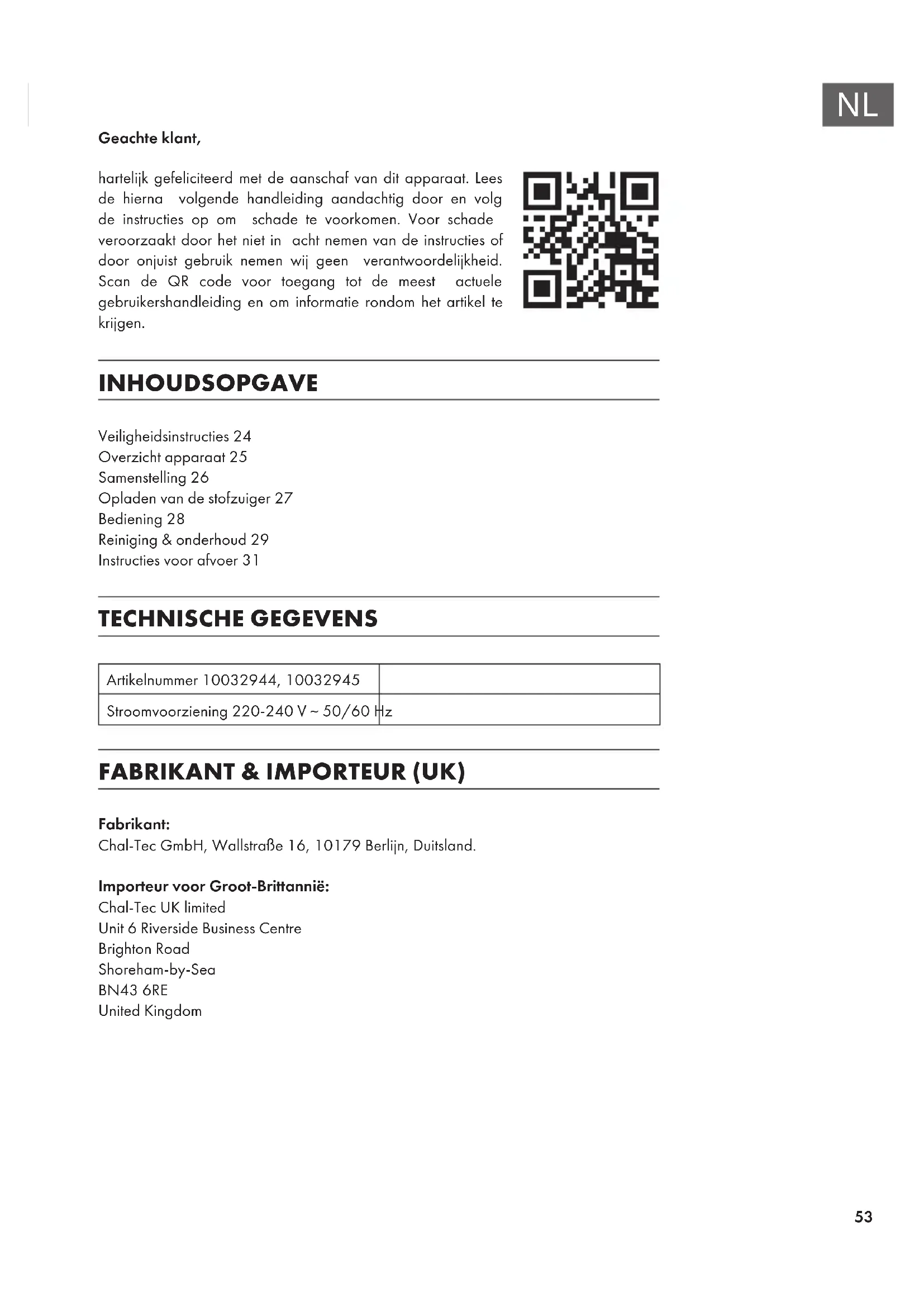 Geachte klant, hartelijk gefeliciteerd met de aanschaf van dit apparaat. Lees de hierna volgende handleiding aandachtig door en volg de instructies op om schade te voorkomen. Voor schade veroorzaakt door het niet in acht nemen van de instructies of door onjuist gebruik nemen wij geen verantwoordelijkheid. Scan de QR code voor toegang tot de meest actuele gebruikershandleiding en om informatie rondom het artikel te krijgen. INHOUDSOPGAVE Veiligheidsinstructies 24 Overzicht apparaat 25 Samenstelling 26 Opladen van de stofzuiger 27 Bediening 28 Reiniging & onderhoud 29 Instructies voor afvoer 31 TECHNISCHE GEGEVENS Artikelnummer 10032944, 10032945 Stroomvoorziening 220-240 V ~ 50/60 Hz FABRIKANT & IMPORTEUR (UK) Fabrikant: Chal-Tec GmbH, Wallstraße 16, 10179 Berlijn, Duitsland. Importeur voor Groot-Brittannië: Chal-Tec UK limited Unit 6 Riverside Business Centre Brighton Road Shoreham-by-Sea BN43 6RE United Kingdom54