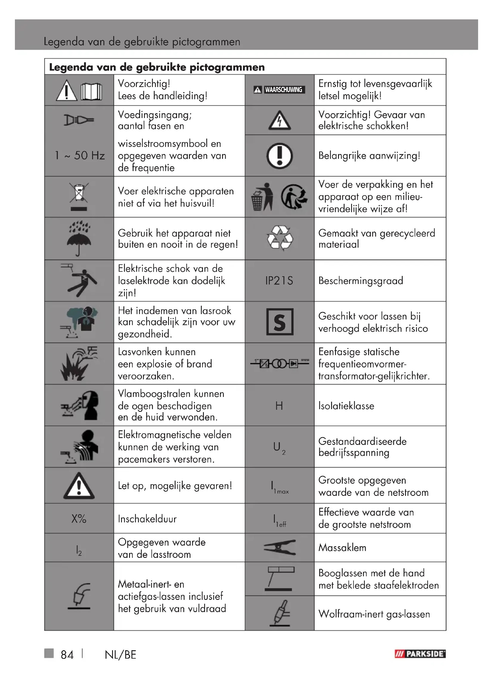 WAARSCHUWING Houd de verpakkingsmaterialen uit de buurt van kleine kinderen. Er bestaat verstikkingsgevaar! Dit apparaat kan door kinde- ren vanaf 16 jaar alsmede door personen met vermin- derde fysieke, sensorische of mentale vaardigheden of een gebrek aan ervaring en kennis worden gebruikt, als zij onder toezicht staan of geïnstrueerd werden met betrekking tot het veilige gebruik van het appa- raat en ze de hieruit voort- vloeiende gevaren begrijpen. Kinderen mogen niet met het apparaat spelen. Reiniging en onderhoud mogen niet door kinderen worden uitgevoerd zonder dat er toezicht op hen wordt gehouden. Laat reparaties en/of onder- houdswerkzaamheden alleen door gekwalificeerde elektri- ciens uitvoeren. Gebruik alleen de meegele- verde laskabels. Het apparaat mag tijdens het gebruik niet direct tegen de wand staan, niet worden afge- dekt of tussen andere apparaten geklemd, zodat altijd voldoende lucht door de luchtsleuven kan worden opgenomen. Controleer of het apparaat juist op de netspanning is aangesloten. Vermijd trekspanning van de netwerkkabels. Trek de stroom- stekker uit het stopcontact, voordat u het apparaat op een andere plaats opstelt. Wanneer het apparaat niet wordt gebruikt, schakelt u het altijd uit met de AAN-/ UIT-schakelaar. Leg de elektro- denhouder op een geïsoleerde ondergrond en neem de elektroden pas na 15 minuten afkoeling uit de houder. Inleiding / Veiligheidsaanwijzingen89NL/BE Let op de staat van de laska- bels, de elektrodenhouder en de massaklemmen. Slijtage aan de isolering en aan de stroom- voerende delen kan gevaarlijk zijn en de kwaliteit van de las- werkzaamheden verminderen. Booglassen produceert vonken, gesmolten metalen deeltjes en rook. Let daarom op: Verwijder alle brandbare substanties en/of materialen uit de werkplek en uit de onmiddellijke omgeving. Zorg voor ventilatie van de werkplek. Las niet op containers, vaten of buizen die brandbare vloeistof- fen of gassen bevatten of bevat hebben. WAARSCHUWING Vermijd elk direct contact met het elektri- sche lascircuit. De nullastspan- ning tussen elektrodetang en massaklem kan gevaarlijk zijn, er bestaat het gevaar van een elektrische schok. Berg het apparaat niet op in een vochtige of natte omge- ving of in de regen. Hier geldt de beschermingsklasse IP21S. Bescherm de ogen met de daarvoor bedoelde beschermende glazen (DIN graad9-10), die u op het mee- geleverde lasscherm bevestigt. Draag handschoenen en droge beschermende kleding, die vrij is van olie en vet, om de huid te beschermen tegen de ultraviolette stralen van de vlamboog. WAARSCHUWING Gebruik de lasstroombron niet om leidin- gen te ontdooien. Let op: De straling van de vlamboog kan de ogen beschadigen en verbranding van de huid veroorzaken. Booglassen produceert vonken en druppels gesmolten metaal, het gelaste werkstuk begint te gloeien en blijft relatief lang zeer heet. Raak het werkstuk daarom niet met blote handen aan. Bij booglassen komen dampen vrij die schadelijk zijn voor de gezondheid. Zorg ervoor dat u deze indien mogelijk niet inademt. Bescherm uzelf tegen de gevaarlijke gevolgen van booglassen en houd personen die niet bij het werk betrokken Veiligheidsaanwijzingen90 NL/BE zijn, op een afstand van min- stens 2 m van de vlamboog verwijderd. LET OP! Tijdens het gebruik van het lasapparaat kan het, afhanke- lijk van de netspanning aan het aansluitpunt, tot storingen in de stroomvoorziening voor andere verbruikers komen. Neem in geval van twijfel contact op met uw energieleve- rancier. Tijdens het gebruik van het lasapparaat kan het tot functiestoringen van andere apparaten komen, bijv. hoor- apparaten, pacemakers, enz. z Gevarenbronnen bij booglassen Bij booglassen zijn er een reeks gevarenbronnen. Daarom is het voor de lasser bijzonder belang- rijk om de volgende regels in acht te nemen, om zichzelf en anderen niet in gevaar te bren- gen en schadelijke gevolgen voor mens en apparaat te vermijden. Laat de werkzaamheden aan de netspanning, bijv. aan kabels, stekkers, contactdozen enz., alleen door een elektri- cien uitvoeren volgens natio- nale en lokale voorschriften. Koppel bij ongevallen het lasapparaat onmiddellijk los van de stroomvoorziening. Wanneer elektrische contact- spanningen optreden, schakel het apparaat dan onmiddellijk uit en laat het nakijken door een elektricien. Let aan de lasstroomzijde altijd op goede elektrische contacten. Draag tijdens het lassen altijd aan beide handen iso- lerende handschoenen. Die beschermen tegen elektrische schokken (nullastspanning van het elektrische lascircuit), tegen schadelijke stralingen (warmte- en UV-stralen) en tegen gloei- end metaal en spetters. Draag stevige, isolerende schoenen. De schoenen moeten ook isoleren als het nat is. Halve schoenen zijn niet geschikt, omdat vallende, gloeiende metalen druppels brandwonden kunnen veroor- zaken. Draag geschikte bescher- mende kledij, geen syntheti- sche kledingstukken. Kijk niet met onbeschermde ogen in de vlamboog, gebruik Veiligheidsaanwijzingen91NL/BE alleen een lassers-lasscherm met goedgekeurd bescherm- glas volgens DIN. De vlam- boog geeft behalve licht- en warmtestralen, die verblinding resp. verbranding veroorza- ken, ook UV-stralen af. Deze onzichtbare ultraviolette stralen veroorzaken bij onvoldoende bescherming zeer pijnlijke bindvliesontsteking die pas enkele uren later wordt opge- merkt. Daarnaast veroorzaken UV-stralen op onbeschermde lichaamsdelen verbrandingen zoals bij zonnebrand. Ook personen of assistenten die zich in de buurt van de vlam- boog bevinden, moeten op de gevaren worden gewezen en met de nodige beschermende middelen zijn uitgerust. Stel, indien nodig, schermen op. Tijdens lassen, vooral in kleine ruimtes, dient voor voldoende toevoer van frisse lucht te wor- den gezorgd, omdat rook en schadelijke gassen ontstaan. Aan containers waarin gassen, brandstoffen, minerale oliën of dergelijke worden opgeslagen, mogen – ook wanneer ze reeds lang geleden werden leeggemaakt – geen laswerk- zaamheden worden uit