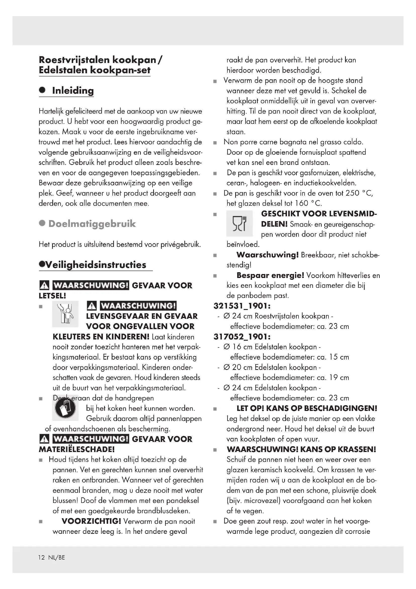 DELEN! Smaak- en geureigenschap- pen worden door dit product niet beïnvloed. Waarschuwing! Breekbaar, niet schokbe- stendig! Bespaar energie! Voorkom hitteverlies en kies een kookplaat met een diameter die bij de panbodem past. 321531_1901: - Ø 24 cm Roestvrijstalen kookpan - effectieve bodemdiameter: ca. 23 cm 317052_1901: - Ø 16 cm Edelstalen kookpan - effectieve bodemdiameter: ca. 15 cm - Ø 20 cm Edelstalen kookpan - effectieve bodemdiameter: ca. 19 cm - Ø 24 cm Edelstalen kookpan - effectieve bodemdiameter: ca. 23 cm LET OP! KANS OP BESCHADIGINGEN! Leg het deksel op de juiste manier op een vlakke ondergrond neer. Houd het deksel uit de buurt van kookplaten of open vuur. WAARSCHUWING! KANS OP KRASSEN! Schuif de pannen niet heen en weer over een glazen keramisch kookveld. Om krassen te ver- mijden raden wij u aan de kookplaat en de bo- dem van de pan met een schone, pluisvrije doek (bijv. microvezel) voorafgaand aan het koken af te vegen. Doe geen zout resp. zout water in het voorge- warmde lege product, aangezien dit corrosie 317052_321531_ern_Topfset_content_OS.indd 12 04.06.19 14:4313 NL/BE kan veroorzaken. Er hoeft trouwens geen reke- ning te worden gehouden met een afname van de werking van het product is hierdoor. Het hete product nooit onder stromend koud water houden. De onderkant van het product kan hierdoor beschadigd raken of loslaten van het product.