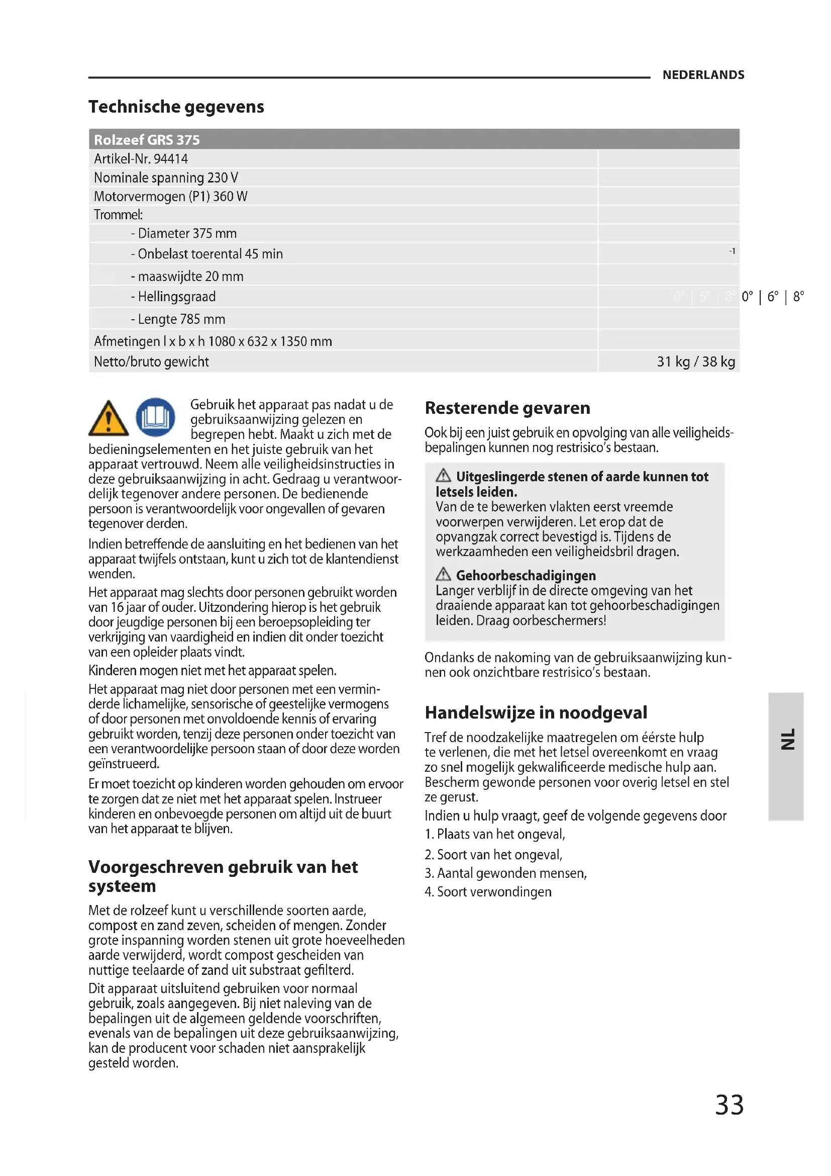 derde lichamelijke, sensorische of geestelijke vermogens of door personen met onvoldoende kennis of ervaring gebruikt worden, tenzij deze personen onder toezicht van een verantwoordelijke persoon staan of door deze worden geïnstrueerd. Er moet toezicht op kinderen worden gehouden om ervoor te zorgen dat ze niet met het apparaat spelen. Instrueer kinderen en onbevoegde personen om altijd uit de buurt van het apparaat te blijven. Voorgeschreven gebruik van het systeem Met de rolzeef kunt u verschillende soorten aarde, compost en zand zeven, scheiden of mengen. Zonder grote inspanning worden stenen uit grote hoeveelheden aarde verwijderd, wordt compost gescheiden van nuttige teelaarde of zand uit substraat gelterd. Dit apparaat uitsluitend gebruiken voor normaal gebruik, zoals aangegeven. Bij niet naleving van de bepalingen uit de algemeen geldende voorschriften, evenals van de bepalingen uit deze gebruiksaanwijzing, kan de producent voor schaden niet aansprakelijk gesteld worden. Resterende gevaren Ook bij een juist gebruik en opvolging van alle veiligheids- bepalingen kunnen nog restrisico’s bestaan. Uitgeslingerde stenen of aarde kunnen tot letsels leiden. Van de te bewerken vlakten eerst vreemde voorwerpen verwijderen. Let erop dat de opvangzak correct bevestigd is. Tijdens de werkzaamheden een veiligheidsbril dragen. Gehoorbeschadigingen Langer verblijf in de directe omgeving van het draaiende apparaat kan tot gehoorbeschadigingen leiden. Draag oorbeschermers! Ondanks de nakoming van de gebruiksaanwijzing kun