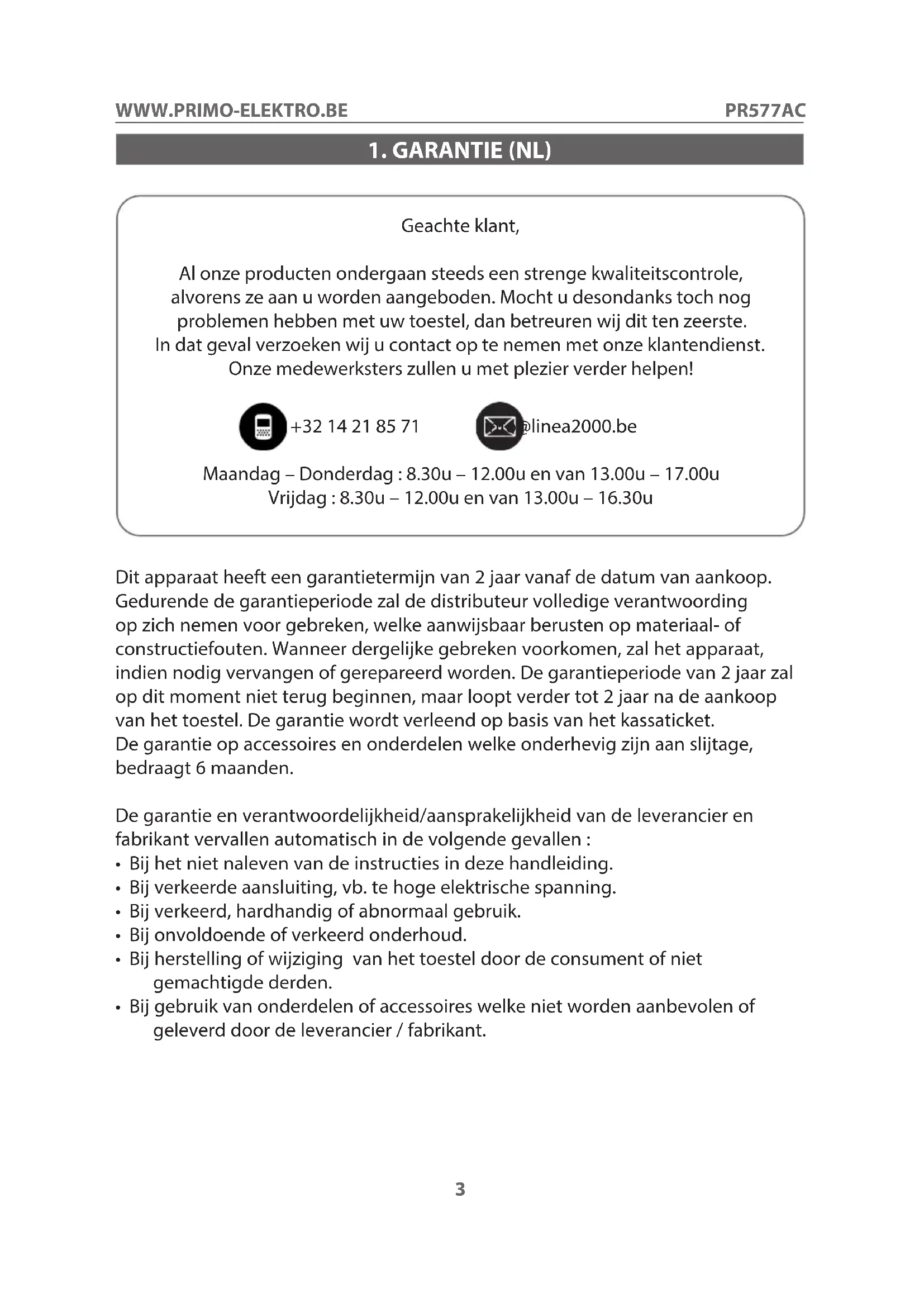 Geachte klant, Al onze producten ondergaan steeds een strenge kwaliteitscontrole, alvorens ze aan u worden aangeboden. Mocht u desondanks toch nog problemen hebben met uw toestel, dan betreuren wij dit ten zeerste. In dat geval verzoeken wij u contact op te nemen met onze klantendienst. Onze medewerksters zullen u met plezier verder helpen! +32 14 21 85 71 info@linea2000.be Maandag – Donderdag : 8.30u – 12.00u en van 13.00u – 17.00u Vrijdag : 8.30u – 12.00u en van 13.00u – 16.30u Dit apparaat heeft een garantietermijn van 2 jaar vanaf de datum van aankoop. Gedurende de garantieperiode zal de distributeur volledige verantwoording op zich nemen voor gebreken, welke aanwijsbaar berusten op materiaal- of constructiefouten. Wanneer dergelijke gebreken voorkomen, zal het apparaat, indien nodig vervangen of gerepareerd worden. De garantieperiode van 2 jaar zal op dit moment niet terug beginnen, maar loopt verder tot 2 jaar na de aankoop van het toestel. De garantie wordt verleend op basis van het kassaticket. De garantie op accessoires en onderdelen welke onderhevig zijn aan slijtage, bedraagt 6 maanden. De garantie en verantwoordelijkheid/aansprakelijkheid van de leverancier en fabrikant vervallen automatisch in de volgende gevallen :