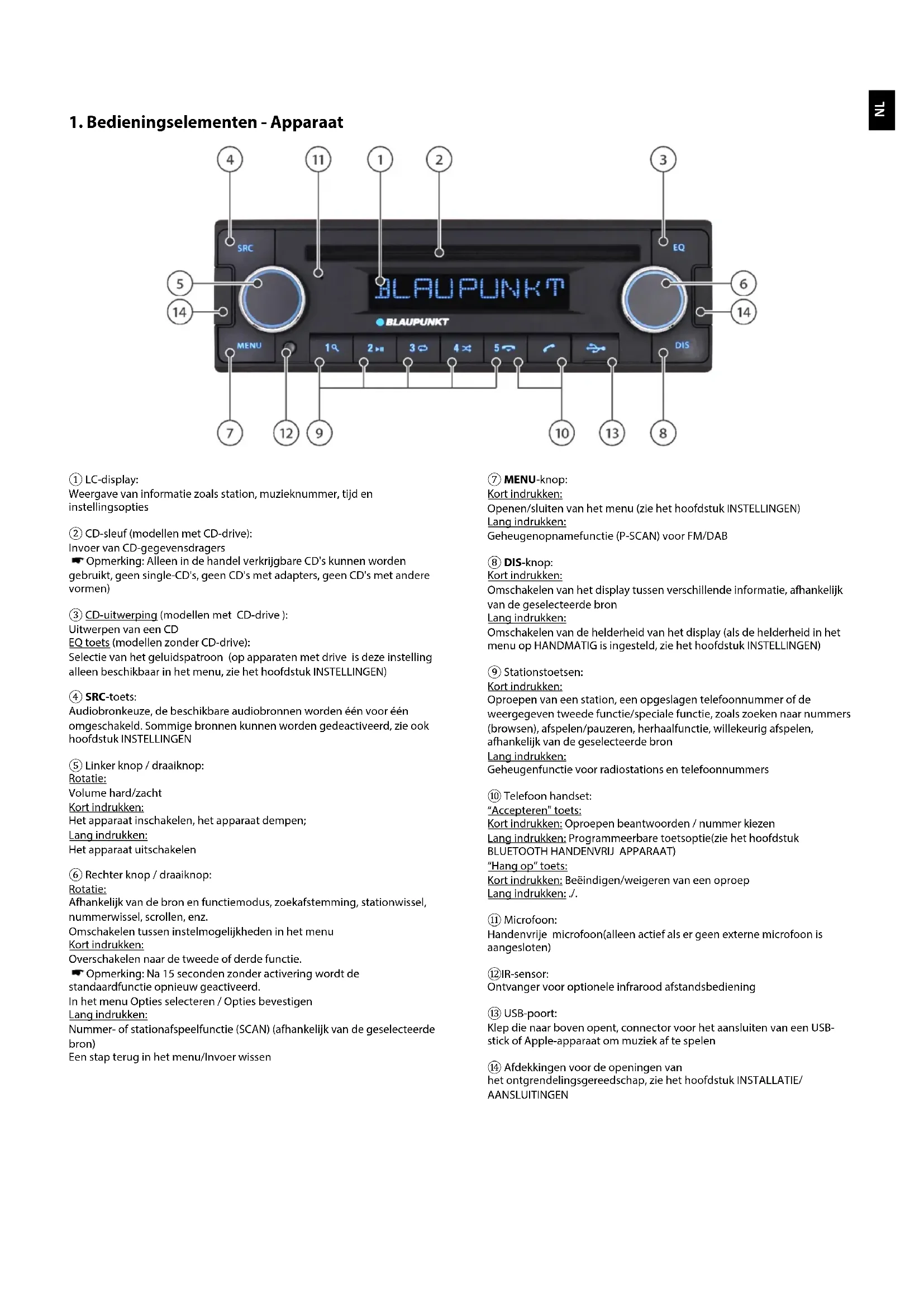 ① LC-display: Weergave van informatie zoals station, muzieknummer, tijd en instellingsopties ② CD-sleuf (modellen met CD-drive): Invoer van CD-gegevensdragers Opmerking: Alleen in de handel verkrijgbare CD's kunnen worden gebruikt, geen single-CD's, geen CD's met adapters, geen CD's met andere vormen) ③ CD-uitwerping (modellen met CD-drive ): Uitwerpen van een CD EQ toets (modellen zonder CD-drive): Selectie van het geluidspatroon (op apparaten met drive is deze instelling alleen beschikbaar in het menu, zie het hoofdstuk INSTELLINGEN) ④ SRC-toets: Audiobronkeuze, de beschikbare audiobronnen worden één voor één omgeschakeld. Sommige bronnen kunnen worden gedeactiveerd, zie ook hoofdstuk INSTELLINGEN ⑤ Linker knop / draaiknop: Rotatie: Volume hard/zacht Kort indrukken: Het apparaat inschakelen, het apparaat dempen; Lang indrukken: Het apparaat uitschakelen ⑥ Rechter knop / draaiknop: Rotatie: Afhankelijk van de bron en functiemodus, zoekafstemming, stationwissel, nummerwissel, scrollen, enz. Omschakelen tussen instelmogelijkheden in het menu Kort indrukken: Overschakelen naar de tweede of derde functie. Opmerking: Na 15 seconden zonder activering wordt de standaardfunctie opnieuw geactiveerd. In het menu Opties selecteren / Opties bevestigen Lang indrukken: Nummer- of stationafspeelfunctie (SCAN) (afhankelijk van de geselecteerde bron) Een stap terug in het menu/Invoer wissen ⑦ MENU-knop: Kort indrukken: Openen/sluiten van het menu (zie het hoofdstuk INSTELLINGEN) Lang indrukken: Geheugenopnamefunctie (P-SCAN) voor FM/DAB ⑧ DIS-knop: Kort indrukken: Omschakelen van het display tussen verschillende informatie, afhankelijk van de geselecteerde bron Lang indrukken: Omschakelen van de helderheid van het display (als de helderheid in het menu op HANDMATIG is ingesteld, zie het hoofdstuk INSTELLINGEN) ⑨ Stationstoetsen: Kort indrukken: Oproepen van een station, een opgeslagen telefoonnummer of de weergegeven tweede functie/speciale functie, zoals zoeken naar nummers (browsen), afspelen/pauzeren, herhaalfunctie, willekeurig afspelen, afhankelijk van de geselecteerde bron Lang indrukken: Geheugenfunctie voor radiostations en telefoonnummers ⑩ Telefoon handset: “Accepteren" toets: Kort indrukken: Oproepen beantwoorden / nummer kiezen Lang indrukken: Programmeerbare toetsoptie(zie het hoofdstuk BLUETOOTH HANDENVRIJ APPARAAT) “Hang op” toets: Kort indrukken: Beëindigen/weigeren van een oproep Lang indrukken: ./. ⑪ Microfoon: Handenvrije microfoon(alleen actief als er geen externe microfoon is aangesloten) ⑫IR-sensor: Ontvanger voor optionele infrarood afstandsbediening ⑬ USB-poort: Klep die naar boven opent, connector voor het aansluiten van een USB- stick of Apple-apparaat om muziek af te spelen ⑭ Afdekkingen voor de openingen van het ontgrendelingsgereedschap, zie het hoofdstuk INSTALLATIE/ AANSLUITINGENNL