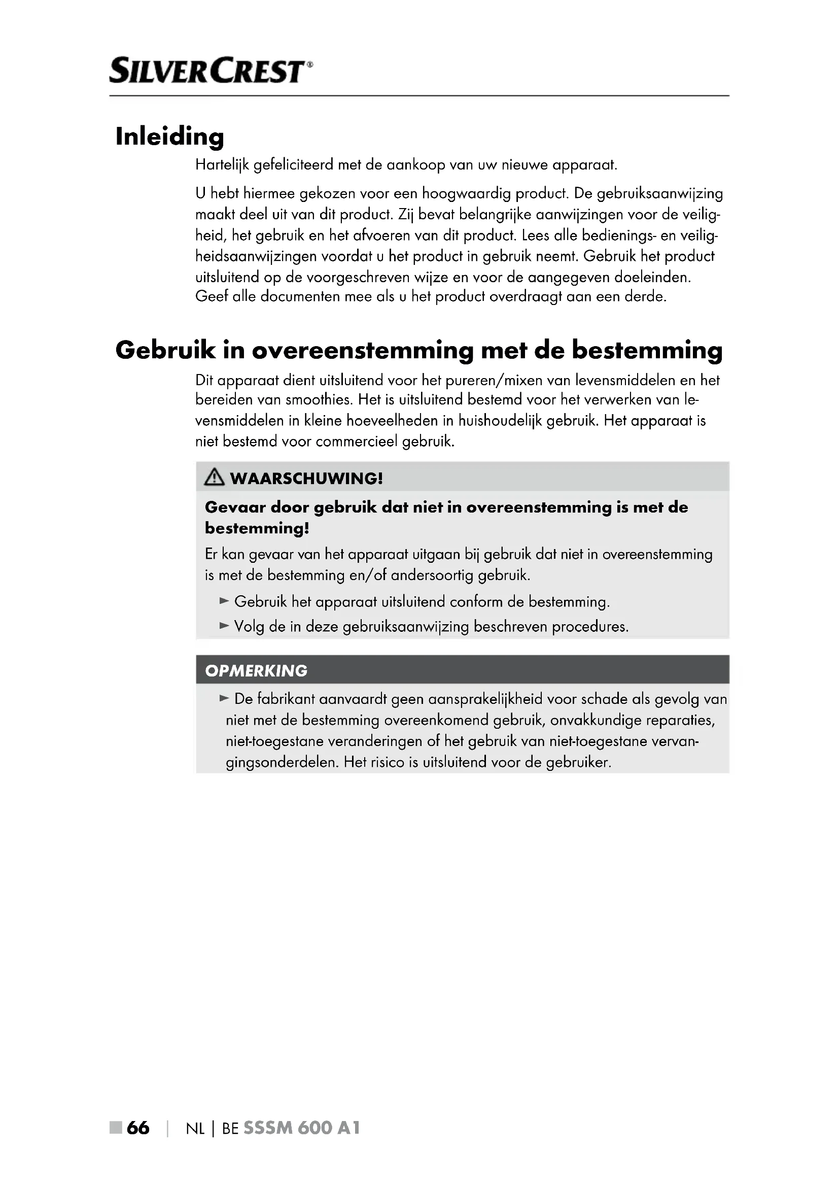 Inleiding Hartelijk gefeliciteerd met de aankoop van uw nieuwe apparaat. U hebt hiermee gekozen voor een hoogwaardig product. De gebruiksaanwijzing maakt deel uit van dit product. Zij bevat belangrijke aanwijzingen voor de veilig- heid, het gebruik en het afvoeren van dit product. Lees alle bedienings- en veilig- heidsaanwijzingen voordat u het product in gebruik neemt. Gebruik het product uitsluitend op de voorgeschreven wijze en voor de aangegeven doeleinden. Geef alle documenten mee als u het product overdraagt aan een derde. Gebruik in overeenstemming met de bestemming Dit apparaat dient uitsluitend voor het pureren/mixen van levensmiddelen en het bereiden van smoothies. Het is uitsluitend bestemd voor het verwerken van le- vensmiddelen in kleine hoeveelheden in huishoudelijk gebruik. Het apparaat is niet bestemd voor commercieel gebruik. WAARSCHUWING! Gevaar door gebruik dat niet in overeenstemming is met de bestemming! Er kan gevaar van het apparaat uitgaan bij gebruik dat niet in overeenstemming is met de bestemming en/of andersoortig gebruik. ► Gebruik het apparaat uitsluitend conform de bestemming. ► Volg de in deze gebruiksaanwijzing beschreven procedures. OPMERKING ► De fabrikant aanvaardt geen aansprakelijkheid voor schade als gevolg van niet met de bestemming overeenkomend gebruik, onvakkundige reparaties, niet-toegestane veranderingen of het gebruik van niet-toegestane vervan- gingsonderdelen. Het risico is uitsluitend voor de gebruiker.NL