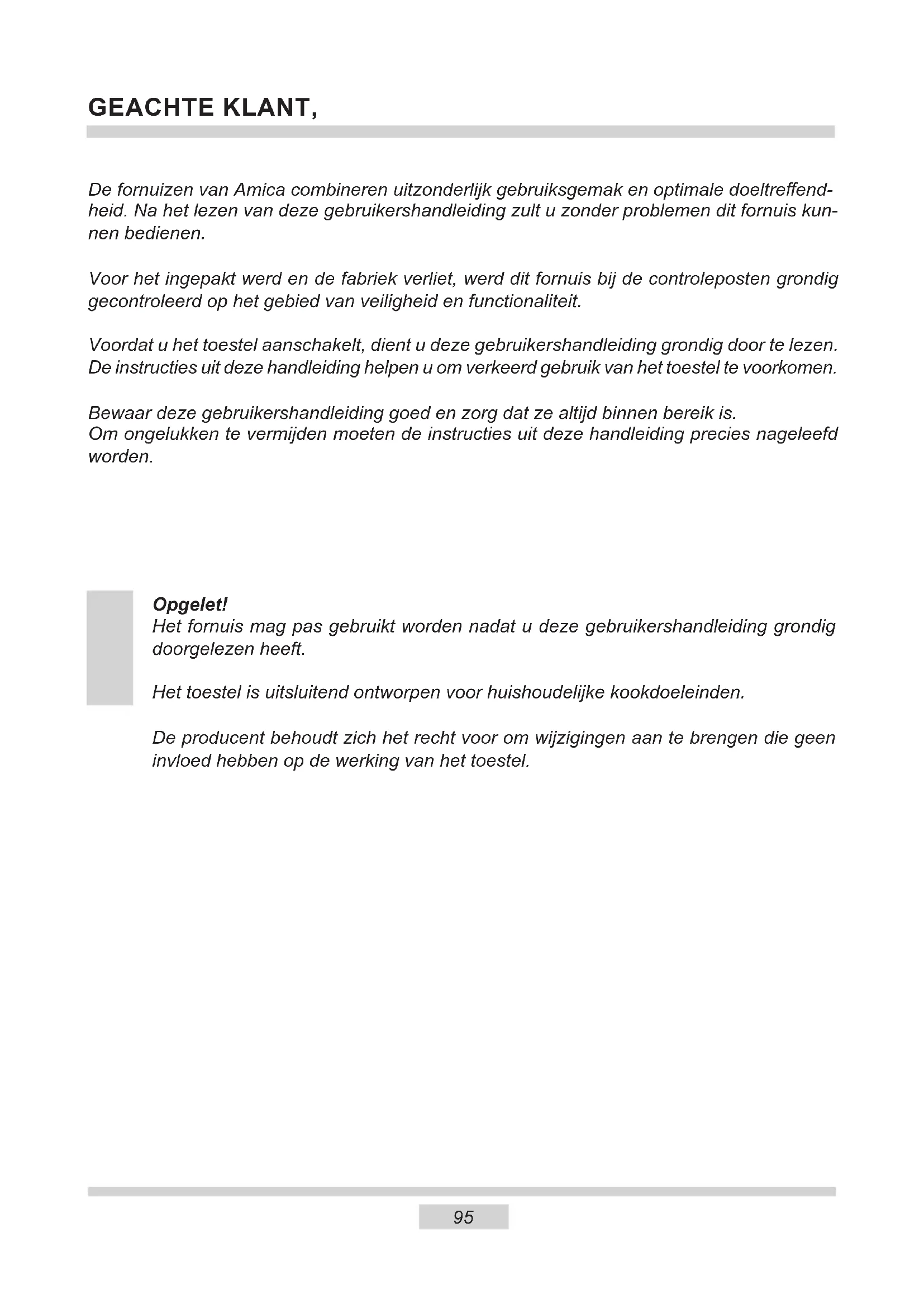 De fornuizen van Amica combineren uitzonderlijk gebruiksgemak en optimale doeltreffendheid. Na het lezen van deze gebruikershandleiding zult u zonder problemen dit fornuis kunnen bedieren.