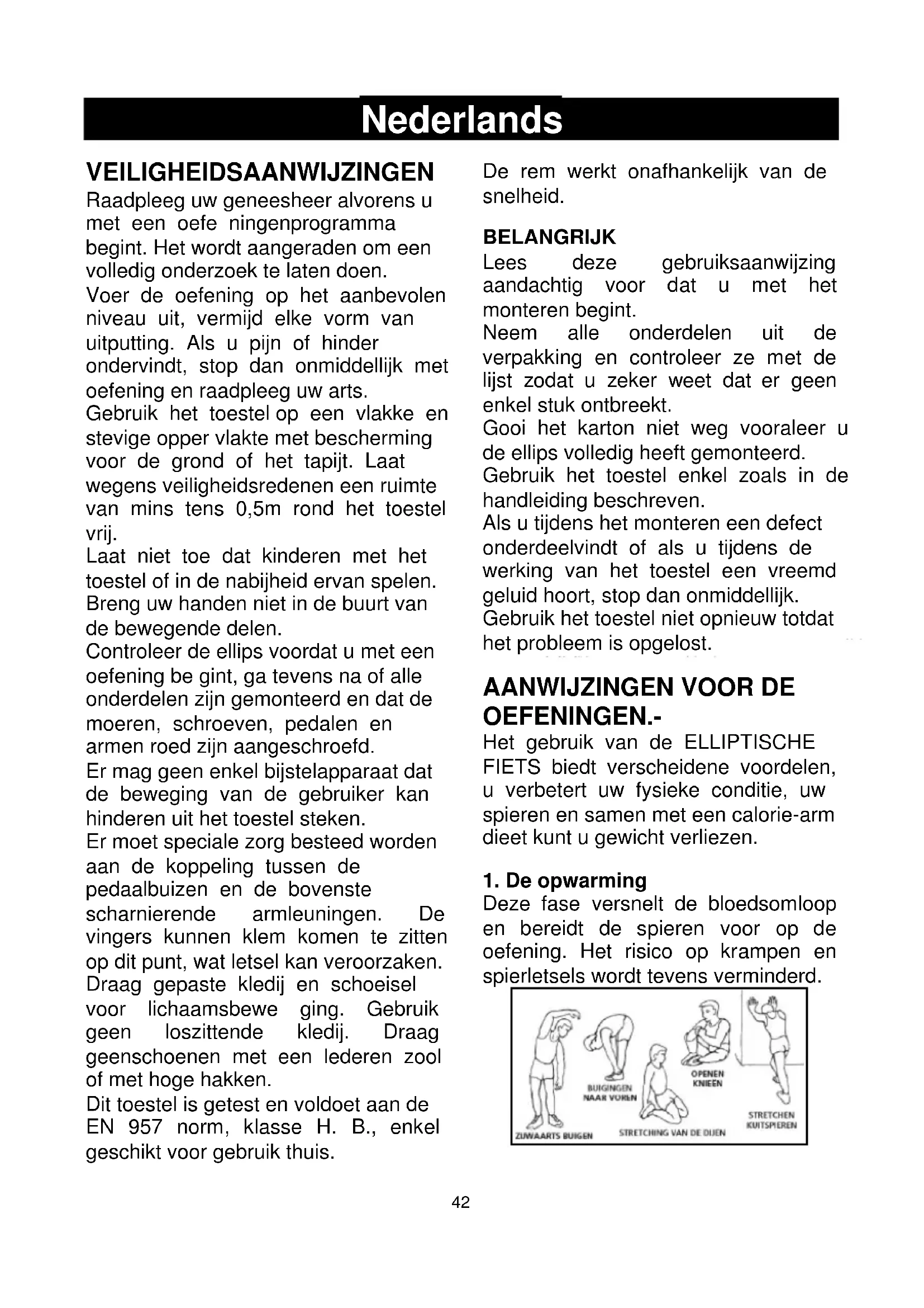 Nederlands VEILIGHEIDSAANWIJZINGEN Raadpleeg uw geneesheer alvorens u met een oefe ningenprogramma begint. Het wordt aangeraden om een volledig onderzoek te laten doen. Voer de oefening op het aanbevolen niveau uit, vermijd elke vorm van uitputting. Als u pijn of hinder ondervindt, stop dan onmiddellijk met oefening en raadpleeg uw arts. Gebruik het toestel op een vlakke en stevige opper vlakte met bescherming voor de grond of het tapijt. Laat wegens veiligheidsredenen een ruimte van mins tens 0,5m rond het toestel vrij. Laat niet toe dat kinderen met het toestel of in de nabijheid ervan spelen. Breng uw handen niet in de buurt van de bewegende delen. Controleer de ellips voordat u met een oefening be gint, ga tevens na of alle onderdelen zijn gemonteerd en dat de moeren, schroeven, pedalen en armen roed zijn aangeschroefd. Er mag geen enkel bijstelapparaat dat de beweging van de gebruiker kan hinderen uit het toestel steken. Er moet speciale zorg besteed worden aan de koppeling tussen de pedaalbuizen en de bovenste scharnierende armleuningen. De vingers kunnen klem komen te zitten op dit punt, wat letsel kan veroorzaken. Draag gepaste kledij en schoeisel voor lichaamsbewe ging. Gebruik geen loszittende kledij. Draag geenschoenen met een lederen zool of met hoge hakken. Dit toestel is getest en voldoet aan de EN 957 norm, klasse H. B., enkel geschikt voor gebruik thuis. De rem werkt onafhankelijk van de snelheid. BELANGRIJK Lees deze gebruiksaanwijzing aandachtig voor dat u met het monteren begint. Neem alle onderdelen uit de verpakking en controleer ze met de lijst zodat u zeker weet dat er geen enkel stuk ontbreekt. Gooi het karton niet weg vooraleer u de ellips volledig heeft gemonteerd. Gebruik het toestel enkel zoals in de handleiding beschreven. Als u tijdens het monteren een defect onderdeelvindt of als u tijdens de werking van het toestel een vreemd geluid hoort, stop dan onmiddellijk. Gebruik het toestel niet opnieuw totdat het probleem is opgelost.