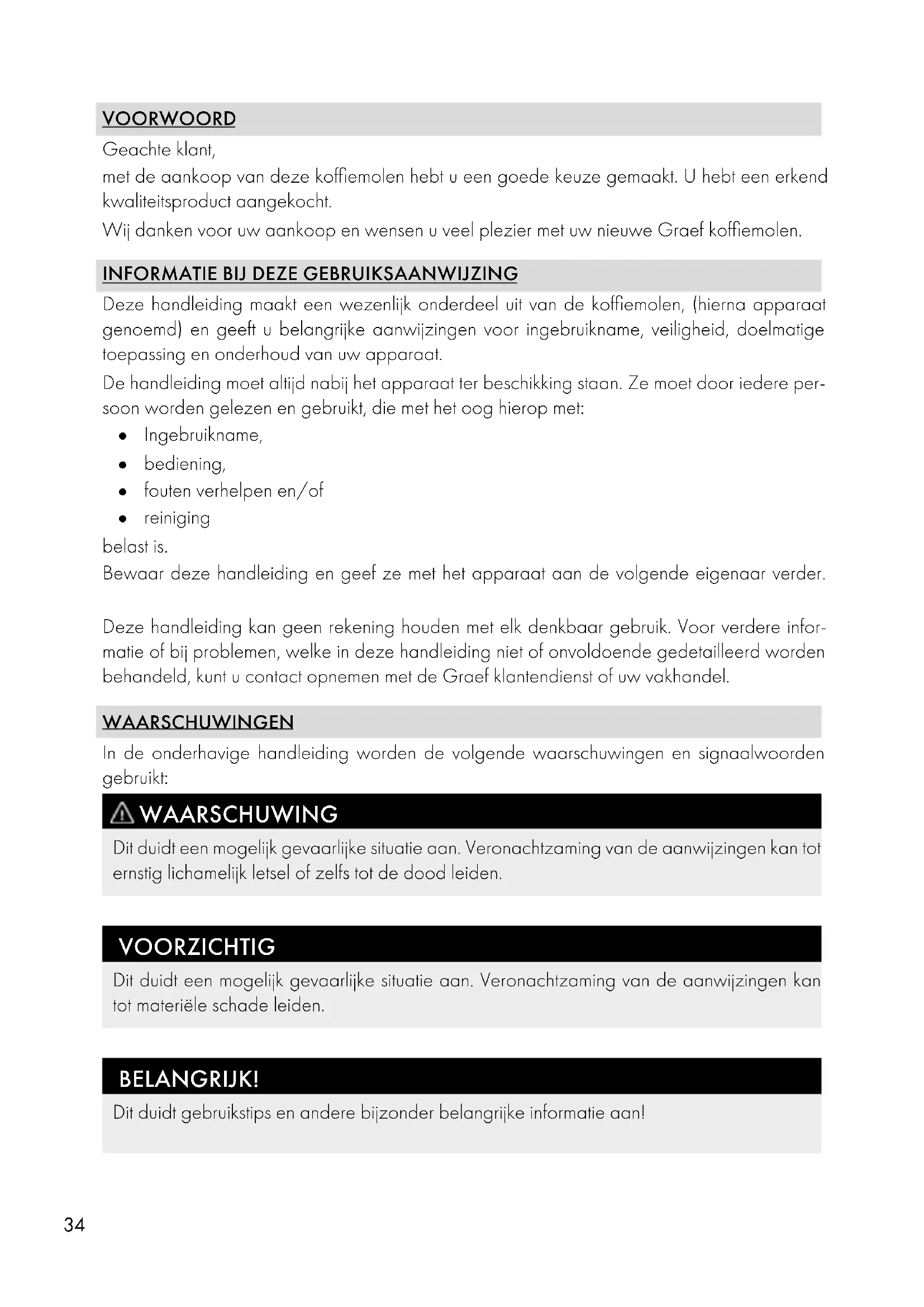 Deze handleiding maakt een wezenlijk onderdeel uit van de koffiemolen, (hierna apparaat genoemd) en geeft u belangrijke aanwijzingen voor ingebruikname, veiligheid, doelmatige toepassing en onderhoud van uw apparaat. De handleiding moet altijd nabij het apparaat ter beschikking staan. Ze moet door iedere per- soon worden gelezen en gebruikt, die met het oog hierop met: ● Ingebruikname, ● bediening, ● fouten verhelpen en/of ● reiniging belast is. Bewaar deze handleiding en geef ze met het apparaat aan de volgende eigenaar verder. Deze handleiding kan geen rekening houden met elk denkbaar gebruik. Voor verdere infor- matie of bij problemen, welke in deze handleiding niet of onvoldoende gedetailleerd worden behandeld, kunt u contact opnemen met de Graef klantendienst of uw vakhandel. WAARSCHUWINGEN In de onderhavige handleiding worden de volgende waarschuwingen en signaalwoorden gebruikt: WAARSCHUWING Dit duidt een mogelijk gevaarlijke situatie aan. Veronachtzaming van de aanwijzingen kan tot ernstig lichamelijk letsel of zelfs tot de dood leiden. VOORZICHTIG Dit duidt een mogelijk gevaarlijke situatie aan. Veronachtzaming van de aanwijzingen kan tot materiële schade leiden. BELANGRIJK! Dit duidt gebruikstips en andere bijzonder belangrijke informatie aan!35