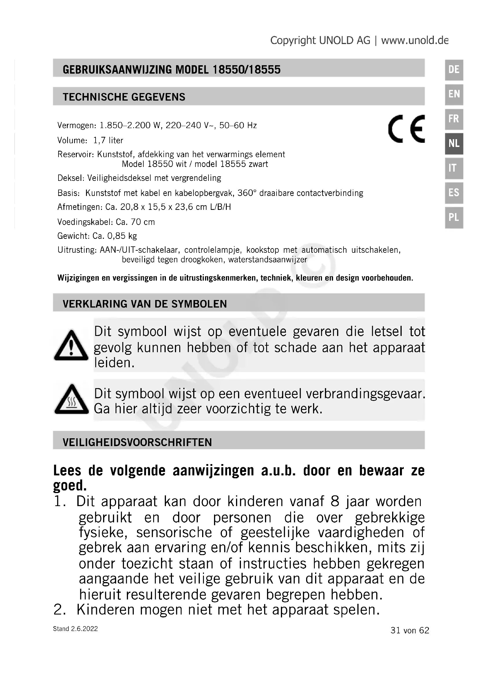 Dit symbool wijst op eventuele gevaren die letsel tot gevolg kunnen hebben of tot schade aan het apparaat leiden. Dit symbool wijst op een eventueel verbrandingsgevaar. Ga hier altijd zeer voorzichtig te werk. Vermogen: 1.850–2.200 W, 220–240 V~, 50–60HzVolume: 1,7 literReservoir: Kunststof, afdekking van het verwarmings elementModel 18550 wit / model 18555 zwartDeksel: Veiligheidsdeksel met vergrendelingBasis: Kunststof met kabel en kabelopbergvak, 360° draaibare contactverbindingAfmetingen: Ca. 20,8 x 15,5 x 23,6 cm L/B/HVoedingskabel: Ca. 70 cmGewicht: Ca. 0,85 kg Uitrusting: AAN-/UIT-schakelaar, controlelampje, kookstop met automatisch uitschakelen, beveiligd tegen droogkoken, waterstandsaanwijzer Wijzigingen en vergissingen in de uitrustingskenmerken, techniek, kleuren en design voorbehouden. VEILIGHEIDSVOORSCHRIFTEN Lees de volgende aanwijzingen a.u.b. door en bewaar ze goed.