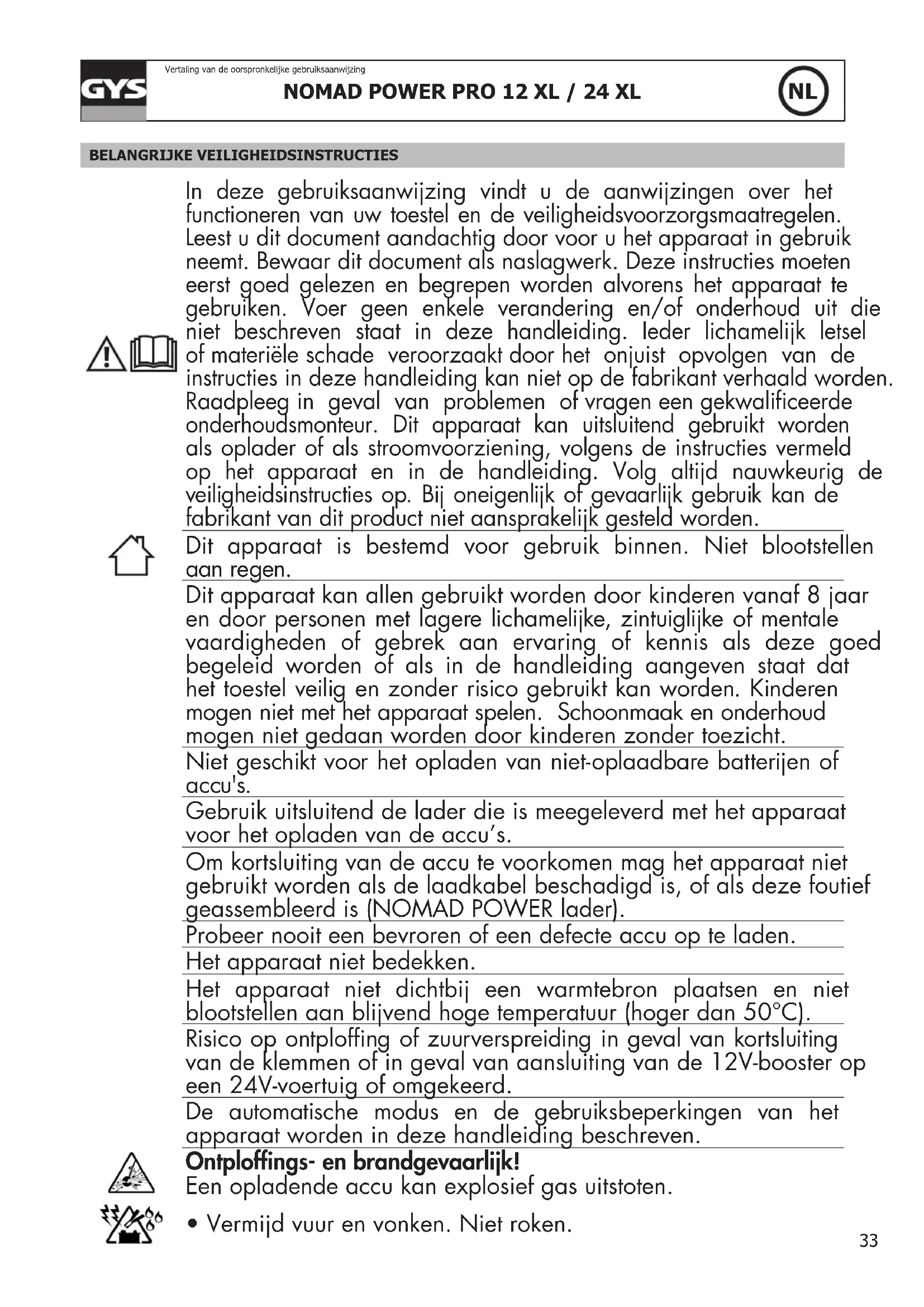 BELANGRIJKE VEILIGHEIDSINSTRUCTIES In deze gebruiksaanwijzing vindt u de aanwijzingen over het functioneren van uw toestel en de veiligheidsvoorzorgsmaatregelen. Leest u dit document aandachtig door voor u het apparaat in gebruik neemt. Bewaar dit document als naslagwerk. Deze instructies moeten eerst goed gelezen en begrepen worden alvorens het apparaat te gebruiken. Voer geen enkele verandering en/of onderhoud uit die niet beschreven staat in deze handleiding. Ieder lichamelijk letsel of materiële schade veroorzaakt door het onjuist opvolgen van de instructies in deze handleiding kan niet op de fabrikant verhaald worden. Raadpleeg in geval van problemen of vragen een gekwaliceerde onderhoudsmonteur. Dit apparaat kan uitsluitend gebruikt worden als oplader of als stroomvoorziening, volgens de instructies vermeld op het apparaat en in de handleiding. Volg altijd nauwkeurig de veiligheidsinstructies op. Bij oneigenlijk of gevaarlijk gebruik kan de fabrikant van dit product niet aansprakelijk gesteld worden. Dit apparaat is bestemd voor gebruik binnen. Niet blootstellen aan regen. Dit apparaat kan allen gebruikt worden door kinderen vanaf 8 jaar en door personen met lagere lichamelijke, zintuiglijke of mentale vaardigheden of gebrek aan ervaring of kennis als deze goed begeleid worden of als in de handleiding aangeven staat dat het toestel veilig en zonder risico gebruikt kan worden. Kinderen mogen niet met het apparaat spelen. Schoonmaak en onderhoud mogen niet gedaan worden door kinderen zonder toezicht. Niet geschikt voor het opladen van niet-oplaadbare batterijen of accu's. Gebruik uitsluitend de lader die is meegeleverd met het apparaat voor het opladen van de accu’s. Om kortsluiting van de accu te voorkomen mag het apparaat niet gebruikt worden als de laadkabel beschadigd is, of als deze foutief geassembleerd is (NOMAD POWER lader). Probeer nooit een bevroren of een defecte accu op te laden. Het apparaat niet bedekken. Het apparaat niet dichtbij een warmtebron plaatsen en niet blootstellen aan blijvend hoge temperatuur (hoger dan 50°C). Risico op ontplofng of zuurverspreiding in geval van kortsluiting van de klemmen of in geval van aansluiting van de 12V-booster op een 24V-voertuig of omgekeerd. De automatische modus en de gebruiksbeperkingen van het apparaat worden in deze handleiding beschreven. Ontplofngs- en brandgevaarlijk! Een opladende accu kan explosief gas uitstoten.