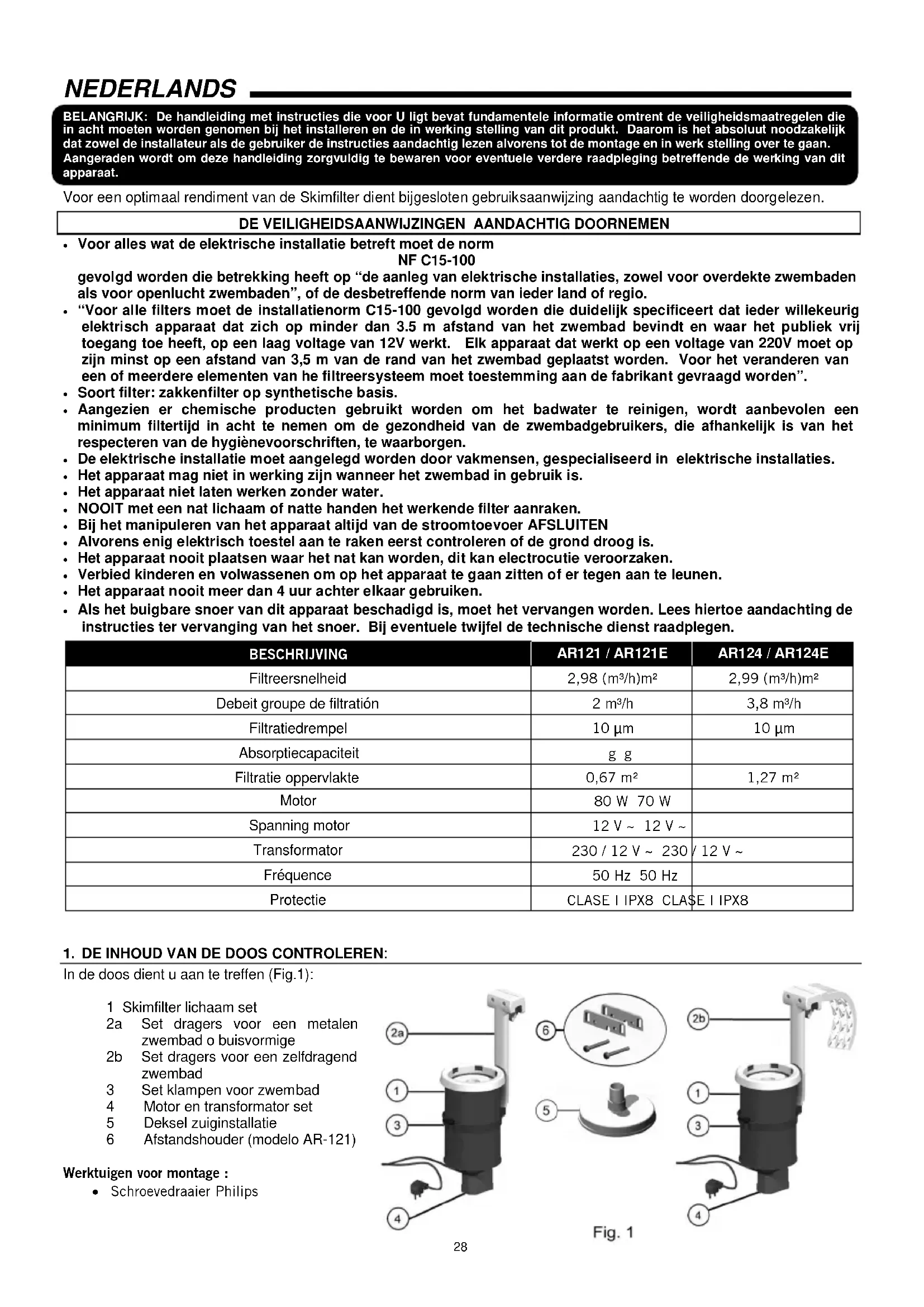 In de doos dient u aan te treffen (Fig.1): 1 Skimfilter lichaam set 2a Set dragers voor een metalen zwembad o buisvormige 2b Set dragers voor een zelfdragend zwembad 3 Set klampen voor zwembad 4 Motor en transformator set 5 Deksel zuiginstallatie 6 Afstandshouder (modelo AR-121) Werktuigen voor montage :