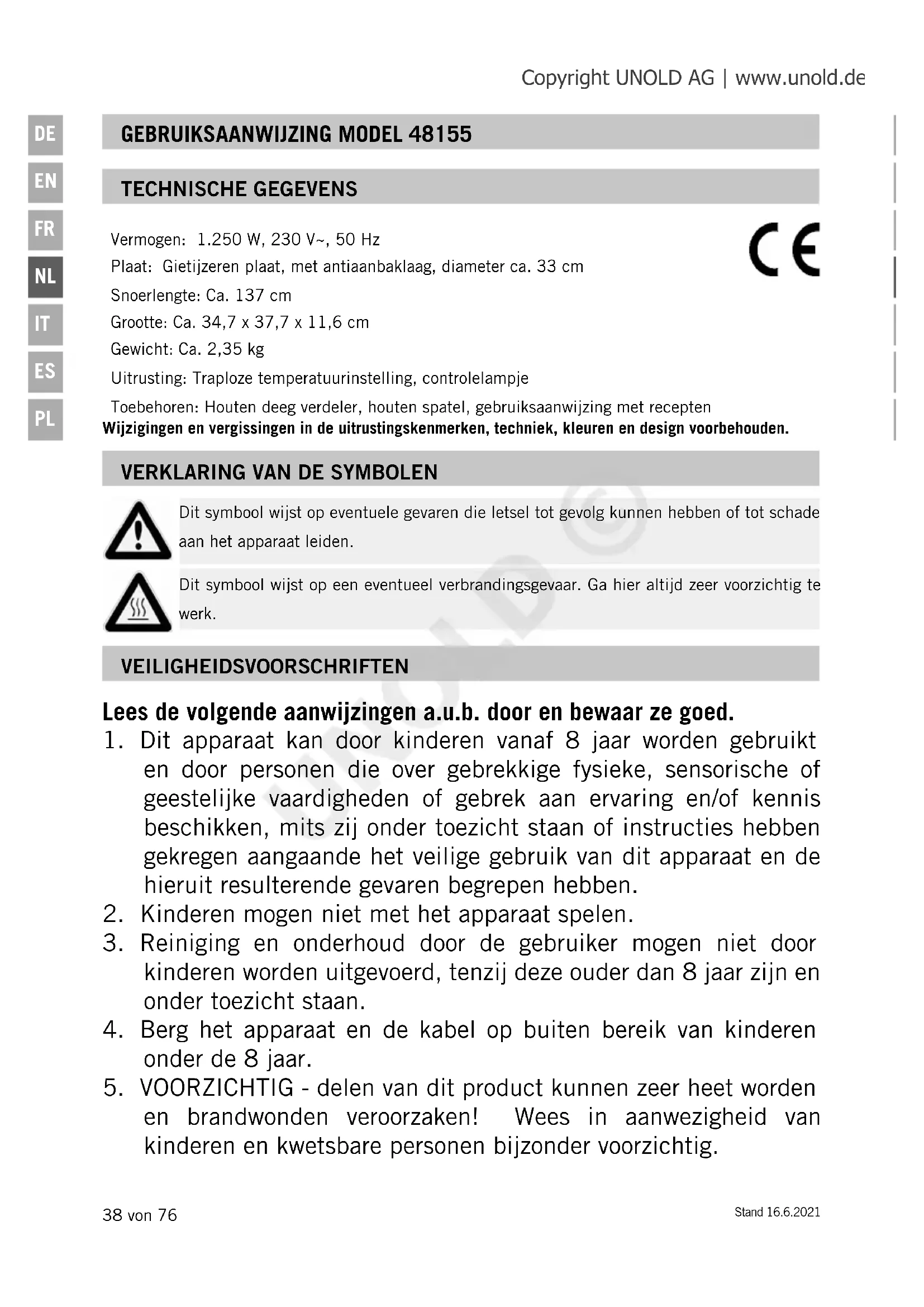 Vermogen: 1.250 W, 230 V~, 50 Hz Plaat: Gietijzeren plaat, met antiaanbaklaag, diameter ca. 33 cm Snoerlengte: Ca. 137 cm Grootte: Ca. 34,7 x 37,7 x 11,6 cm Gewicht: Ca. 2,35 kg Uitrusting: Traploze temperatuurinstelling, controlelampje Toebehoren: Houten deeg verdeler, houten spatel, gebruiksaanwijzing met recepten Wijzigingen en vergissingen in de uitrustingskenmerken, techniek, kleuren en design voorbehouden. GEBRUIKSAANWIJZING MODEL 48155 VEILIGHEIDSVOORSCHRIFTEN TECHNISCHE GEGEVENS Lees de volgende aanwijzingen a.u.b. door en bewaar ze goed.