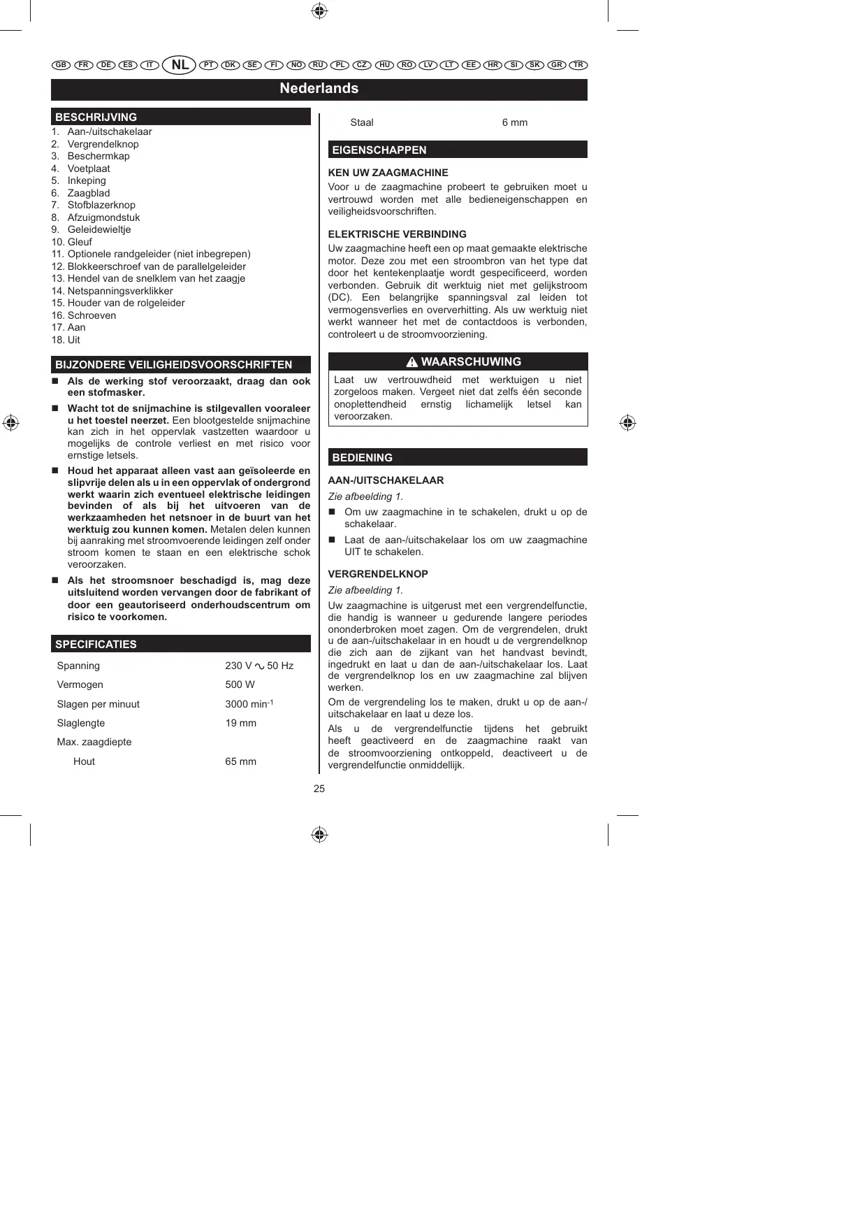 Voor u de zaagmachine probeert te gebruiken moet u vertrouwd worden met alle bedieneigenschappen en veiligheidsvoorschriften. ELEKTRISCHE VERBINDING Uw zaagmachine heeft een op maat gemaakte elektrische motor. Deze zou met een stroombron van het type dat door het kentekenplaatje wordt gespeci>ceerd, worden verbonden. Gebruik dit werktuig niet met gelijkstroom (DC). Een belangrijke spanningsval zal leiden tot vermogensverlies en oververhitting. Als uw werktuig niet werkt wanneer het met de contactdoos is verbonden, controleert u de stroomvoorziening. WAARSCHUWING BIJZONDERE VEILIGHEIDSVOORSCHRIFTEN Als de werking stof veroorzaakt, draag dan ook een stofmasker. Laat uw vertrouwdheid met werktuigen u niet zorgeloos maken. Vergeet niet dat zelfs één seconde onoplettendheid ernstig lichamelijk letsel kan veroorzaken. Wacht tot de snijmachine is stilgevallen vooraleer u het toestel neerzet. Een blootgestelde snijmachine kan zich in het oppervlak vastzetten waardoor u mogelijks de controle verliest en met risico voor ernstige letsels. BEDIENING Houd het apparaat alleen vast aan geïsoleerde en slipvrije delen als u in een oppervlak of ondergrond werkt waarin zich eventueel elektrische leidingen bevinden of als bij het uitvoeren van de werkzaamheden het netsnoer in de buurt van het werktuig zou kunnen komen. Metalen delen kunnen bij aanraking met stroomvoerende leidingen zelf onder stroom komen te staan en een elektrische schok veroorzaken. AAN-/UITSCHAKELAAR Zie afbeelding 1. Om uw zaagmachine in te schakelen, drukt u op de schakelaar. Laat de aan-/uitschakelaar los om uw zaagmachine UIT te schakelen. VERGRENDELKNOP Als het stroomsnoer beschadigd is, mag deze uitsluitend worden vervangen door de fabrikant of door een geautoriseerd onderhoudscentrum om risico te voorkomen. Zie afbeelding 1. Uw zaagmachine is uitgerust met een vergrendelfunctie, die handig is wanneer u gedurende langere periodes ononderbroken moet zagen. Om de vergrendelen, drukt u de aan-/uitschakelaar in en houdt u de vergrendelknop die zich aan de zijkant van het handvast bevindt, ingedrukt en laat u dan de aan-/uitschakelaar los. Laat de vergrendelknop los en uw zaagmachine zal blijven werken. Om de vergrendeling los te maken, drukt u op de aan-/ uitschakelaar en laat u deze los. Als u de vergrendelfunctie tijdens het gebruikt heeft geactiveerd en de zaagmachine raakt van de stroomvoorziening ontkoppeld, deactiveert u de vergrendelfunctie onmiddellijk. SPECIFICATIES Spanning 230 V 50 Hz Vermogen 500 W Slagen per minuut 3000 min-1 Slaglengte 19 mm Max. zaagdiepte Hout 6 mm 65 mm