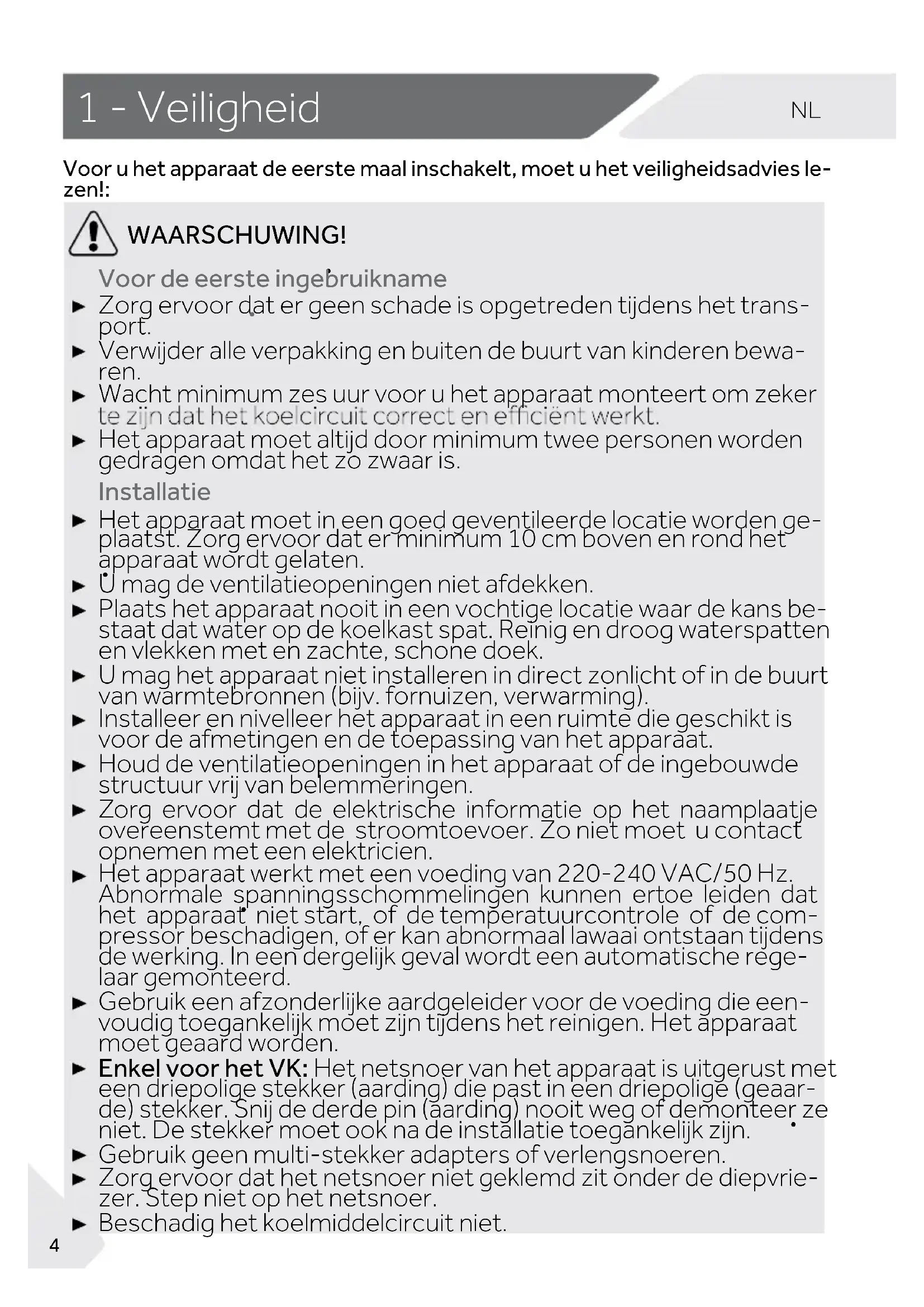 apparaat wordt gelaten. U mag de ventilatieopeningen niet afdekken. Plaats het apparaat nooit in een vochtige locatie waar de kans be- staat dat water op de koelkast spat. Reinig en droog waterspatten en vlekken met en zachte, schone doek. U mag het apparaat niet installeren in direct zonlicht of in de buurt van warmtebronnen (bijv. fornuizen, verwarming). Installeer en nivelleer het apparaat in een ruimte die geschikt is voor de afmetingen en de toepassing van het apparaat. Houd de ventilatieopeningen in het apparaat of de ingebouwde structuur vrij van belemmeringen. Zorg ervoor dat de elektrische informatie op het naamplaatje overeenstemt met de stroomtoevoer. Zo niet moet u contact opnemen met een elektricien. Het apparaat werkt met een voeding van 220-240 VAC/50 Hz.