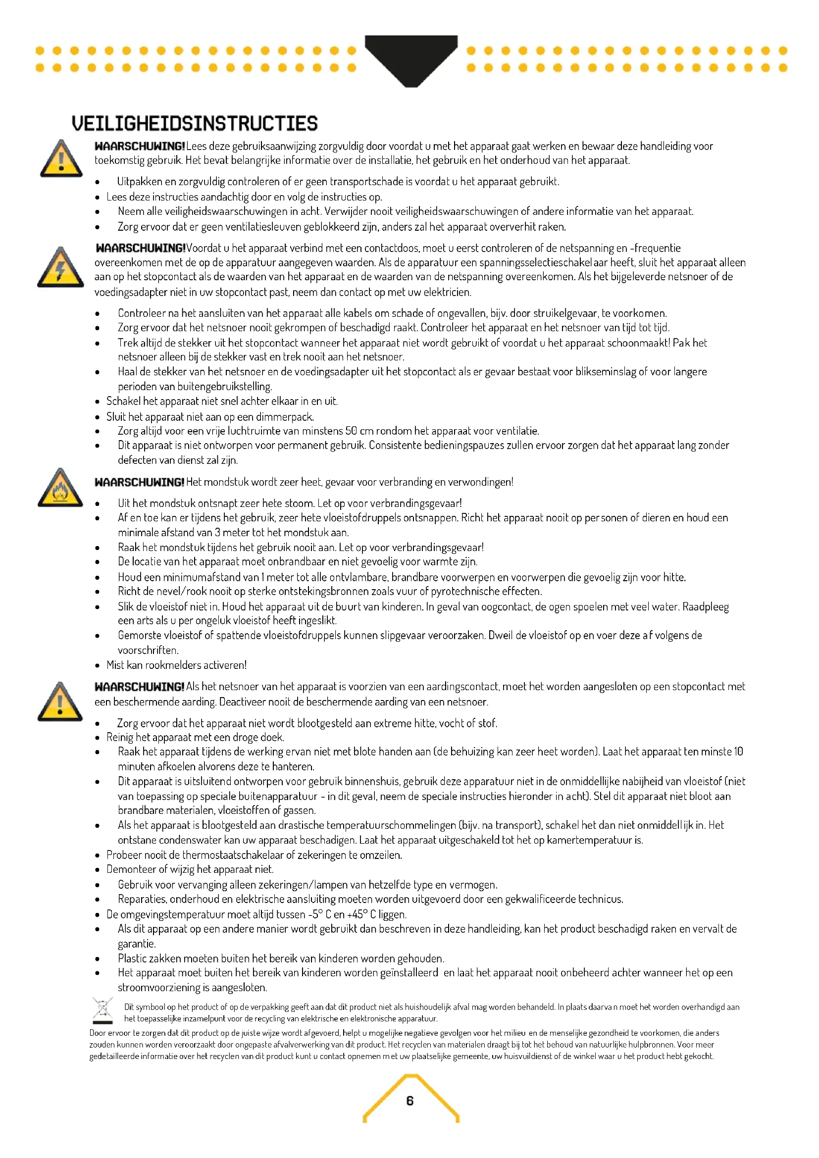 - Af en toe kan er tijdens het gebruik, zeer hete vloeistofdruppels ontsnappen. Richt het apparaat nooit op personen of dieren en houd een minimale afstand van 3 meter tot het mondstuk aan.