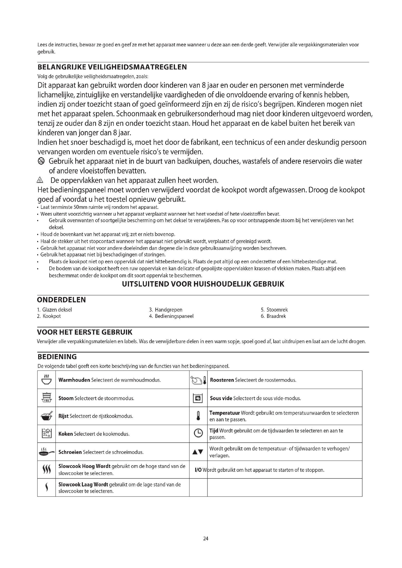 UA24 Lees de instructies, bewaar ze goed en geef ze met het apparaat mee wanneer u deze aan een derde geeft. Verwijder alle verpakkingsmaterialen voor gebruik. BELANGRIJKE VEILIGHEIDSMAATREGELEN Volg de gebruikelijke veiligheidsmaatregelen, zoals: Dit apparaat kan gebruikt worden door kinderen van 8 jaar en ouder en personen met verminderde lichamelijke, zintuiglijke en verstandelijke vaardigheden of die onvoldoende ervaring of kennis hebben, indien zij onder toezicht staan of goed geïnformeerd zijn en zij de risico’s begrijpen. Kinderen mogen niet met het apparaat spelen. Schoonmaak en gebruikersonderhoud mag niet door kinderen uitgevoerd worden, tenzij ze ouder dan 8 zijn en onder toezicht staan. Houd het apparaat en de kabel buiten het bereik van kinderen van jonger dan 8 jaar. Indien het snoer beschadigd is, moet het door de fabrikant, een technicus of een ander deskundig persoon vervangen worden om eventuele risico’s te vermijden. b Gebruik het apparaat niet in de buurt van badkuipen, douches, wastafels of andere reservoirs die water of andere vloeistoen bevatten. ¬ De oppervlakken van het apparaat zullen heet worden. Het bedieningspaneel moet worden verwijderd voordat de kookpot wordt afgewassen. Droog de kookpot goed af voordat u het toestel opnieuw gebruikt.
