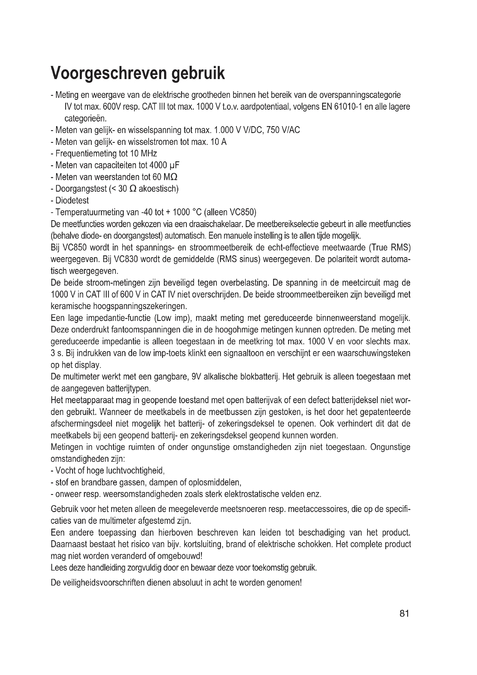 - Technische gegevens 1 Voorgeschreven gebruik - Meting en weergave van de elektrische grootheden binnen het bereik van de overspanningscategorie IV tot max. 600V resp. CAT III tot max. 1000 V t.o.v. aardpotentiaal, volgens EN 61010-1 en alle lagere categorieën. - Meten van gelijk- en wisselspanning tot max. 1.000 V V/DC, 750 V/AC - Meten van gelijk- en wisselstromen tot max. 10 A - Frequentiemeting tot 10 MHz - Meten van capaciteiten tot 4000 µF - Meten van weerstanden tot 60 MΩ - Doorgangstest (< 30 Ω akoestisch) - Diodetest - Temperatuurmeting van -40 tot + 1000 °C (alleen VC850) De meetfuncties worden gekozen via een draaischakelaar. De meetbereikselectie gebeurt in alle meetfuncties (behalve diode- en doorgangstest) automatisch. Een manuele instelling is te allen tijde mogelijk. Bij VC850 wordt in het spannings- en stroommeetbereik de echt-effectieve meetwaarde (True RMS) weergegeven. Bij VC830 wordt de gemiddelde (RMS sinus) weergegeven. De polariteit wordt automa- tisch weergegeven. De beide stroom-metingen zijn beveiligd tegen overbelasting. De spanning in de meetcircuit mag de 1000 V in CAT III of 600 V in CAT IV niet overschrijden. De beide stroommeetbereiken zijn beveiligd met keramische hoogspanningszekeringen. Een lage impedantie-functie (Low imp), maakt meting met gereduceerde binnenweerstand mogelijk. Deze onderdrukt fantoomspanningen die in de hoogohmige metingen kunnen optreden. De meting met gereduceerde impedantie is alleen toegestaan in de meetkring tot max. 1000 V en voor slechts max. 3 s. Bij indrukken van de low imp-toets klinkt een signaaltoon en verschijnt er een waarschuwingsteken op het display. De multimeter werkt met een gangbare, 9V alkalische blokbatterij. Het gebruik is alleen toegestaan met de aangegeven batterijtypen. Het meetapparaat mag in geopende toestand met open batterijvak of een defect batterijdeksel niet wor- den gebruikt. Wanneer de meetkabels in de meetbussen zijn gestoken, is het door het gepatenteerde afschermingsdeel niet mogelijk het batterij- of zekeringsdeksel te openen. Ook verhindert dit dat de meetkabels bij een geopend batterij- en zekeringsdeksel geopend kunnen worden. Metingen in vochtige ruimten of onder ongunstige omstandigheden zijn niet toegestaan. Ongunstige omstandigheden zijn: - Vocht of hoge luchtvochtigheid, - stof en brandbare gassen, dampen of oplosmiddelen, - onweer resp. weersomstandigheden zoals sterk elektrostatische velden enz. Gebruik voor het meten alleen de meegeleverde meetsnoeren resp. meetaccessoires, die op de specifi- caties van de multimeter afgestemd zijn. Een andere toepassing dan hierboven beschreven kan leiden tot beschadiging van het product. Daarnaast bestaat het risico van bijv. kortsluiting, brand of elektrische schokken. Het complete product mag niet worden veranderd of omgebouwd! Lees deze handleiding zorgvuldig door en bewaar deze voor toekomstig gebruik. De veiligheidsvoorschriften dienen absoluut in acht te worden genomen!82 Bedieningselementen Zie uitklappagina 1 Passende rubberen bescherming 2 Display 3 SELECT-toets voor omschakelen van de functie (rode symbolen) 4 Draaischakelaar voor meetfunctieselectie 5 mAµA-Meetbus 6 10 A-Meetbus 7 HzVΩ-Meetbus(bij gelijke grootte „plus“) 8 COM-Meetbus (referentiepotentiaal „minus“) 9 Low Imp. 400 kΩ-toets voor impedantie-omschakeling 10 Functietoetsen RANGE: Manuele meetbereikomschakeling REL/PC: REL = referentiewaarde, PC = activeert de interface Hz/%: Functieomschakeling (gele symbolen, alleen actief in het AC-meetbereik) H/LIGHT: Hold-functie voor het vasthouden van de meetweergave, inschakelen van de displayver- lichting 11 Optisch geïsoleerde RS232-interface 12 Statief-aansluitschroefdraad 13 Inklapbare standaard 14 Batterijvak 15 Schroeven voor het batterij en zekeringsvak 16 Zekeringsvak83 Veiligheidsvoorschriften p. 1018
