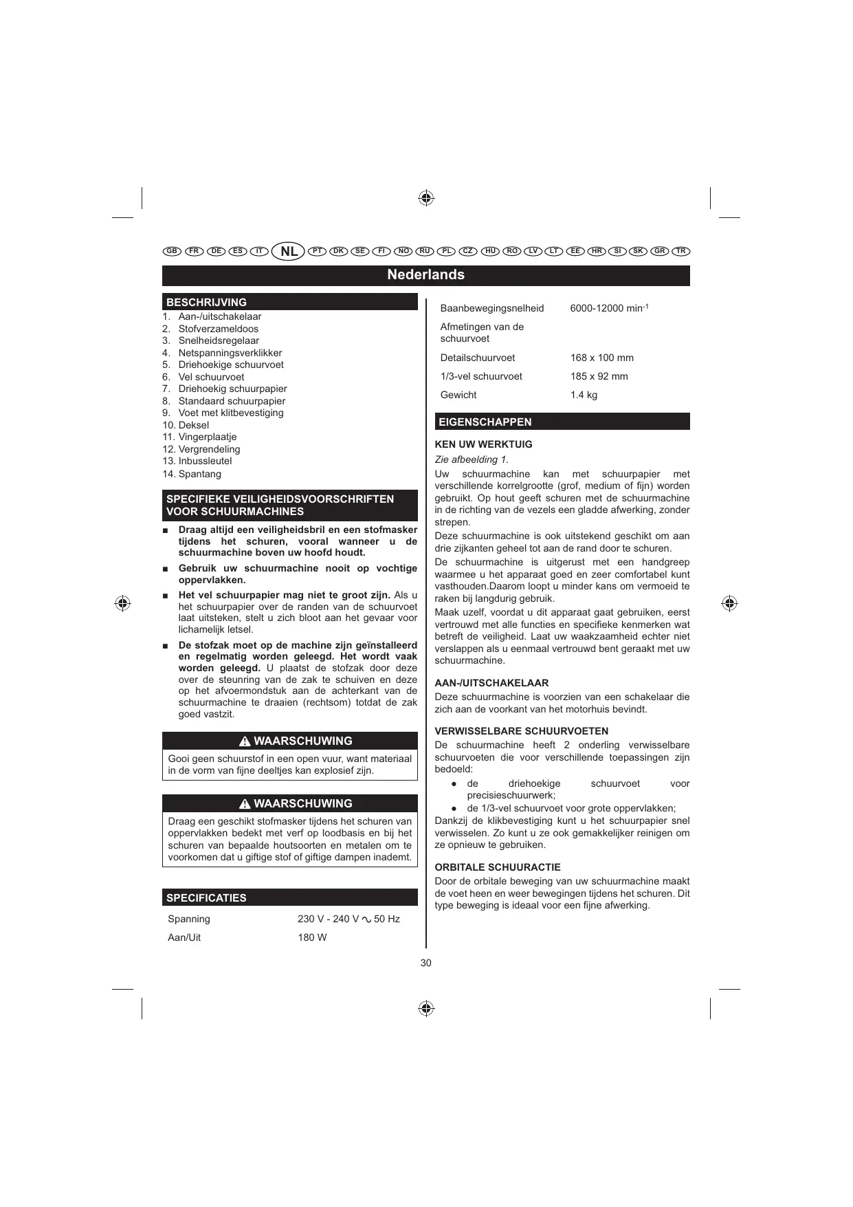 De stofzak moet op de machine zijn geïnstalleerd en regelmatig worden geleegd. Het wordt vaak worden geleegd. U plaatst de stofzak door deze over de steunring van de zak te schuiven en deze op het afvoermondstuk aan de achterkant van de schuurmachine te draaien (rechtsom) totdat de zak goed vastzit. AAN-/UITSCHAKELAAR Deze schuurmachine is voorzien van een schakelaar die zich aan de voorkant van het motorhuis bevindt. VERWISSELBARE SCHUURVOETEN De schuurmachine heeft 2 onderling verwisselbare schuurvoeten die voor verschillende toepassingen zijn bedoeld: Ê de driehoekige schuurvoet voor precisieschuurwerk; Ê de 1/3-vel schuurvoet voor grote oppervlakken; Dankzij de klikbevestiging kunt u het schuurpapier snel verwisselen. Zo kunt u ze ook gemakkelijker reinigen om ze opnieuw te gebruiken. WAARSCHUWING Gooi geen schuurstof in een open vuur, want materiaal in de vorm van Âjne deeltjes kan explosief zijn. WAARSCHUWING Draag een geschikt stofmasker tijdens het schuren van oppervlakken bedekt met verf op loodbasis en bij het schuren van bepaalde houtsoorten en metalen om te voorkomen dat u giftige stof of giftige dampen inademt. ORBITALE SCHUURACTIE Door de orbitale beweging van uw schuurmachine maakt de voet heen en weer bewegingen tijdens het schuren. Dit type beweging is ideaal voor een Âjne afwerking. SPECIFICATIES Spanning 230 V - 240 V Aan/Uit 180 W 50 Hz
