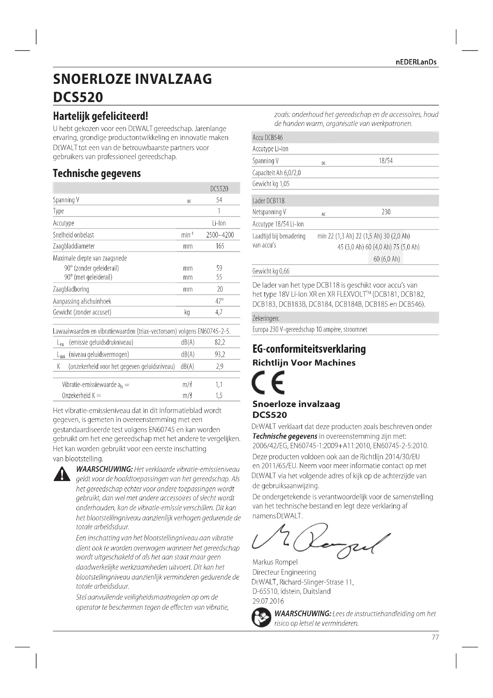 (DCB181, DCB182, DCB183, DCB183B, DCB184, DCB184B, DCB185 en DCB546). Zekeringen: Europa 230 V-gereedschap 10 ampère, stroomnet EG-conformiteitsverklaring Richtlijn Voor Machines Snoerloze invalzaag DCS520 DeWALT verklaart dat deze producten zoals beschreven onder Technische gegevens in overeenstemming zijn met: 2006/42/EG, EN60745-1:2009+A11:2010, EN60745-2-5:2010. Deze producten voldoen ook aan de Richtlijn 2014/30/EU en 2011/65/EU. Neem voor meer informatie contact op met DeWALT via het volgende adres of kijk op de achterzijde van degebruiksaanwijzing. De ondergetekende is verantwoordelijk voor de samenstelling van het technische bestand en legt deze verklaring af namens DeWALT