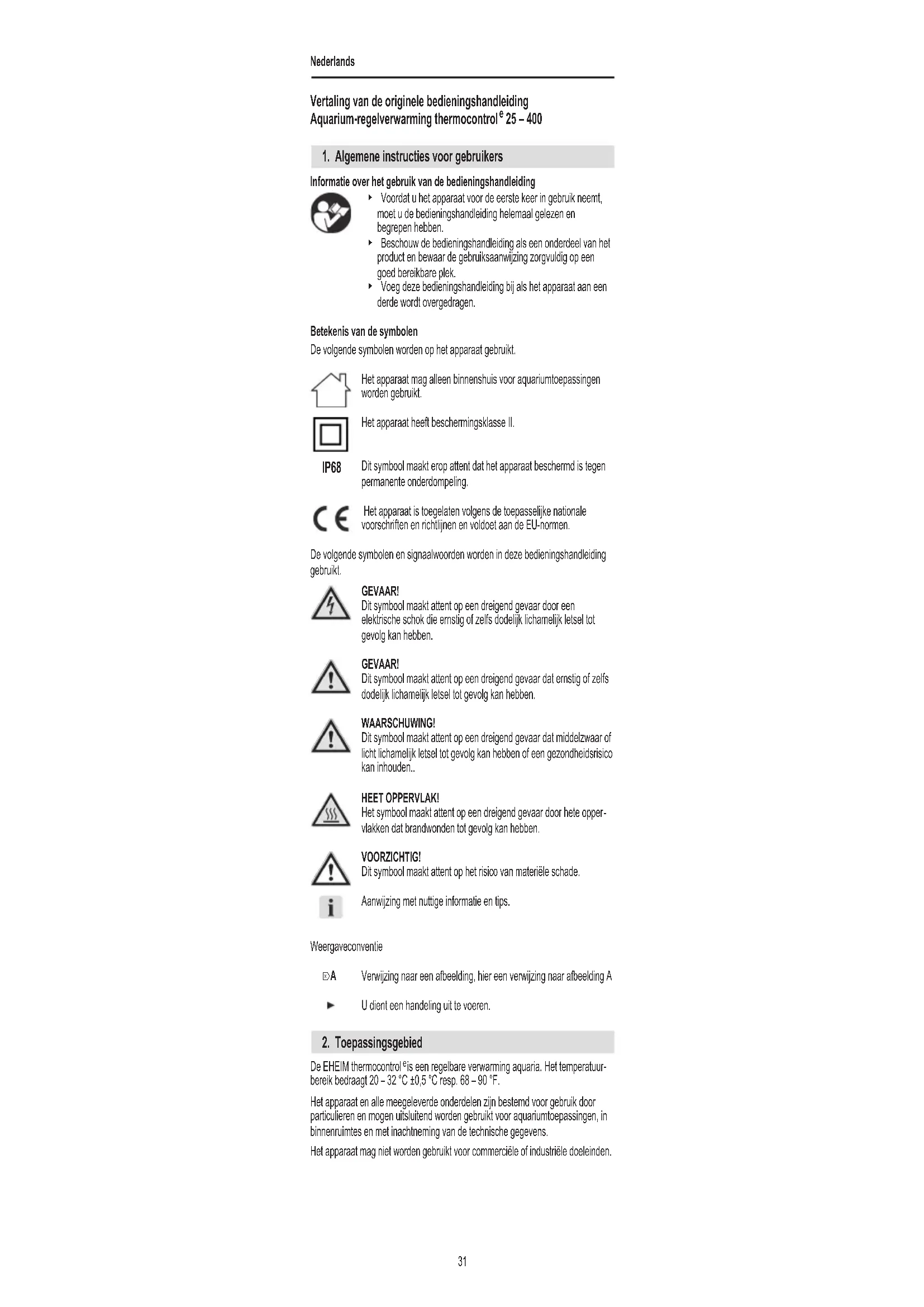 is een regelbare verwarming aquaria. Het temperatuur- bereik bedraagt 20 – 32 °C ±0,5 °C resp. 68 – 90 °F. Het apparaat en alle meegeleverde onderdelen zijn bestemd voor gebruik door particulieren en mogen uitsluitend worden gebruikt voor aquariumtoepassingen, in binnenruimtes en met inachtneming van de technische gegevens. Het apparaat mag niet worden gebruikt voor commerciële of industriële doeleinden. IP68 ⌦ANederlands