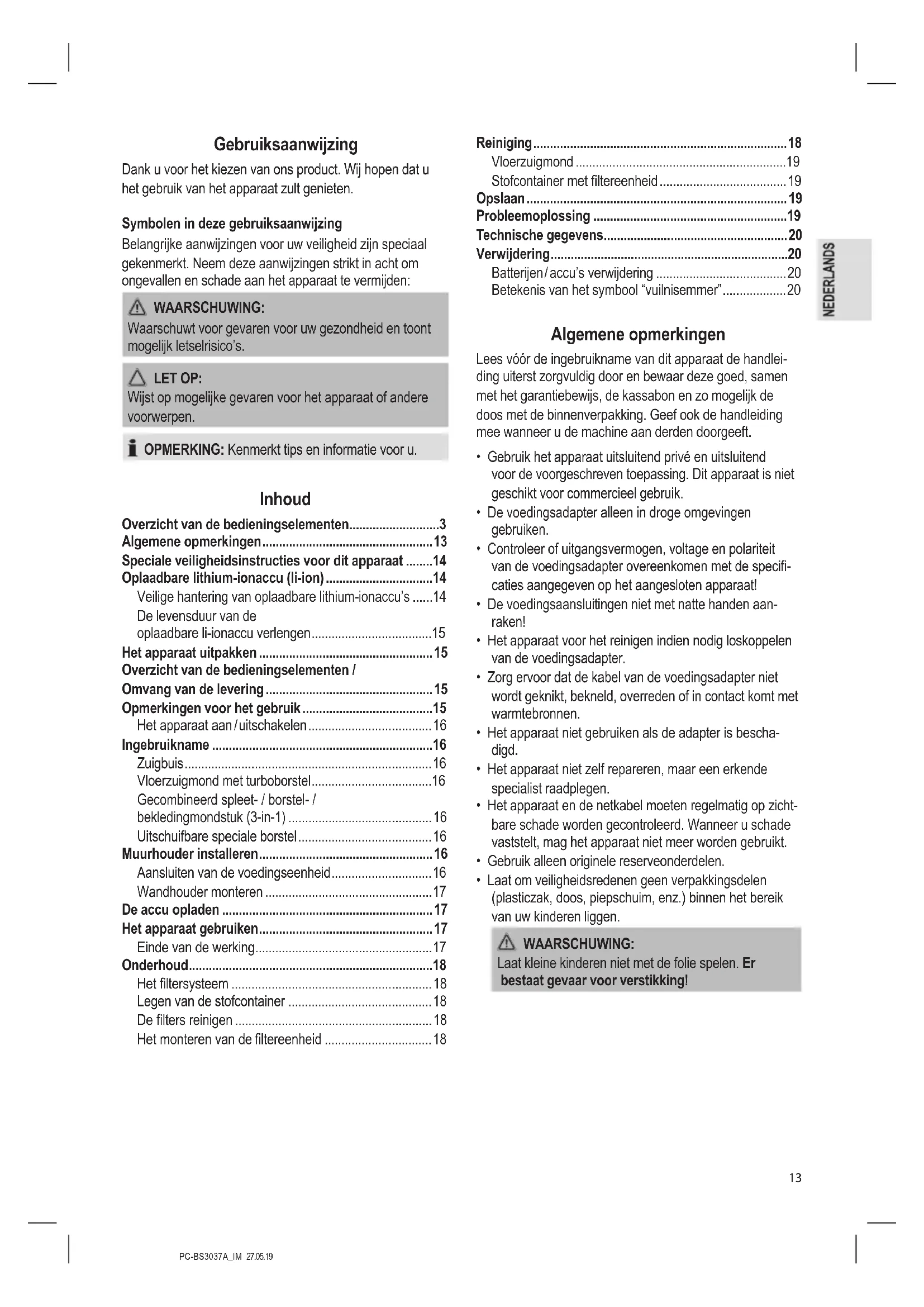Probleem Mogelijke oorzaak Oplossing Weinig zuigkracht. De oplaadbare batterij is bijna leeg. Laat de batterij op. De stofcontainer is vol. Leeg de stofcontainer. De lters zijn vervuild. Maak de lters schoon, zoals beschreven onder “Onderhoud”. LET OP: Gebruik het apparaat pas weer met droge lters. Luid geluid tijdens gebruik. Een vreemd voorwerp is in de zuig- mond vast komen te zitten. Verwijder het voorwerp. Maak indien nodig de zuig- mond los van de zuigbuis. De zuigmond met turbo- borstel doet het niet. De rolborstel is geblokkeerd door vuil. Reinig de zuigmond zoals beschreven in “Reiniging”. Zuigbuis en / of zuigmond niet goed gemonteerd. Controleer de juiste montage van de componenten. De oplaadbare batterij houdt geen lading vast. De oplaadbare batterij is aan het einde van zijn levensduur. Neem contact op met onze dienst of een specialist. Technische gegevens Model:.............................................................. PC-BS 3037 A Nettogewicht (Handset met zuigbuis en vloermondstuk): .......... ong. 2,4 kg Voedingsadapter Beschermingsklasse: ........................................................... Voeding: .......................AC 100 - 240 V, 50 / 60 Hz, 0,8 A MAX Vermogen: .................................................... DC 35 V, 500 mA Polariteit: .................................................................... Oplaadbare batterij: ........................29,6 V, 2200 mAh Li-ion Gebruikduur: ........................................30 minuten maximaal Oplaadtijd: ........................................................... ong. 4,5 uur Het recht om technische en ontwerpaanpassingen te ma- ken in de loop van voortdurende productontwikkeling blijft voorbehouden. Dit apparaat is gekeurd conform de op dit moment van toe- passing zijnde CE-richtlijnen zoals bijvoorbeeld elektromag- netische compatibiliteit en laagspanningsvoorschriften en is geconstrueerd volgens de nieuwste veiligheidstechnische voorschriften. Verwijdering Batterijen / accu’s verwijdering Het apparaat bevat een oplaadbare batterij. Batterijen / accu’s dienen niet weggegooid te worden met het normale huisafval. De batterijen / accu’s moeten worden verwijderd alvorens het product weg te gooien. Druk op de ontgrendeling (6) en verwijder het oplaadbare batterijpakket uit de handset. Informatie over waar batterijen / accu’s kunnen worden afgevoerd kan bij uw gemeente worden verkregen. Betekenis van het symbool “vuilnisemmer” Bescherm ons milieu, elektrische apparaten horen niet in het huisafval. Maak voor het afvoeren van elektrische apparaten gebruik van de voorgeschreven verzamelpunten en geef daar de elektrische apparaten af die u niet meer gebruikt. Daardoor helpt u de potentiële effecten te voorkomen die een verkeerde afvoer op het milieu en de menselijke gezondheid kunnen hebben. Op deze wijze levert u uw bijdrage aan het hergebruik, de recycling en andere verwerkingsvormen voor oude elektro- nische en elektrische apparaten. Voor informatie over verzamelpunten voor uw apparaten kunt u contact opnemen met uw gemeente of gemeentead- ministratie.PC-BS3037A_IM 27.05.19