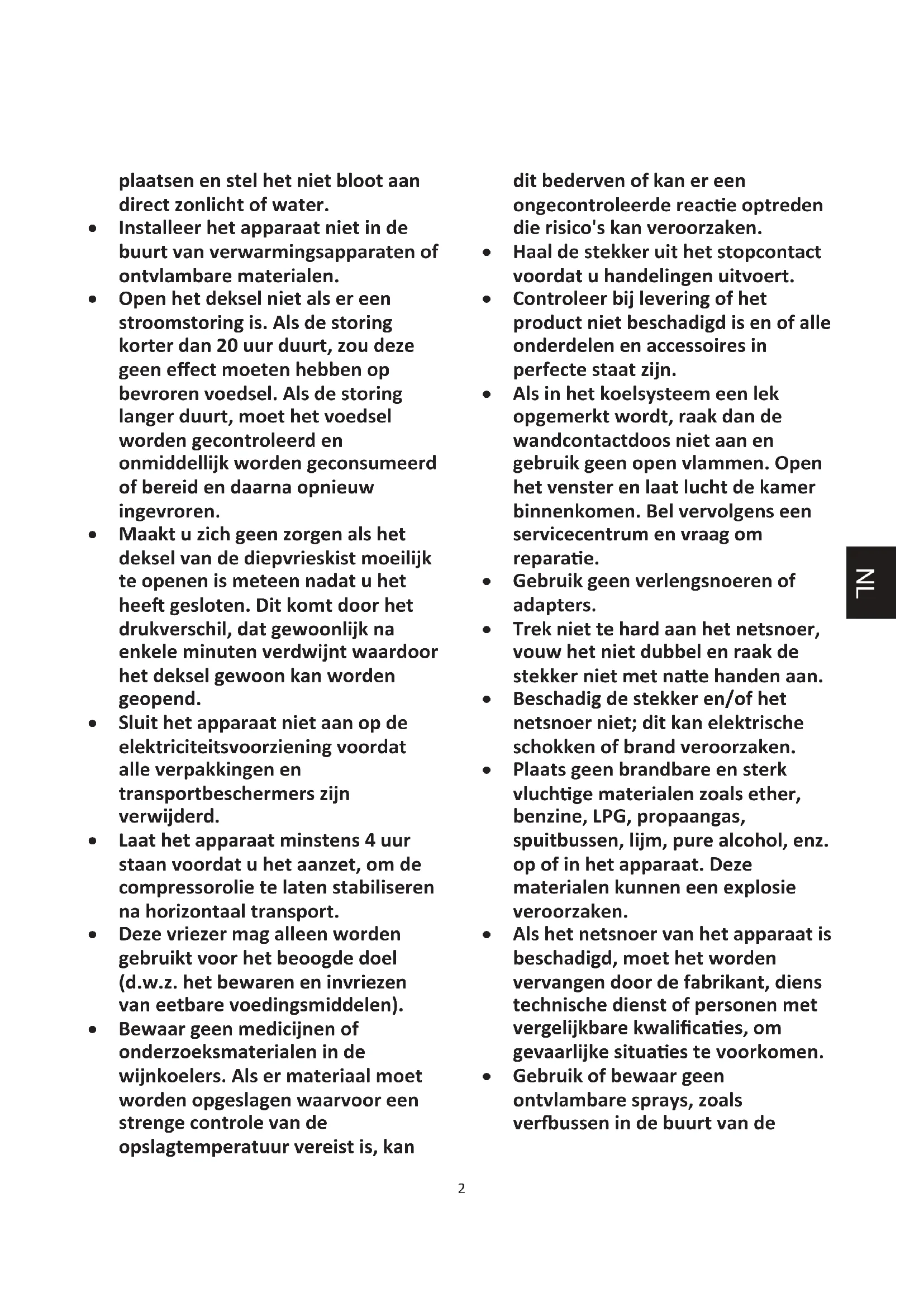 plaatsen en stel het niet bloot aan direct zonlicht of water. x Installeer het apparaat niet in de buurt van verwarmingsapparaten of ontvlambare materialen. x Open het deksel niet als er een stroomstoring is. Als de storing korter dan 20 uur duurt, zou deze geen eīect moeten hebben op bevroren voedsel. Als de storing langer duurt, moet het voedsel worden gecontroleerd en onmiddellijk worden geconsumeerd of bereid en daarna opnieuw ingevroren. x Maakt u zich geen zorgen als het deksel van de diepvrieskist moeilijk te openen is meteen nadat u het heeŌŐesloten. Dit komt door het drukverschil, dat gewoonlijk na enkele minuten verdwijnt waardoor het deksel gewoon kan worden geopend. x Sluit het apparaat niet aan op de elektriciteitsvoorziening voordat alle verpakkingen en transportbeschermers zijn verwijderd. x Laat het apparaat minstens 4 uur staan voordat u het aanzet, om de compressorolie te laten stabiliseren na horizontaal transport. x Deze vriezer mag alleen worden gebruikt voor het beoogde doel (d.w.z. het bewaren en invriezen van eetbare voedingsmiddelen). x Bewaar geen medicijnen of onderzoeksmaterialen in de wijnkoelers. Als er materiaal moet worden opgeslagen waarvoor een strenge controle van de opslagtemperatuur vereist is, kan dit bederven of kan er een ongecontroleerde reacƟe optreden die risico's kan veroorzaken. x Haal de stekker uit het stopcontact voordat u handelingen uitvoert. x Controleer bij levering of het product niet beschadigd is en of alle onderdelen en accessoires in perfecte staat zijn. x Als in het koelsysteem een lek opgemerkt wordt, raak dan de wandcontactdoos niet aan en gebruik geen open vlammen. Open het venster en laat lucht de kamer binnenkomen. Bel vervolgens een servicecentrum en vraag om reparaƟe. x Gebruik geen verlengsnoeren of adapters. x Trek niet te hard aan het netsnoer, vouw het niet dubbel en raak de stekker niet met naƩe handen aan. x Beschadig de stekker en/of het netsnoer niet; dit kan elektrische schokken of brand veroorzaken. x Plaats geen brandbare en sterk vluchƟge materialen zoals ether, benzine, LPG, propaangas, spuitbussen, lijm, pure alcohol, enz. op of in het apparaat. Deze materialen kunnen een explosie veroorzaken. x Als het netsnoer van het apparaat is beschadigd, moet het worden vervangen door de fabrikant, diens technische dienst of personen met vergelijkbare kwaliĮcaƟes, om gevaarlijke situaƟ es te voorkomen. x Gebruik of bewaar geen ontvlambare sprays, zoals verĩƵssen in de buurt van de NL3 wijnkoelers. Deze kunnen een explosie of brand veroorzaken. x Plaats geen voorwerpen en/of houders gevuld met water bovenop het apparaat. x We raden het gebruik van verlengsnoeren en mulƟ-adapters niet aan. x Verbrand het apparaat niet als u het weg wilt doen. Wees voorzichƟg dat u het koelcircuit/de koelleidingen van het apparaat niet beschadigt Ɵjdens het transport en het gebruik. Stel in het geval van schade het apparaat niet bloot aan brand, mogelijke ontstekingsbronnen en venƟleer onmiddellijk de ruimte waarin het apparaat staat. x Het koelsysteem dat zich achter en binnenin de wijnkoelers bevindt, bevat een koelmiddel. Zorg er daarom voor dat de buizen niet beschadigd raken. x Gebruik geen elektrische apparaten in de bewaarruimten voor levensmiddelen van het apparaat, tenzij deze van het type zijn dat door de fabrikant wordt aanbevolen. x Beschadig het koelcircuit niet. x Gebruik geen mechanische apparaten of andere middelen om het ontdooien te versnellen, behalve als deze door de fabrikant worden aanbevolen. x Gebruik geen elektrische apparaten in de bewaarruimten voor levensmiddelen, tenzij deze van het type zijn dat door de fabrikant wordt aanbevolen. x Zorg ervoor dat de venƟůĂƟeopeningen in de behuizing van het apparaat of in de ingebouwde construcƟe open blijven. x Raak geen interne koelelementen aan, met name met naƩe handen. Dit kan brandwonden of andere verwondingen veroorzaken. x Gebruik geen punƟge of scherpe voorwerpen zoals messen of vorken om ijs te verwijderen. x Gebruik nooit haardrogers, elektrische verwarmers of dergelijke elektrische apparaten voor het ontdooien. x Schraap de rijm en de ijsaanslag die optreedt niet af met een mes of scherp voorwerp. Deze kunnen het koelcircuit beschadigen en de lekkage uit het circuit kan brand veroorzaken of uw ogen beschadigen. x Gebruik geen andere mechanische toestellen of apparaten om het ontdooiingsproces te versnellen. x Gebruik absoluut geen open vuur of elektrische apparatuur, zoals verwarmers, stoomreinigers, kaarsen, olielampen en dergelijke om de ontdooiingsfase te versnellen. x Gebruik nooit water om de compressor te reinigen. Veeg deze na het reinigen goed af met een droge doek om roest te voorkomen. x Het wordt aanbevolen om de stekker schoon te houden, te veel stof op de stekker kan brand veroorzaken. x Het product is alleen ontworpen en gebouwd voor huishoudelijk gebruik. NL4 x De garanƟe vervalt als het product wordt geïnstalleerd of gebruikt in commerciële of niet-residenƟële huishoudelijke omgevingen. x Het product moet op de juiste manier worden geïnstalleerd, geplaatst en gebruikt, volgens de instrucƟes in de bijgeleverde handleiding. x De garanƟe geldt alleen op nieuwe producten en is niet overdraagbaar als het product wordt doorverkocht. x Ons bedrijf wijst iedere aansprakelijkheid voor incidentele of gevolgschade van de hand. x De garanƟe vermindert op geen enkele wijze uw statutaire of weƩelijke rechten. x Voer geen reparaƟes uit aan deze wijnkoelers. Alle ingrepen mogen uitsluitend door gekwaliĮceerd personeel worden uitgevoerd. x Kinderen in de leeŌijd van 3 tot 8 jaar mogen dit apparaat in- en uitladen. x WAARSCHUWING! Verzeker bij het opstellen van dit apparaat dat het snoer niet bekneld zit of beschadigd is. x WAARSCHUWING! Gebruik geen meervoudige stekkerdozen of draagbare voedingsbronnen aan de achterkant van het apparaat. x Om verontreiniging van voedsel te vermijden, gelieve de volgende instrucƟes in ach t te ne