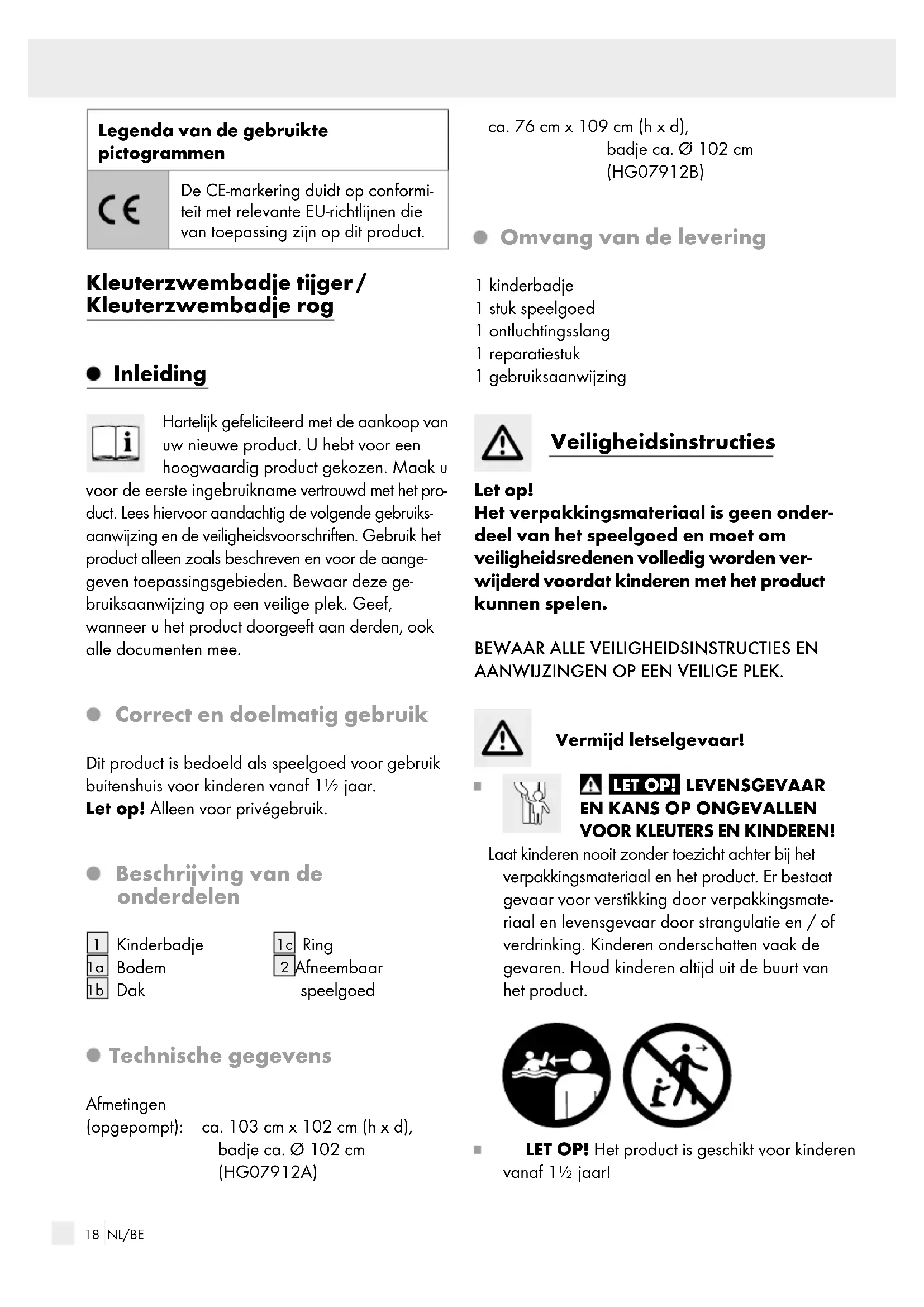 Afneembaar speelgoed Technische gegevens Afmetingen (opgepompt): ca. 103 cm x 102 cm (h x d), badje ca. Ø 102 cm (HG07912A) ca. 76 cm x 109 cm (h x d), badje ca. Ø 102 cm (HG07912B) Omvang van de levering 1 kinderbadje 1 stuk speelgoed 1 ontluchtingsslang 1 reparatiestuk 1 gebruiksaanwijzing Veiligheidsinstructies Let op! Het verpakkingsmateriaal is geen onder- deel van het speelgoed en moet om veiligheidsredenen volledig worden ver- wijderd voordat kinderen met het product kunnen spelen.