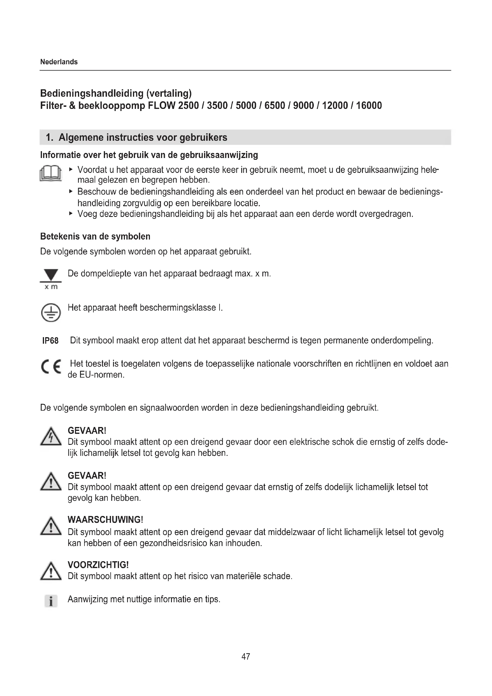 maal gelezen en begrepen hebben. ▶ Beschouw de bedieningshandleiding als een onderdeel van het product en bewaar de bedienings- handleiding zorgvuldig op een bereikbare locatie. ▶ Voeg deze bedieningshandleiding bij als het apparaat aan een derde wordt overgedragen. Betekenis van de symbolen De volgende symbolen worden op het apparaat gebruikt. De dompeldiepte van het apparaat bedraagt max. x m. Het apparaat heeft beschermingsklasse I. Dit symbool maakt erop attent dat het apparaat beschermd is tegen permanente onderdompeling. Het toestel is toegelaten volgens de toepasselijke nationale voorschriften en richtlijnen en voldoet aan de EU-normen. De volgende symbolen en signaalwoorden worden in deze bedieningshandleiding gebruikt. GEVAAR! Dit symbool maakt attent op een dreigend gevaar door een elektrische schok die ernstig of zelfs dode