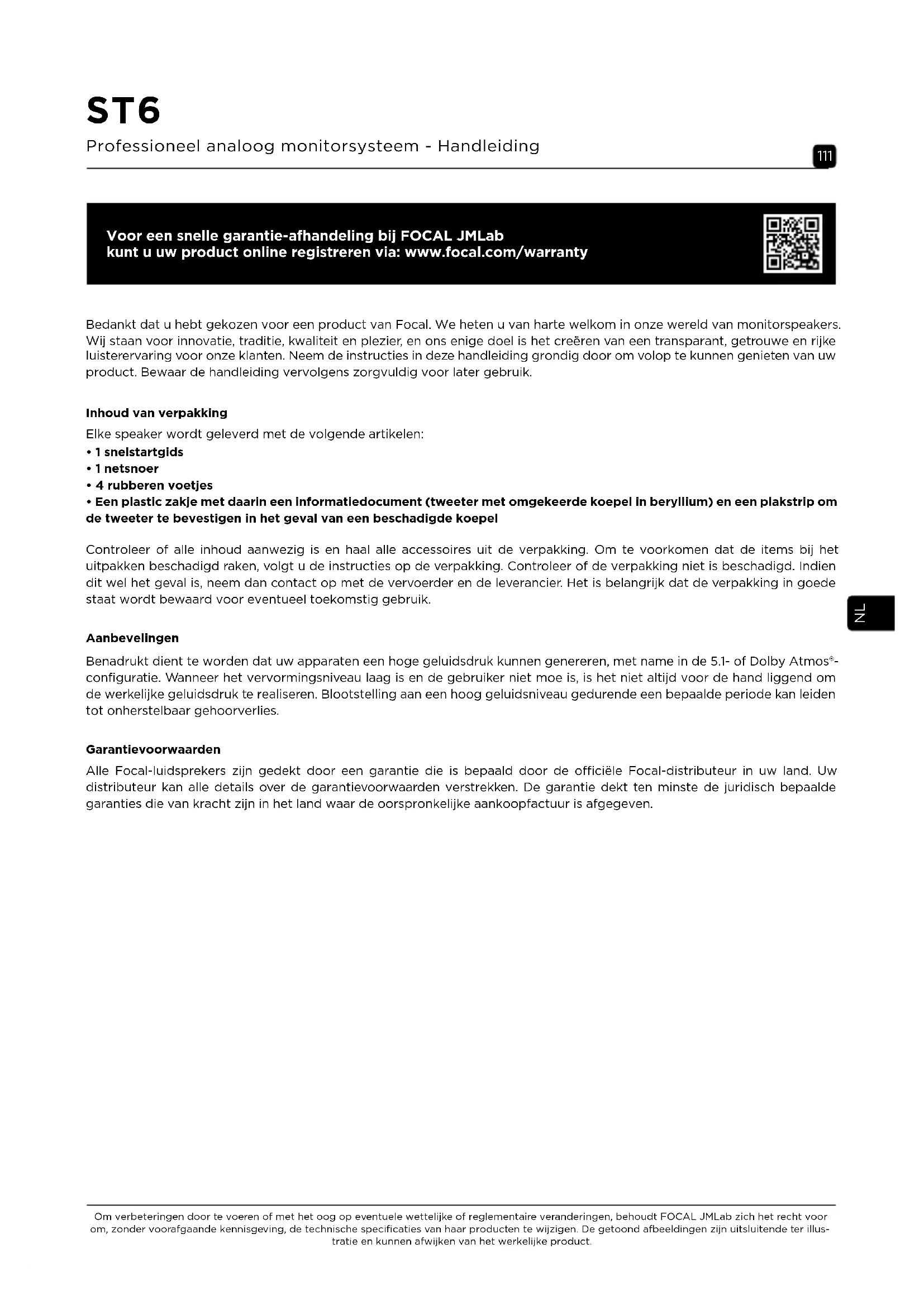 - Een plastic zakje met daarin een informatiedocument (tweeter met omgekeerde koepel in beryllium) en een plakstrip om de tweeter te bevestigen in het geval van een beschadigde koepel Controleer of alle inhoud aanwezig is en haal alle accessoires uit de verpakking. Om te voorkomen dat de items bij het uitpakken beschadigd raken, volgt u de instructies op de verpakking. Controleer of de verpakking niet is beschadigd. Indien dit wel het geval is, neem dan contact op met de vervoerder en de leverancier. Het is belangrijk dat de verpakking in goede staat wordt bewaard voor eventueel toekomstig gebruik. Aanbevelingen Benadrukt dient te worden dat uw apparaten een hoge geluidsdruk kunnen genereren, met name in de 5.1- of Dolby Atmos®- configuratie. Wanneer het vervormingsniveau laag is en de gebruiker niet moe is, is het niet altijd voor de hand liggend om de werkelijke geluidsdruk te realiseren. Blootstelling aan een hoog geluidsniveau gedurende een bepaalde periode kan leiden tot onherstelbaar gehoorverlies. Garantievoorwaarden Alle Focal-luidsprekers zijn gedekt door een garantie die is bepaald door de ociële Focal-distributeur in uw land. Uw distributeur kan alle details over de garantievoorwaarden verstrekken. De garantie dekt ten minste de juridisch bepaalde garanties die van kracht zijn in het land waar de oorspronkelijke aankoopfactuur is afgegeven.112 ST6 Professioneel analoog monitorsysteem - Handleiding