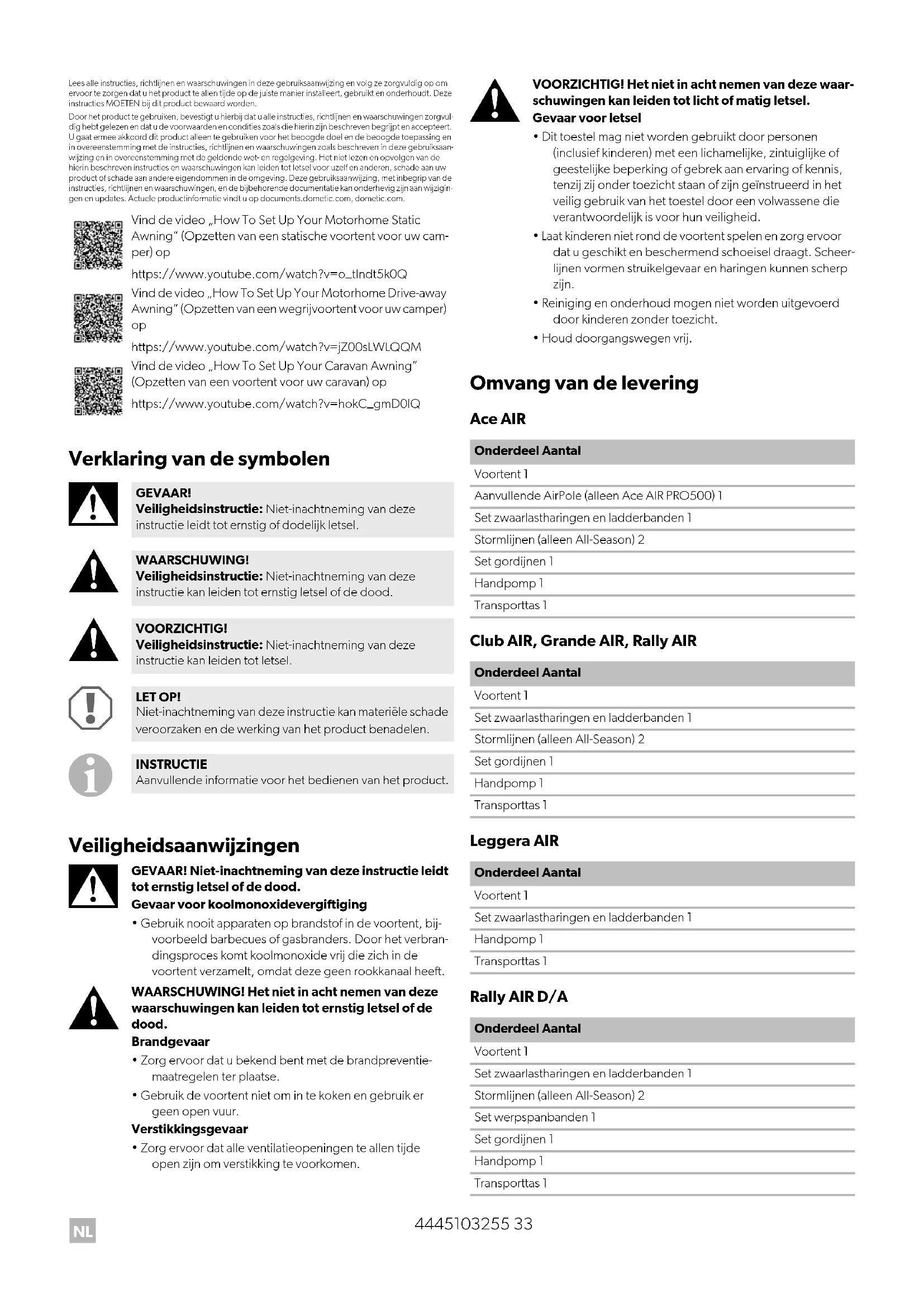 https://www.youtube.com/watch?v=jZ00sLWLQQM Vind de video „How To Set Up Your Caravan Awning” (Opzetten van een voortent voor uw caravan) op https://www.youtube.com/watch?v=hokC_gmD0lQ GEVAAR! Veiligheidsinstructie: Niet-inachtneming van deze instructie leidt tot ernstig of dodelijk letsel. WAARSCHUWING! Veiligheidsinstructie: Niet-inachtneming van deze instructie kan leiden tot ernstig letsel of de dood. VOORZICHTIG! Veiligheidsinstructie: Niet-inachtneming van deze instructie kan leiden tot letsel. LET OP! Niet-inachtneming van deze instructie kan materiële schade veroorzaken en de werking van het product benadelen. INSTRUCTIE Aanvullende informatie voor het bedienen van het product. Onderdeel Aantal Voortent 1 Aanvullende AirPole (alleen Ace AIR PRO500) 1 Set zwaarlastharingen en ladderbanden 1 Stormlijnen (alleen All-Season) 2 Set gordijnen 1 Handpomp 1 Transporttas 1 Onderdeel Aantal Voortent 1 Set zwaarlastharingen en ladderbanden 1 Stormlijnen (alleen All-Season) 2 Set gordijnen 1 Handpomp 1 Transporttas 1 Onderdeel Aantal Voortent 1 Set zwaarlastharingen en ladderbanden 1 Handpomp 1 Transporttas 1 Onderdeel Aantal Voortent 1 Set zwaarlastharingen en ladderbanden 1 Stormlijnen (alleen All-Season) 2 Set werpspanbanden 1 Set gordijnen 1 Handpomp 1 Transporttas 1NL
