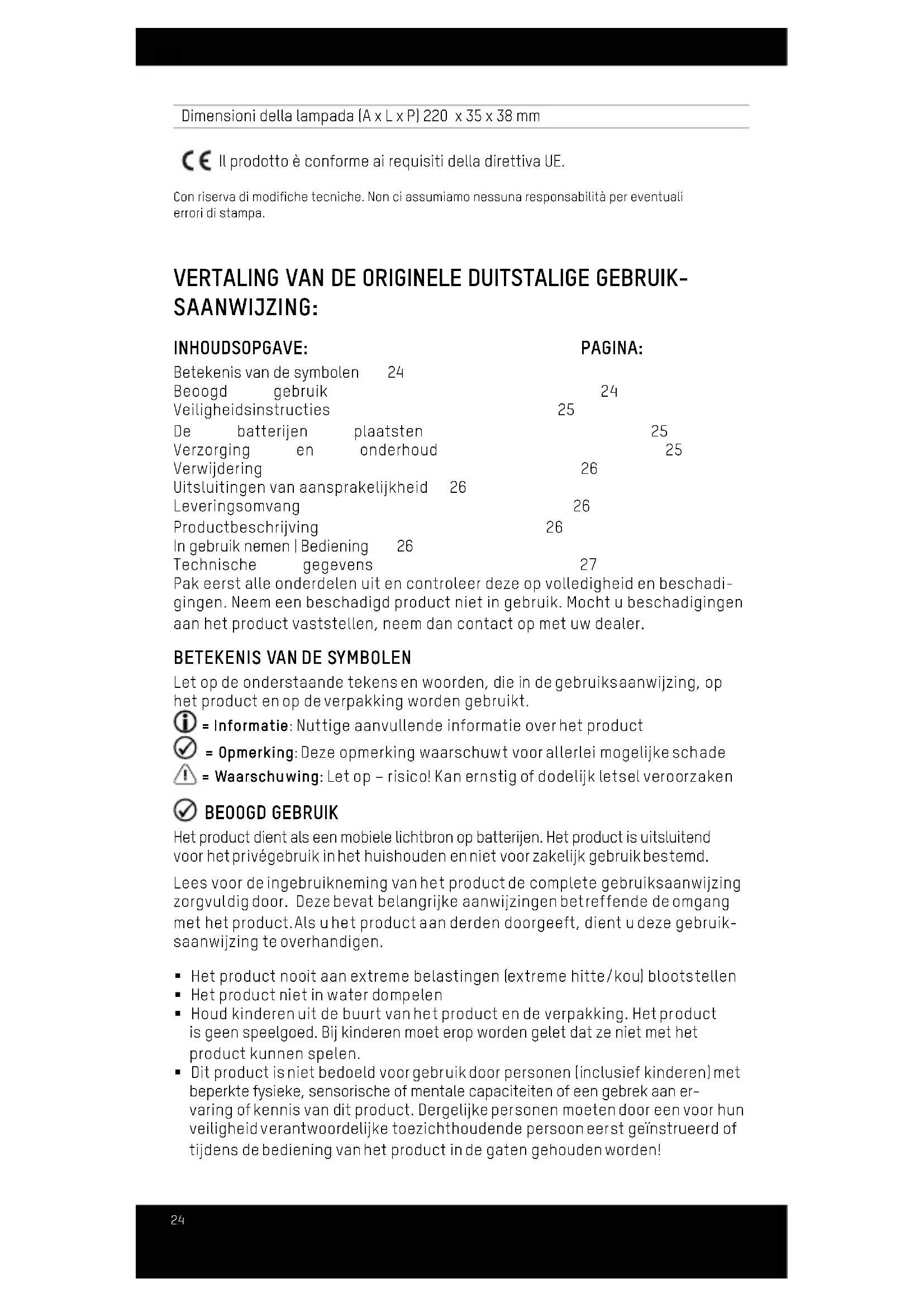 SAANWIJZING: INHOUDSOPGAVE: PAGINA: Betekenis van de symbolen 24 Beoogd gebruik 24 Veiligheidsinstructies 25 De batterijen plaatsten 25 Verzorging en onderhoud 25 Verwijdering 26 Uitsluitingen van aansprakelijkheid 26 Leveringsomvang 26 Productbeschrijving 26 In gebruik nemen | Bediening 26 Technische gegevens 27 Pak eerst alle onderdelen uit en controleer deze op volledigheid en beschadi- gingen. Neem een beschadigd product niet in gebruik. Mocht u beschadigingen aan het product vaststellen, neem dan contact op met uw dealer.