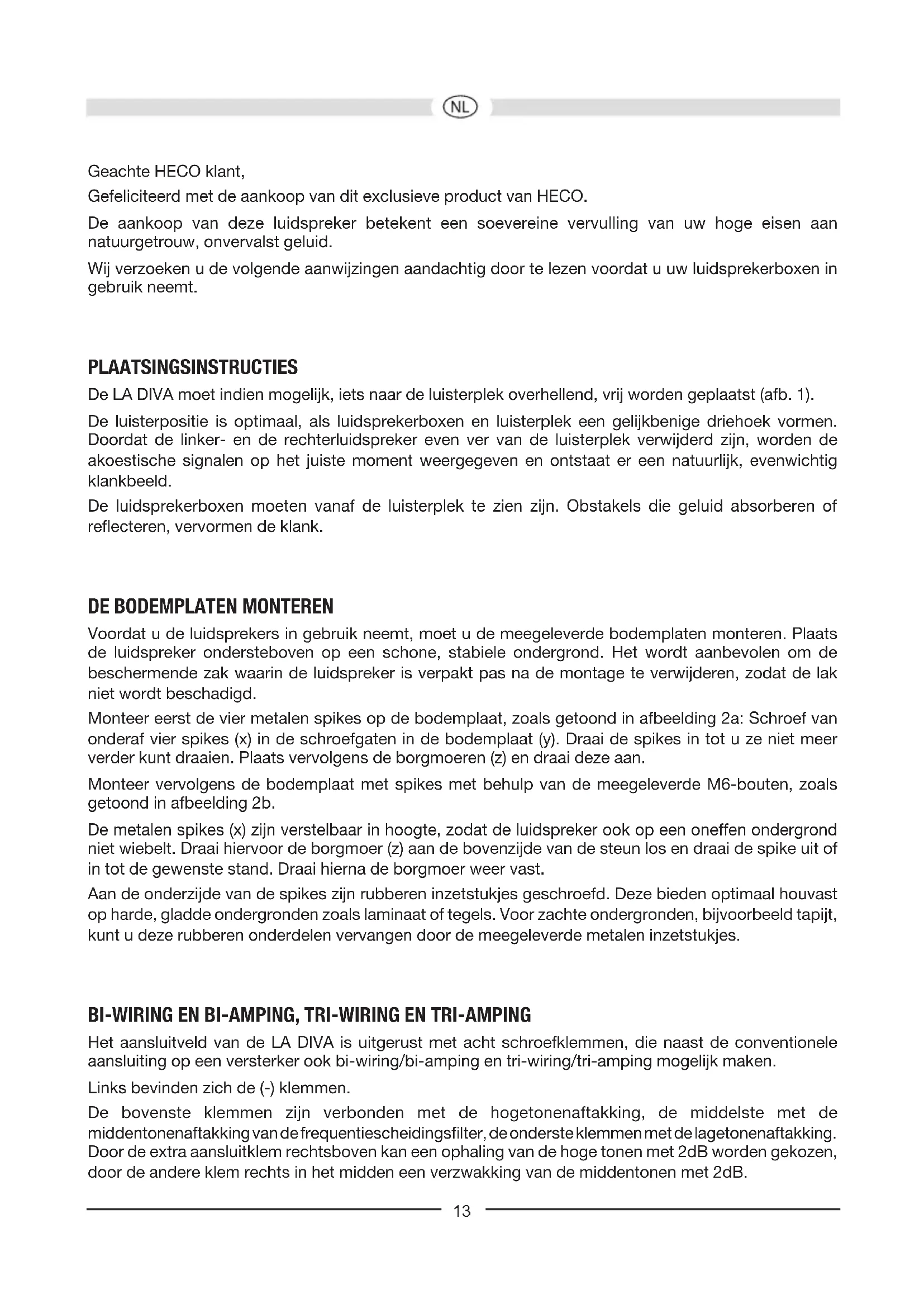 Het aansluitveld van de LA DIVA is uitgerust met acht schroefklemmen, die naast de conventionele aansluiting op een versterker ook bi-wiring/bi-amping en tri-wiring/tri-amping mogelijk maken. Links bevinden zich de (-) klemmen. De bovenste klemmen zijn verbonden met de hogetonenaftakking, de middelste met de middentonenaftakking van de frequentiescheidingsfilter, de onderste klemmen met de lagetonenaftakking. Door de extra aansluitklem rechtsboven kan een ophaling van de hoge tonen met 2dB worden gekozen, door de andere klem rechts in het midden een verzwakking van de middentonen met 2dB.14 De passende instelling is afhankelijk van het luistervertrek, van de plaatsing van de luidsprekers en natuurlijk ook van de persoonlijke smaak. Bij vertrekken met sterke demping (b.v. zware gestoffeerde meubels en gordijnen) wordt de +2dB-instelling voor hoge tonen aangeraden, bij plaatsing dichtbij de achterwand en vertrekken met minder demping de -2dB-instelling voor middentonen. Bi-wiring betekent dat hoge en lage frequenties over aparte leidingen worden getransporteerd. De bi-amping-methode vraagt behalve de tweede leiding om een extra tweede eindversterker. Tri-wiring vereist een derde leiding, tri-amping een extra derde versterker. Bij de levering zijn 4 kabelbruggen inbegrepen. Verbind a.u.b. de luidsprekerklemmen voor conventioneel gebruik met de Y-kabelbruggen (1 kabelschoen en 2 banaanstekkers) conform afb. 3 a – d. Voor bi-wiring en bi-amping gebruikt u de andere kabelbruggen (1 kabelschoen en 1 banaanstekker) zoals te zien in afb. 3 e – l. Voor tri-wiring- en tri-amping-gebruik mogen geen bruggen gemonteerd zijn. De aansluiting op de versterker(s) wordt getoond in de afbeeldingen 3 m – t. AANSLUITEN VAN UW HECO LA DIVA LUIDSPREKERBOXEN Waarschuwing: op de terminal van de LA DIVA luidsprekers mogen uitsluitend de luidsprekeruitgangen van Hifi-versterkers aangesloten worden! Voor het aansluiten van de luidsprekerboxen heeft u speciale bij de vakhandel verkrijgbare luidsprekerkabels nodig. Om klankverlies te voorkomen, adviseren wij voor kabels tot 3 m een kabeldiameter van minimaal 2,5 mm² en voor langere kabels een kabeldiameter van minimaal 4 mm². De versterker resp. receiver moet principieel uitgeschakeld blijven tot alle verbindingen tot stand zijn gebracht. Voor het afmeten van de juiste kabellengte moeten de luidsprekerboxen op hun uiteindelijke standplaats staan. Voor beide kanalen moeten even lange kabels worden gebruikt. Let er bij het aansluiten van de kabels vooral op dat u de polen niet omdraait, d.w.z. de zwarte (-) klemmen van de luidsprekerboxen moeten verbonden worden met de (-) klemmen van de versterker en de rode (+) klemmen van de luidsprekerboxen met de (+) klemmen van de versterker. Om het aansluiten in fase te vergemakkelijken, is bij de meeste luidsprekerkabels één kabelader voorzien van een randje of gemarkeerd met een gekleurde streep. De LA DIVA terminal is ontworpen voor 3 kabeluitvoeringen: