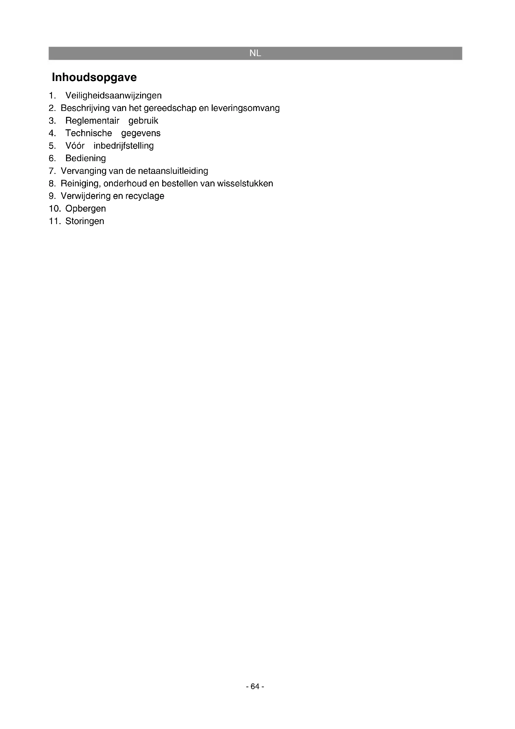 - Schade aan het apparaat als gevolg van niet-inachtneming van de montagehandleiding of op grond van ondeskundige installatie, als gevolg van niet-inachtneming van de gebruiksaanwijzing (zoals bijv. door aansluiting aan een verkeerde netspanning of stroomsoort) of niet-inachtneming van de onderhouds- en veiligheidsvoorschriften, door blootstelling van het apparaat aan abnormale omgevingsvoorwaarden of door nalatig onderhoud en verzorging. - Schade aan het apparaat als gevolg van misbruik of ondeskundige toepassingen (zoals bijv. over- belasting van het apparaat of de inzet van niet toegelaten gereedschappen of toebehoren), binnen- dringen van vreemde voorwerpen in het apparaat (zoals bijv. zand, stenen of stof, transportschade), gebruik van geweld of als gevolg van externe invloeden (zoals bijv. schade door vallen). - Schade aan het apparaat of aan delen van het apparaat die valt te herleiden tot slijtage als gevolg van gebruik, en als gevolg van normale of andere natuurlijke slijtage.