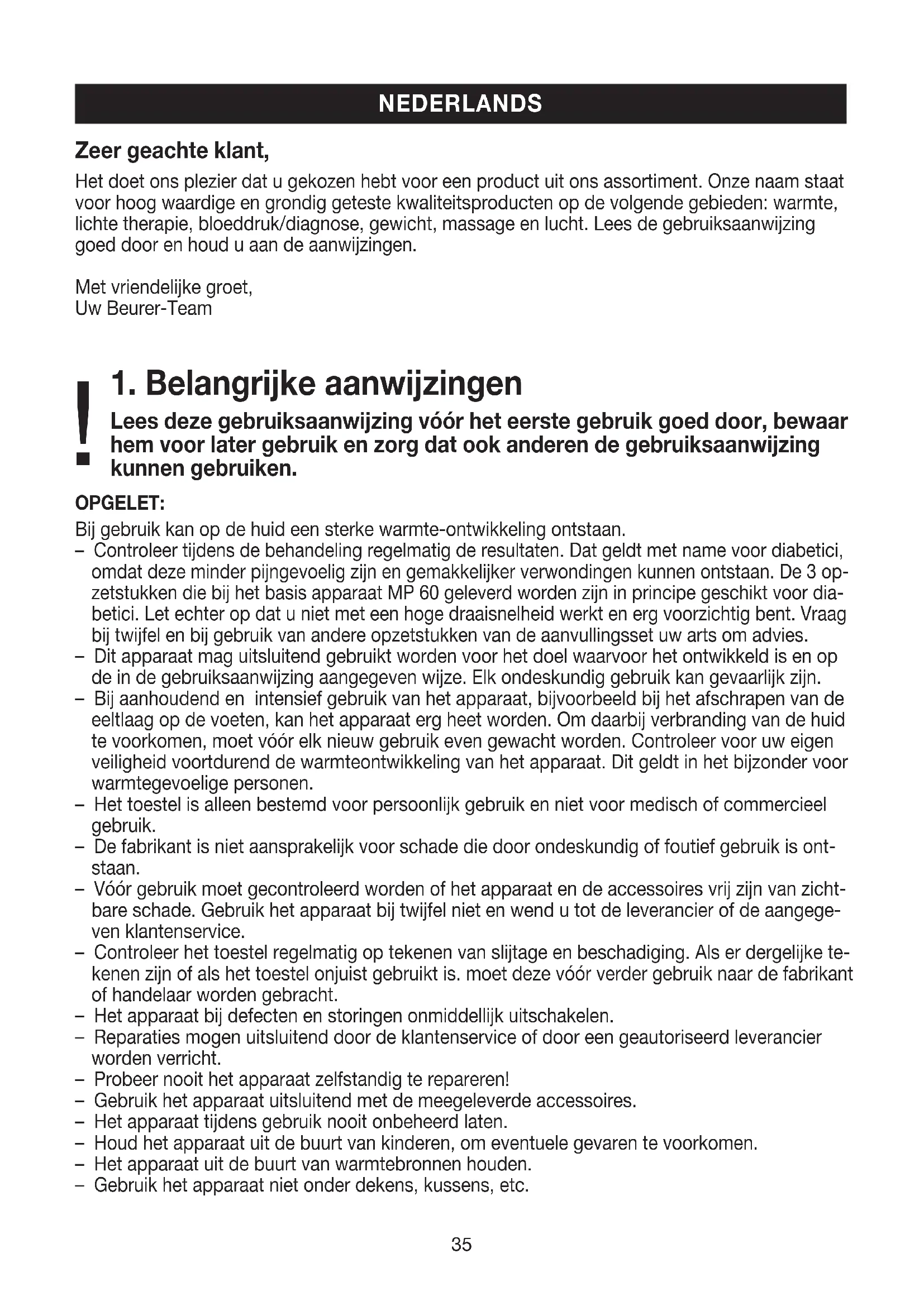 Lees deze gebruiksaanwijzing vóór het eerste gebruik goed door, bewaar hem voor later gebruik en zorg dat ook anderen de gebruiksaanwijzing kunnen gebruiken. OPGELET: Bij gebruik kan op de huid een sterke warmte-ontwikkeling ontstaan. – Controleer tijdens de behandeling regelmatig de resultaten. Dat geldt met name voor diabetici, omdat deze minder pijngevoelig zijn en gemakkelijker verwondingen kunnen ontstaan. De 3 op- zetstukken die bij het basis apparaat MP 60 geleverd worden zijn in principe geschikt voor dia- betici. Let echter op dat u niet met een hoge draaisnelheid werkt en erg voorzichtig bent. Vraag bij twijfel en bij gebruik van andere opzetstukken van de aanvullingsset uw arts om advies. – Dit apparaat mag uitsluitend gebruikt worden voor het doel waarvoor het ontwikkeld is en op de in de gebruiksaanwijzing aangegeven wijze. Elk ondeskundig gebruik kan gevaarlijk zijn. – Bij aanhoudend en intensief gebruik van het apparaat, bijvoorbeeld bij het afschrapen van de eeltlaag op de voeten, kan het apparaat erg heet worden. Om daarbij verbranding van de huid te voorkomen, moet vóór elk nieuw gebruik even gewacht worden. Controleer voor uw eigen veiligheid voortdurend de warmteontwikkeling van het apparaat. Dit geldt in het bijzonder voor warmtegevoelige personen. – Het toestel is alleen bestemd voor persoonlijk gebruik en niet voor medisch of commercieel gebruik. – De fabrikant is niet aansprakelijk voor schade die door ondeskundig of foutief gebruik is ont- staan. – Vóór gebruik moet gecontroleerd worden of het apparaat en de accessoires vrij zijn van zicht- bare schade. Gebruik het apparaat bij twijfel niet en wend u tot de leverancier of de aangege- ven klantenservice. – Controleer het toestel regelmatig op tekenen van slijtage en beschadiging. Als er dergelijke te- kenen zijn of als het toestel onjuist gebruikt is. moet deze vóór verder gebruik naar de fabrikant of handelaar worden gebracht. – Het apparaat bij defecten en storingen onmiddellijk uitschakelen. – Reparaties mogen uitsluitend door de klantenservice of door een geautoriseerd leverancier worden verricht. – Probeer nooit het apparaat zelfstandig te repareren! – Gebruik het apparaat uitsluitend met de meegeleverde accessoires. – Het apparaat tijdens gebruik nooit onbeheerd laten. – Houd het apparaat uit de buurt van kinderen, om eventuele gevaren te voorkomen. – Het apparaat uit de buurt van warmtebronnen houden. – Gebruik het apparaat niet onder dekens, kussens, etc. NEDERLANDS !36 – Het apparaat mag niet langer dan 15 minuten ononderbroken gebruikt worden. Na die tijd dient een pauze van minimaal 30 minuten te worden ingelast om oververhitting van de motor te voorkomen. – Gebruik het apparaat niet terwijl u een bad of douche neemt. Bewaar het apparaat niet op een plaats van waaruit het in de badkuip of wastafel kan vallen. – Het apparaat nooit onderdompelen in water of andere vloeistoffen. – Als het apparaat in het water is gevallen onmiddellijk de stekker uit het stopcontact halen. – De handen moeten voor elk gebruik van het apparaat en de stekker droog zijn. – Niet aan de stroomkabel of het apparaat trekken om de stekker uit het stopcontact te trekken. – De stekker mag uitsluitend gebruikt worden met de erop vermelde netspanning. – De adapter niet meer gebruiken als het snoer beschadigd is! – Dit apparaat is niet bestemd voor het gebruik door personen (inclusief kinderen) met beperkte fysieke, sensorische of geestelijke vaardigheden of een gebrek aan ervaring en/of aan kennis, tenzij zij onder toezicht staan van of instructies kregen betreffende het gebruik van het ap- paraat van een voor hun veiligheid verantwoordelijke persoon. – Er dient op gelet te worden, dat kinderen niet met het apparaat spelen. – Het apparaat mag om hygiënische redenen slechts bij één persoon gebruikt worden.