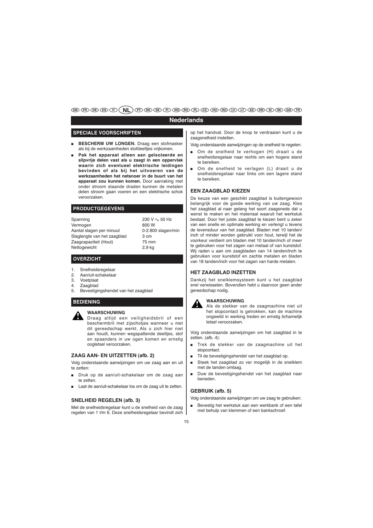Nederlands op het handvat. Door de knop te verdraaien kunt u de zaagsnelheid instellen. SPECIALE VOORSCHRIFTEN