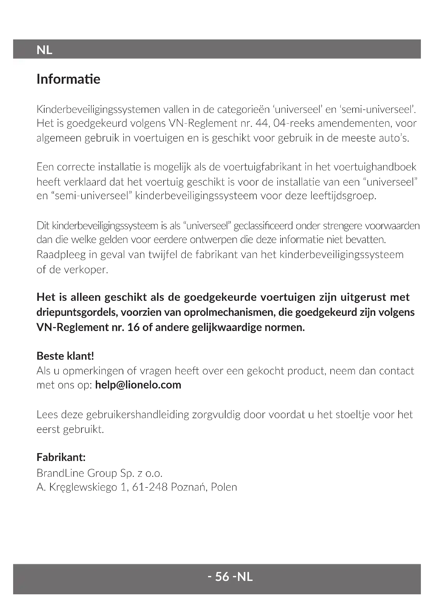 Informae Kinderbeveiligingssystemen vallen in de categorieën ‘universeel’ en ‘semi-universeel’. Het is goedgekeurd volgens VN-Reglement nr. 44, 04-reeks amendementen, voor algemeen gebruik in voertuigen en is geschikt voor gebruik in de meeste auto’s. Een correcte installae is mogelijk als de voertuigfabrikant in het voertuighandboek hee verklaard dat het voertuig geschikt is voor de installae van een “universeel” en “semi-universeel” kinderbeveiligingssysteem voor deze leeijdsgroep. Dit kinderbeveiligingssysteem is als “universeel” geclassiceerd onder strengere voorwaarden dan die welke gelden voor eerdere ontwerpen die deze informae niet bevaen. Raadpleeg in geval van twijfel de fabrikant van het kinderbeveiligingssysteem of de verkoper. Het is alleen geschikt als de goedgekeurde voertuigen zijn uitgerust met driepuntsgordels, voorzien van oprolmechanismen, die goedgekeurd zijn volgens VN-Reglement nr. 16 of andere gelijkwaardige normen. Beste klant! Als u opmerkingen of vragen hee over een gekocht product, neem dan contact met ons op: help@lionelo.com Lees deze gebruikershandleiding zorgvuldig door voordat u het stoeltje voor het eerst gebruikt. Fabrikant: BrandLine Group Sp. z o.o. A. Kręglewskiego 1, 61-248 Poznań, Polen‑ 57 ‑ NL Belangrijke informae Lees deze handleiding voor gebruik en bewaar hem. De instruces helpen u bij het correct installeren van het stoeltje. Een verkeerde installae kan de gezondheid van uw kind in gevaar brengen. De fabrikant is niet verantwoordelijk voor mogelijke risico’s als gevolg van een verkeerde installae van het stoeltje. Dit stoeltje is bedoeld voor gewichtsgroep I, II i III, wat betekent dat kinderen van 9 tot 36 kg er gebruik van kunnen maken. I gewichtsgroep: 9-18 kg, II gewichtsgroep: 15-25 kg, III gewichtsgroep: 22-36 kg.