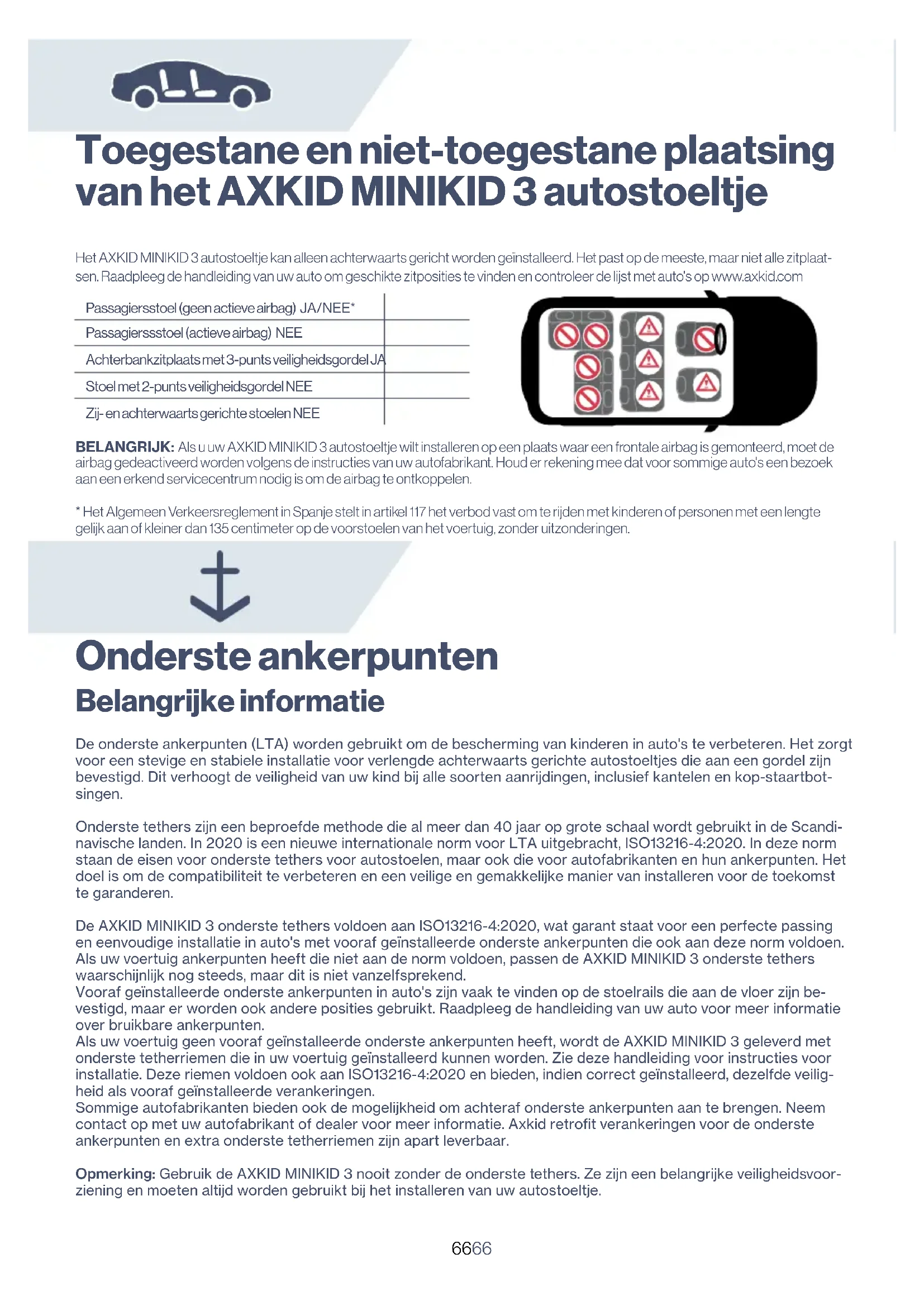 - Het Algemeen Verkeersreglement in Spanje stelt in artikel 117 het verbod vast om te rijden met kinderen of personen met een lengte gelijk aan of kleiner dan 135 centimeter op de voorstoelen van het voertuig, zonder uitzonderingen. Onderste ankerpunten Belangrijke informatie De onderste ankerpunten (LTA) worden gebruikt om de bescherming van kinderen in auto's te verbeteren. Het zorgt voor een stevige en stabiele installatie voor verlengde achterwaarts gerichte autostoeltjes die aan een gordel zijn bevestigd. Dit verhoogt de veiligheid van uw kind bij alle soorten aanrijdingen, inclusief kantelen en kop-staartbot- singen. Onderste tethers zijn een beproefde methode die al meer dan 40 jaar op grote schaal wordt gebruikt in de Scandi- navische landen. In 2020 is een nieuwe internationale norm voor LTA uitgebracht, ISO13216-4:2020. In deze norm staan de eisen voor onderste tethers voor autostoelen, maar ook die voor autofabrikanten en hun ankerpunten. Het doel is om de compatibiliteit te verbeteren en een veilige en gemakkelijke manier van installeren voor de toekomst te garanderen. De AXKID MINIKID 3 onderste tethers voldoen aan ISO13216-4:2020, wat garant staat voor een perfecte passing en eenvoudige installatie in auto's met vooraf geïnstalleerde onderste ankerpunten die ook aan deze norm voldoen. Als uw voertuig ankerpunten heeft die niet aan de norm voldoen, passen de AXKID MINIKID 3 onderste tethers waarschijnlijk nog steeds, maar dit is niet vanzelfsprekend. Vooraf geïnstalleerde onderste ankerpunten in auto's zijn vaak te vinden op de stoelrails die aan de vloer zijn be- vestigd, maar er worden ook andere posities gebruikt. Raadpleeg de handleiding van uw auto voor meer informatie over bruikbare ankerpunten. Als uw voertuig geen vooraf geïnstalleerde onderste ankerpunten heeft, wordt de AXKID MINIKID 3 geleverd met onderste tetherriemen die in uw voertuig geïnstalleerd kunnen worden. Zie deze handleiding voor instructies voor installatie. Deze riemen voldoen ook aan ISO13216-4:2020 en bieden, indien correct geïnstalleerd, dezelfde veilig- heid als vooraf geïnstalleerde verankeringen. Sommige autofabrikanten bieden ook de mogelijkheid om achteraf onderste ankerpunten aan te brengen. Neem contact op met uw autofabrikant of dealer voor meer informatie. Axkid retrofit verankeringen voor de onderste ankerpunten en extra onderste tetherriemen zijn apart leverbaar. Opmerking: Gebruik de AXKID MINIKID 3 nooit zonder de onderste tethers. Ze zijn een belangrijke veiligheidsvoor- ziening en moeten altijd worden gebruikt bij het installeren van uw autostoeltje.6767