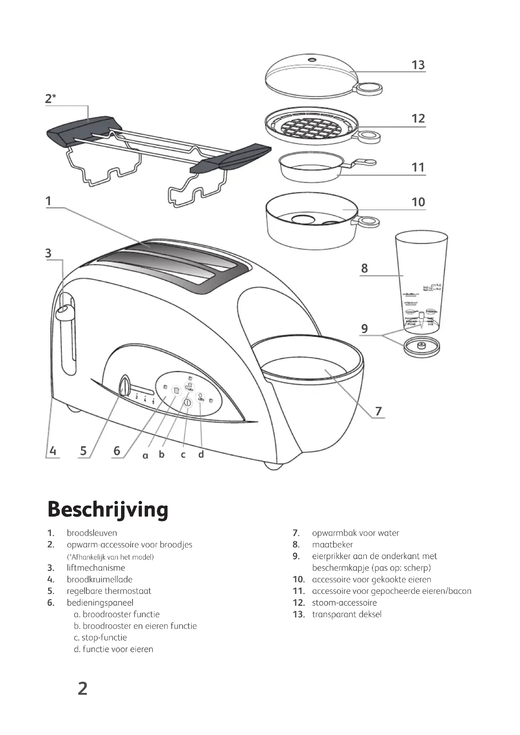 Réf. NC00013044 • Tefal • Sous réserve de modifications • Conception & réalisation : JPM & Associés • marketing-design-communication • 09/2009 TOASTN'EGG-NC00013044:Mise en page 1 16/10/09 10:38 Page bBeschrijving broodsleuven opwarm-accessoire voor broodjes (*Afhankelijk van het model) liftmechanisme broodkruimellade regelbare thermostaat bedieningspaneel a. broodrooster functie b. broodrooster en eieren functie c. stop-functie d. functie voor eieren