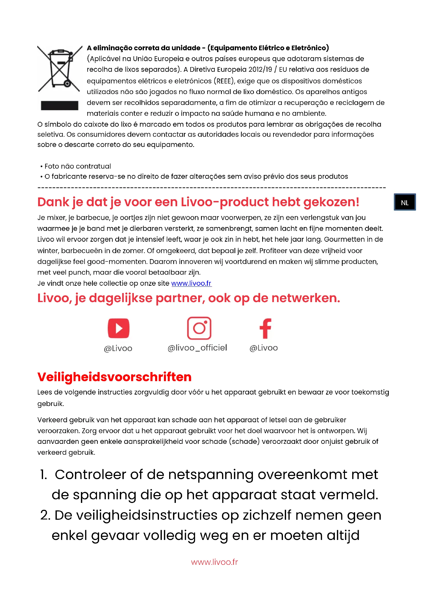 Dank je dat je voor een Livoo-product hebt gekozen! Je mixer, je barbecue, je oortjes zijn niet gewoon maar voorwerpen, ze zijn een verlengstuk van jou waarmee je je band met je dierbaren versterkt, ze samenbrengt, samen lacht en fijne momenten deelt. Livoo wil ervoor zorgen dat je intensief leeft, waar je ook zin in hebt, het hele jaar lang. Gourmetten in de winter, barbecueën in de zomer. Of omgekeerd, dat bepaal je zelf. Profiteer van deze vrijheid voor dagelijkse feel good-momenten. Daarom innoveren wij voortdurend en maken wij slimme producten, met veel punch, maar die vooral betaalbaar zijn. Je vindt onze hele collectie op onze site www.livoo.fr Livoo, je dagelijkse partner, ook op de netwerken.