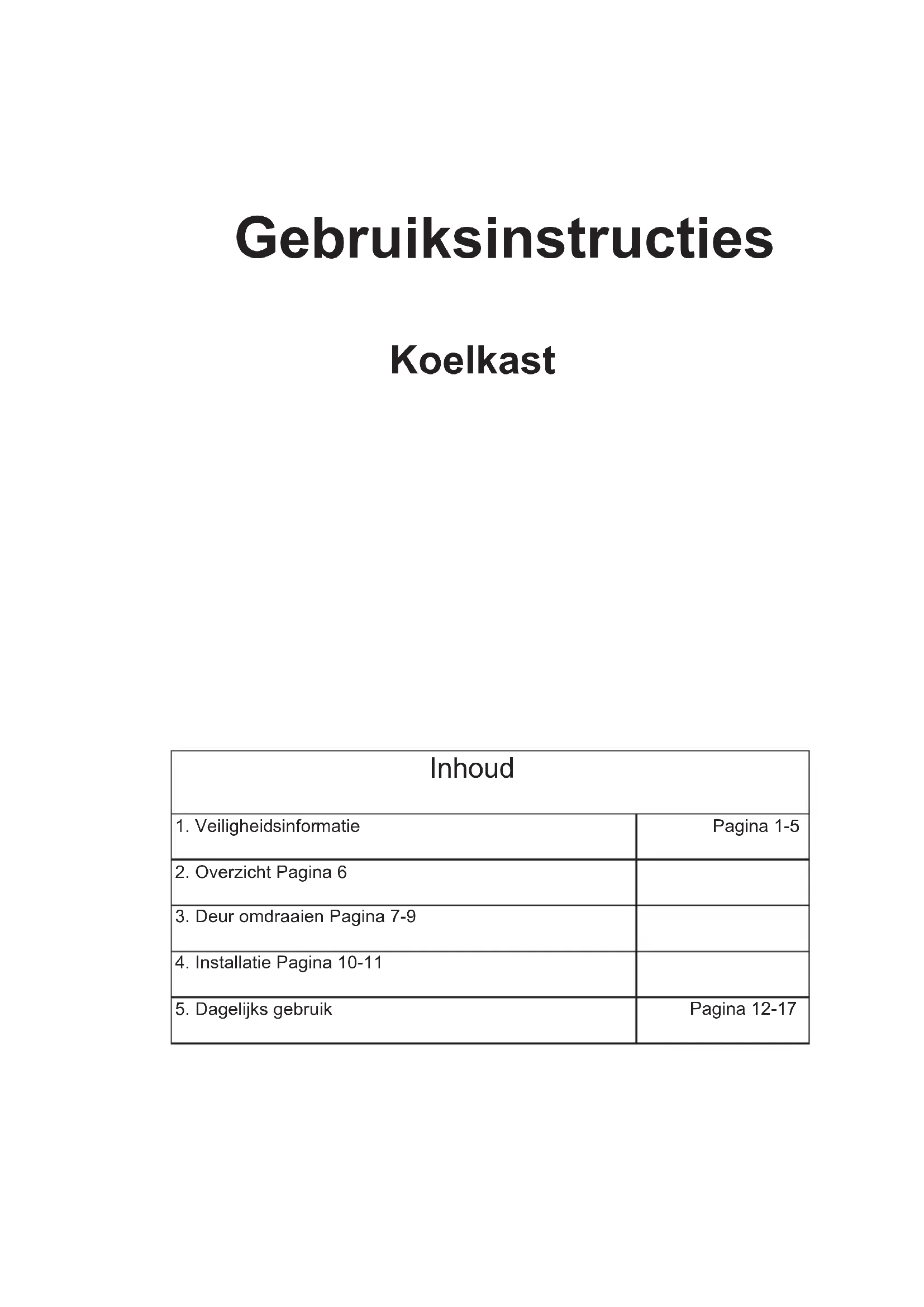 2. Overzicht Pagina 6 3. Deur omdraaien Pagina 7-9 4. Installatie Pagina 10-11 5. Dagelijks gebruikPagina 12-17Veiligheidsinformatie Uit veiligheidsoverwegingen en om zeker te zijn dat het apparaat correct wordt gebruikt, moet u voor de installatie en de eerste ingebruikname deze handleiding en de hints en waarschuwingen zorgvuldig lezen. Om onnodige vergissingen en ongelukken te voorkomen, is het van essentieel belang ervoor te zorgen dat alle personen die het apparaat gebruiken volledig vertrouwd zijn met de werking en de veiligheidsfuncties. Bewaar deze instructies en zorg ervoor dat ze bij het apparaat blijven wanneer het wordt verhuisd of verkocht zodat iedereen die het gebruikt tijdens de levensduur correct op de hoogte is over het gebruik en de veiligheid van het apparaat. Voor de veiligheid van personen en eigendom moet u de voorzorgsmaatregelen vermeld in deze handleiding volgen aangezien de fabrikant niet verantwoordelijk kan worden gesteld voor schade veroorzaakt door nalatigheid. De veiligheid van kinderen en kwetsbare personen