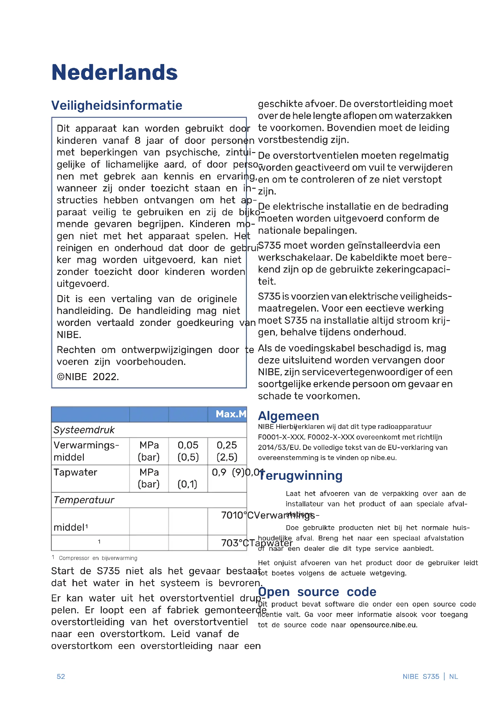 Priežiūros darbai turi būti atliekami tik laikantis įrangos gamintojo rekomendacijų. Techninės priežiūros ir remonto darbai, kurių metu reikalinga kito išmokyto asmens pagalba, turi būti atliekami prižiūrint asmeniui, turinčiam įgaliojimą dirbti su degiais šaltnešiais. Techninės priežiūros ir remonto darbai, reikalaujantys kitokių įgūdžių turinčio asmens pagalbos, turi būti atliekami prižiūrint atitinkamam specialistui. 51NIBE S735Veiligheidsinformatie Dit apparaat kan worden gebruikt door kinderen vanaf 8 jaar of door personen met beperkingen van psychische, zintui- gelijke of lichamelijke aard, of door perso- nen met gebrek aan kennis en ervaring, wanneer zij onder toezicht staan en in- structies hebben ontvangen om het ap- paraat veilig te gebruiken en zij de bijko- mende gevaren begrijpen. Kinderen mo- gen niet met het apparaat spelen. Het reinigen en onderhoud dat door de gebrui- ker mag worden uitgevoerd, kan niet zonder toezicht door kinderen worden uitgevoerd. Dit is een vertaling van de originele handleiding. De handleiding mag niet worden vertaald zonder goedkeuring van NIBE. Rechten om ontwerpwijzigingen door te voeren zijn voorbehouden. ©NIBE 2022. Max.Min. Systeemdruk 0,25 (2,5) 0,05 (0,5) MPa (bar) Verwarmings- middel 0,9 (9)0,01 (0,1) MPa (bar) Tapwater Temperatuur 7010°CVerwarmings- middel