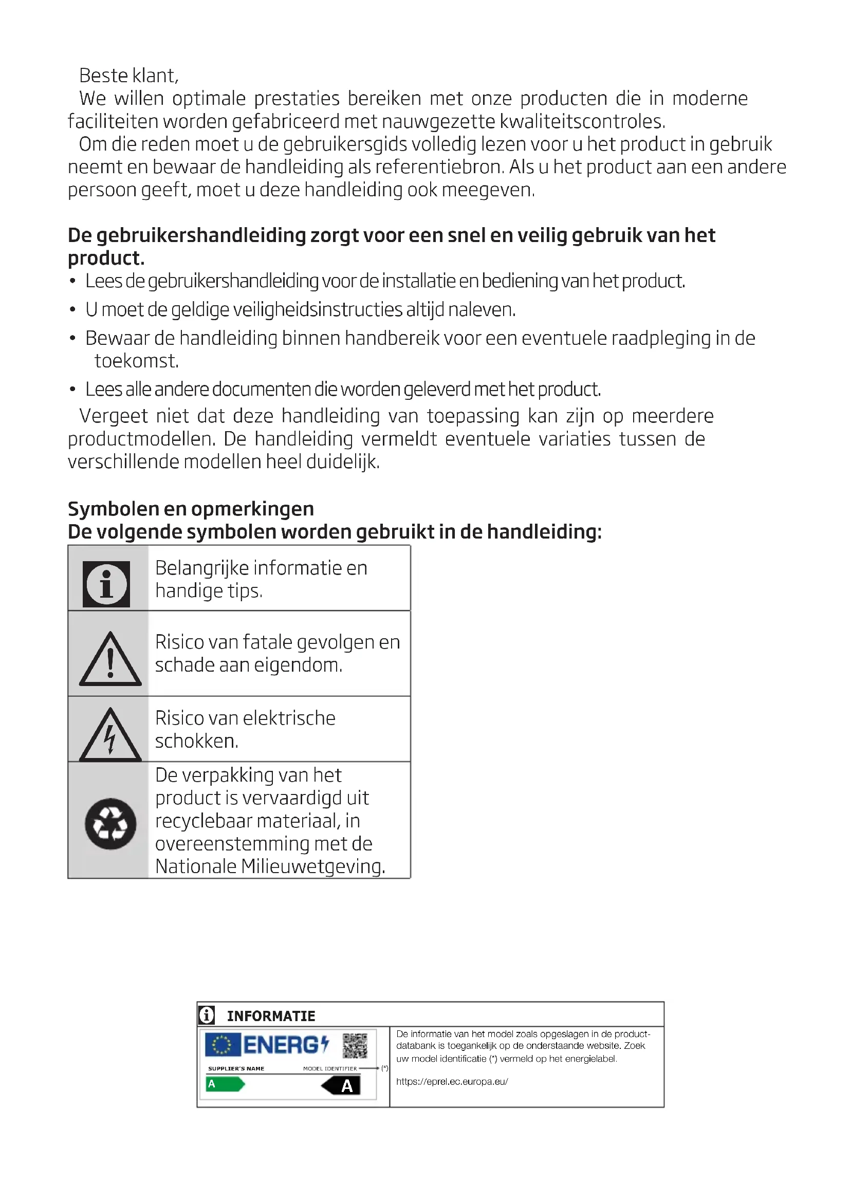 - Bewaar de handleiding binnen handbereik voor een eventuele raadpleging in de toekomst.