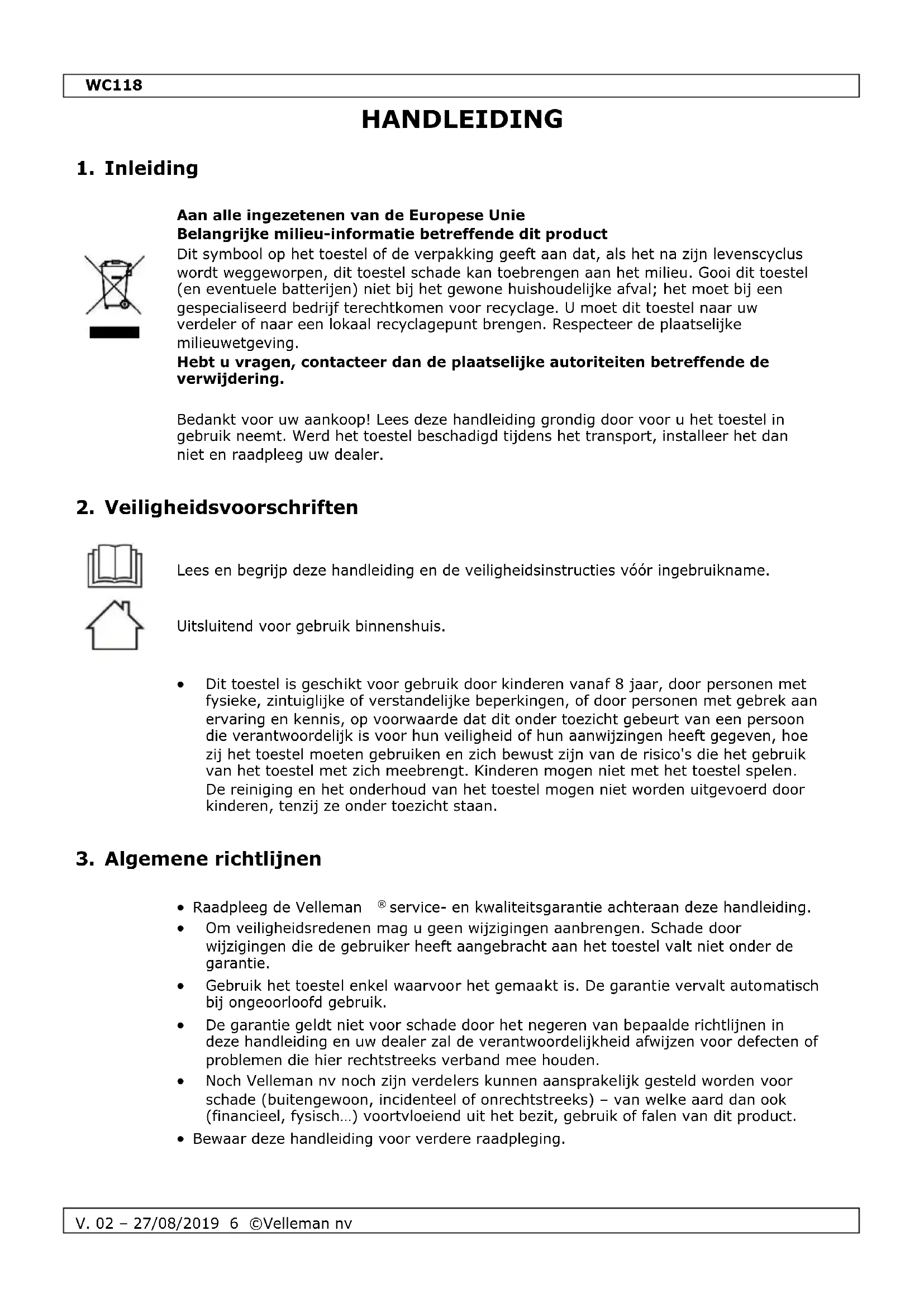 Velleman nv heeft het auteursrecht voor deze handleiding. Alle wereldwijde rechten voorbehouden. Het is niet toegestaan om deze handleiding of gedeelten ervan over te nemen, te kopiëren, te vertalen, te bewerken en op te slaan op een elektronisch medium zonder voorafgaande schriftelijke toestemming van de rechthebbende.WC118