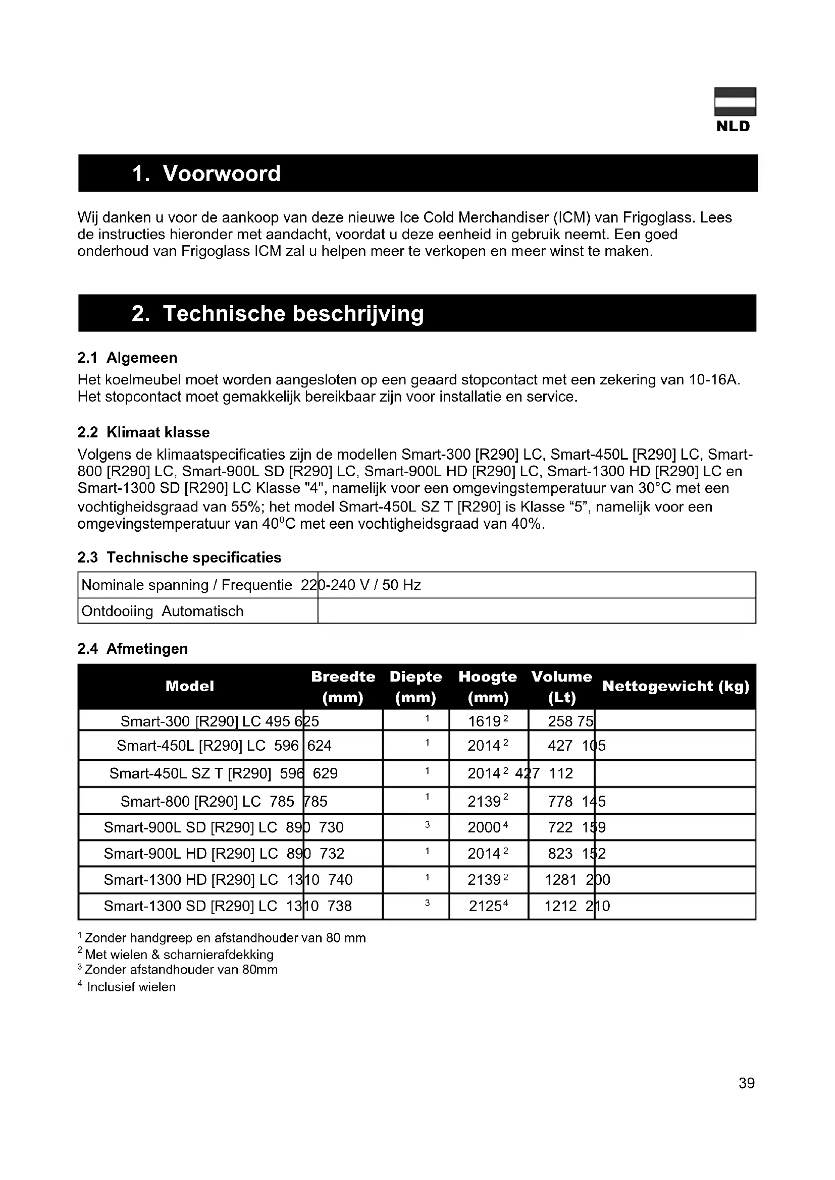 Volgens de klimaatspecificaties zijn de modellen Smart-300 [R290] LC, Smart-450L [R290] LC, Smart- 800 [R290] LC, Smart-900L SD [R290] LC, Smart-900L HD [R290] LC, Smart-1300 HD [R290] LC en Smart-1300 SD [R290] LC Klasse "4", namelijk voor een omgevingstemperatuur van 30°C met een vochtigheidsgraad van 55%; het model Smart-450L SZ T [R290] is Klasse “5”, namelijk voor een omgevingstemperatuur van 40⁰C met een vochtigheidsgraad van 40%.