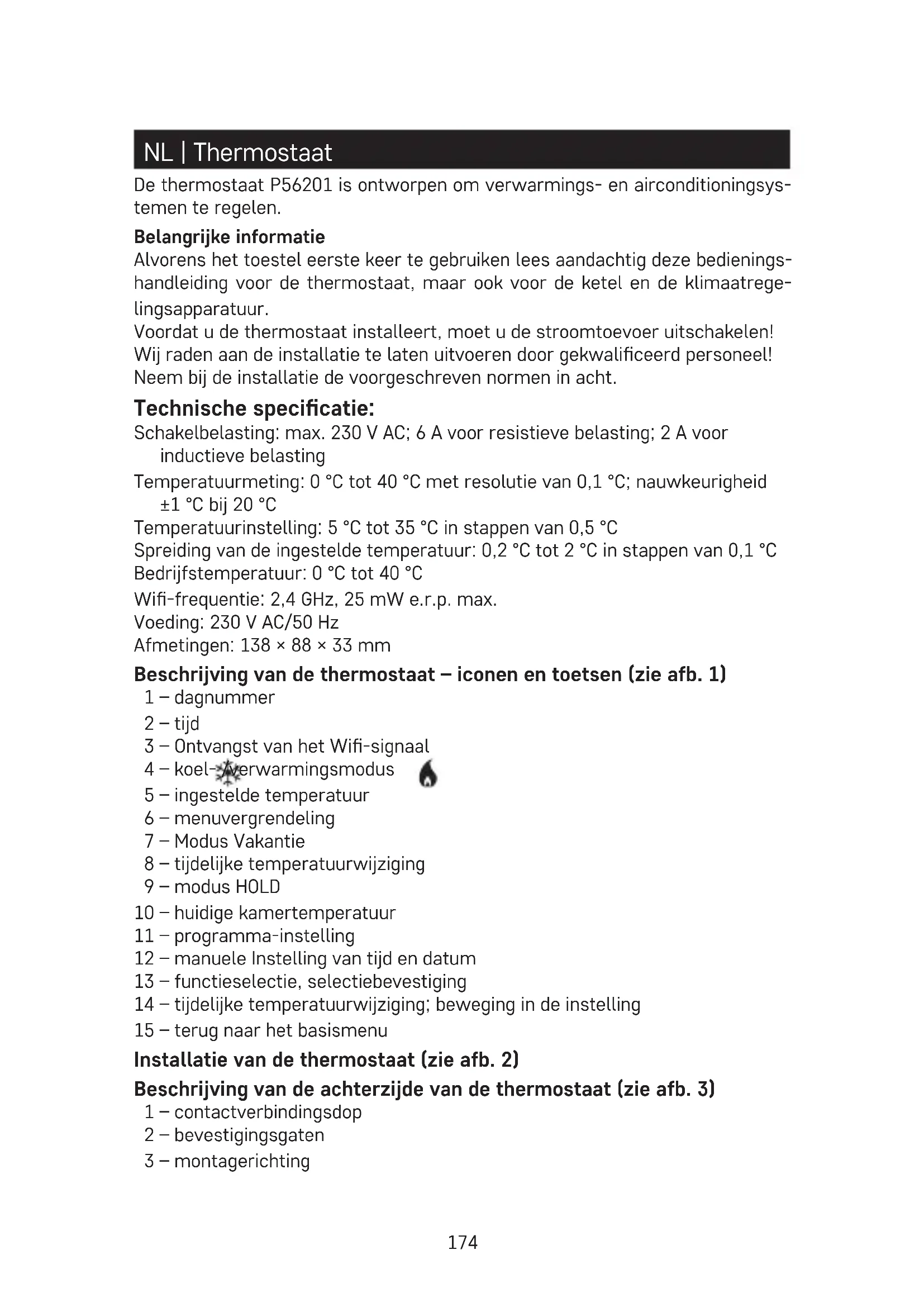 - Este aparato no está diseñado para su uso por niños u otras personas cuya capacidad física, sensorial o mental, o su experiencia y conocimientos, no sean sucientes para utilizar el aparato de forma segura, a menos que lo hagan bajo supervisión o tras recibir instrucciones sobre el uso adecuado del aparato por parte del responsable de su seguridad. Es importante controlar que los niños no jueguen con el aparato. ADVERTENCIA: El contenido de este manual puede ser modicado sin previo aviso. Debido a limitaciones de la impresión, los símbolos del manual pueden variar ligeramente de los que se visualizan en la pantalla. El contenido de este manual no puede reproducirse sin previo consentimiento del fabricante. No las elimine con la basura doméstica. Utilice puntos de recolección especiales para los residuos clasicados. Póngase en contacto con las autoridades locales para obtener información sobre los puntos de recogi- da. Si los dispositivos electrónicos se eliminan en un vertedero, las sus- tancias peligrosas pueden llegar a las aguas subterráneas y, por consiguiente, a los alimentos en la cadena, donde podría afectar a la salud humana. Por la presente, EMOS spol. s r. o. declara que el equipo de radio tipo P56201 cumple con la Directiva 2014/53/EU. El texto completo de la declaración de conformidad de la UE está disponible en la siguiente dirección de Internet: http://www.emos.eu/download.174 NL | Thermostaat De thermostaat P56201 is ontworpen om verwarmings- en airconditioningsys- temen te regelen. Belangrijke informatie Alvorens het toestel eerste keer te gebruiken lees aandachtig deze bedienings- handleiding voor de thermostaat, maar ook voor de ketel en de klimaatrege- lingsapparatuur. Voordat u de thermostaat installeert, moet u de stroomtoevoer uitschakelen! Wij raden aan de installatie te laten uitvoeren door gekwaliceerd personeel! Neem bij de installatie de voorgeschreven normen in acht. Technische specicatie: Schakelbelasting: max. 230 V AC; 6 A voor resistieve belasting; 2 A voor inductieve belasting Temperatuurmeting: 0 °C tot 40 °C met resolutie van 0,1 °C; nauwkeurigheid ±1 °C bij 20 °C Temperatuurinstelling: 5 °C tot 35 °C in stappen van 0,5 °C Spreiding van de ingestelde temperatuur: 0,2 °C tot 2 °C in stappen van 0,1 °C Bedrijfstemperatuur: 0 °C tot 40 °C Wi-frequentie: 2,4 GHz, 25 mW e.r.p. max. Voeding: 230 V AC/50 Hz Afmetingen: 138 × 88 × 33 mm Beschrijving van de thermostaat – iconen en toetsen (zie afb. 1) 1 – dagnummer 2 – tijd 3 – Ontvangst van het Wi-signaal 4 – koel- /verwarmingsmodus 5 – ingestelde temperatuur 6 – menuvergrendeling 7 – Modus Vakantie 8 – tijdelijke temperatuurwijziging 9 – modus HOLD 10 – huidige kamertemperatuur 11 – programma-instelling 12 – manuele Instelling van tijd en datum 13 – functieselectie, selectiebevestiging 14 – tijdelijke temperatuurwijziging; beweging in de instelling 15 – terug naar het basismenu Installatie van de thermostaat (zie afb. 2) Beschrijving van de achterzijde van de thermostaat (zie afb. 3) 1 – contactverbindingsdop 2 – bevestigingsgaten 3 – montagerichting175 Mobiele applicatie U kunt de thermostaat bedienen met de mobiele app voor iOS of Android. Download de app „EMOS GoSmart“ voor uw toestel. QR-code om de Android-app te downloaden QR-code om de iOS-app te downloaden Beschrijving van de registratie en aanmelding bij de toepassing (zie afb. 4) Om de mobiele app te gebruiken, moet u zich eerst registreren door te klikken op de toets Registreer u. Voer uw land en e-mailadres in, vink de toestemming met de gebruikersovereen- komst aan en klik op Vericatiecode krijgen. Voer de vericatiecode in die gestuurd werd naar uw e-mailadres. Stel vervolgens een wachtwoord in voor uw account en klik op Gereed. Vink naar eigen inzicht de opties Gegevensanalyse/Personalisering aan en klik op Ga naar toepassing. Verbinding van de thermostaat met het wi-netwerk voor bediening via mobiele app (zie afb. 5) Druk lang op de toets gedurende ca. 5 seconden. Druk vervolgens de toets gedurende 3 seconden in. E2 wordt weergegeven en de icoon knippert. Klik in de app op Apparaat toevoegen, sta de toegang tot de positie toe. Kies het handmatige zoeken van het apparaat Kleine Huishoudelijke Apparaten – Thermostaat (Wi-Fi) of Overig – Overig (Wi-Fi). Selecteer het 2.4 GHz wi-netwerk, voer het wachtwoord in en klik op Volgende. Vink aan Bevestig, dat het lampje snel knippert en klik op Volgende. Binnen 2 minuten zal de app de geselecteerde thermostaat weergeven. Klik op de groene pijl aan de rechterkant, de thermostaat zal worden toegevoegd aan de app. Klik vervolgens op de thermostaaticoon in de app, het basis bedieningsmenu zal worden weergegeven. Opmerking: Als de koppeling van de thermostaat mislukt, herhaalt u de hele procedure opnieuw. 5 GHz wi-netwerk wordt niet ondersteund.176 Via de applicatie kan de thermostaat maximaal door 1 gebruiker tegelijkertijd worden bediend. Als een andere gebruiker de thermostaat wil bedienen, moet de vorige gebruiker uit de toepassing uitloggen. Beschrijving van het basismenu van de mobiele app Klik op de thermostaaticoon in de toepassing, het basisbedieningsmenu wordt weergegeven (zie afb. 6).